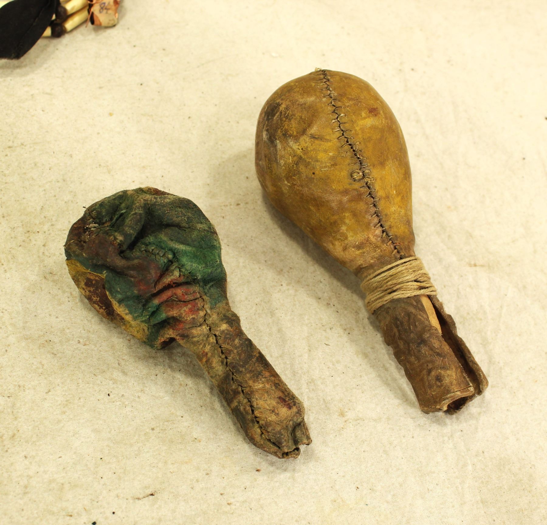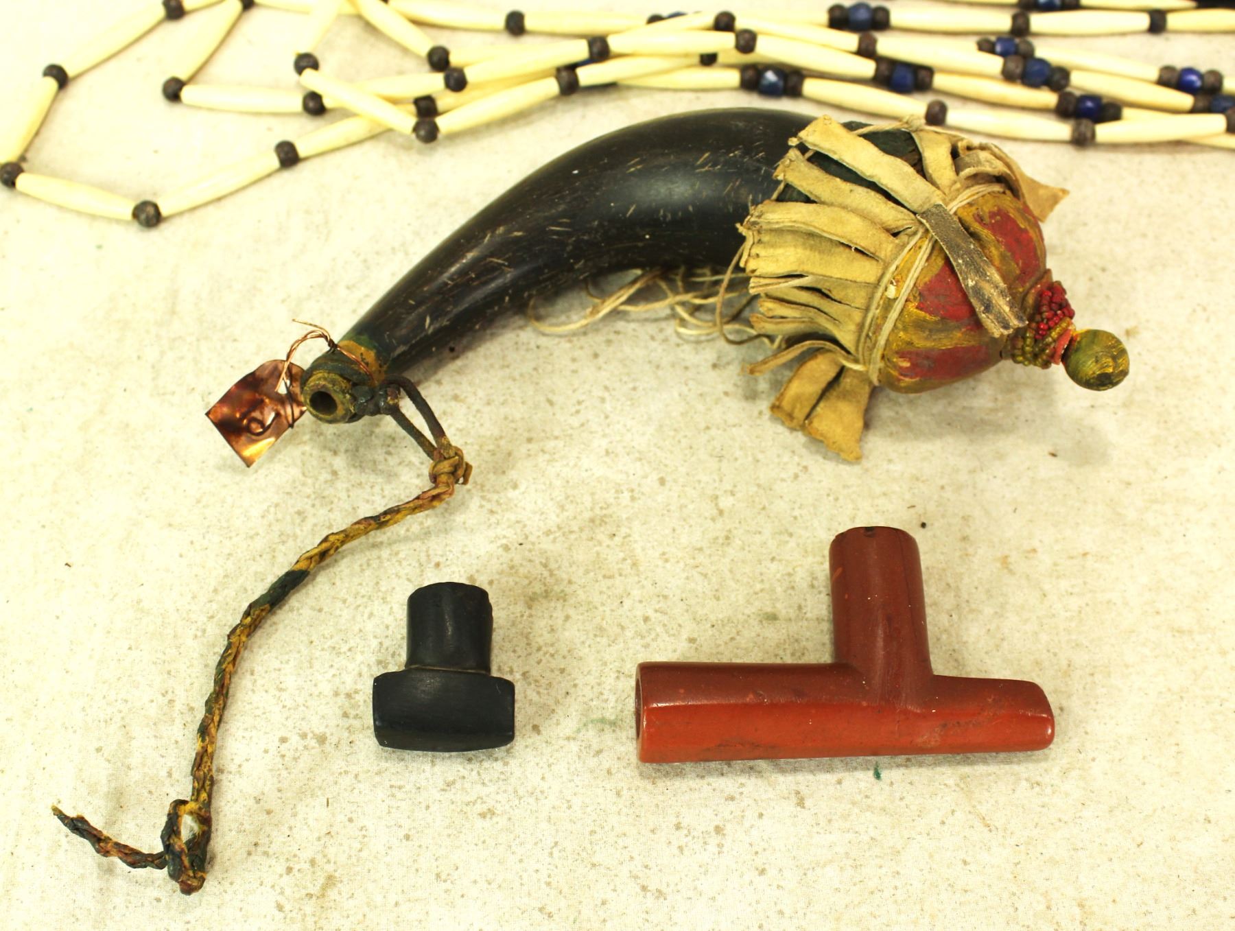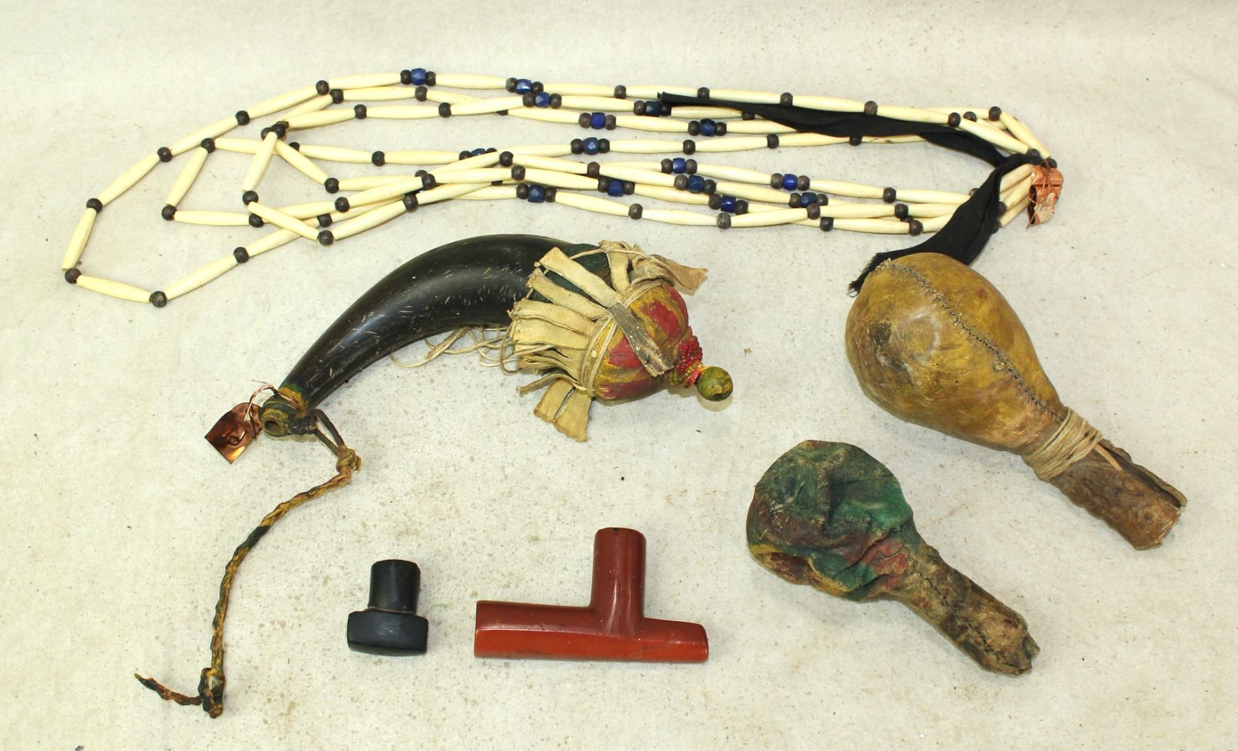 A nice grouping of early Northern Plains Indian items, that include a fur trade powder horn, heir bone necklace, two rawhide rattles, and two catlinite pipe bowls.