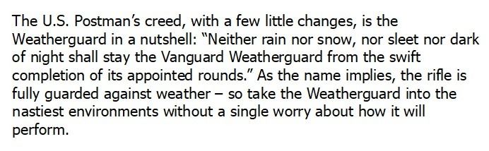 The U.S. Postman's creed with a few little changes is the Weatherguard in a nutshell: Neither rain nor snow nor sleet nor dark of night shall stay the Vanguard Weatherguard from the swift completion of its appointed rounds. As the name implies the rifle is fully guarded against weather so take the Weatherguard into the nastiest environments without a single worry about how it will perform. The Monte Carlo stock is made of ultra-tough Griptonite and all the metalwork has maximum protection with a great-looking Cerakote finish. Now go deliver some heat.