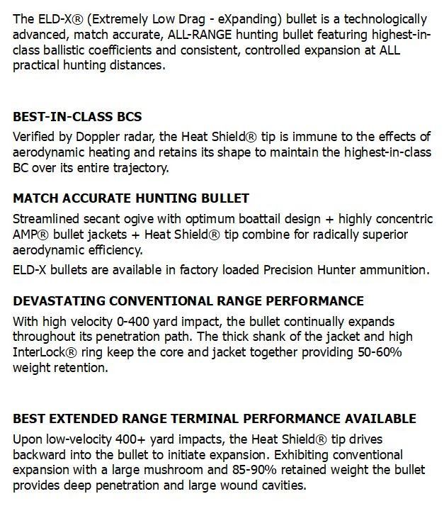 The ELD-X® (Extremely Low Drag - eXpanding) bullet is a technologically advanced, match accurate, ALL-RANGE hunting bullet featuring highest-in-class ballistic coefficients and consistent, controlled expansion at ALL practical hunting distances.