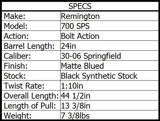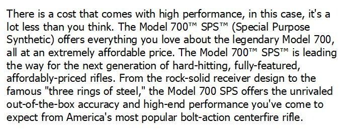There is a cost that comes with high performance, in this case, it's a lot less than you think. The Model 700™ SPS™ (Special Purpose Synthetic) offers everything you love about the legendary Model 700, all at an extremely affordable price. The Model 700™ SPS™ is leading the way for the next generation of hard-hitting, fully-featured, affordably-priced rifles. From the rock-solid receiver design to the famous "three rings of steel," the Model 700 SPS offers the unrivaled out-of-the-box accuracy and high-end performance you've come to expect from America's most popular bolt-action centerfire rifle.