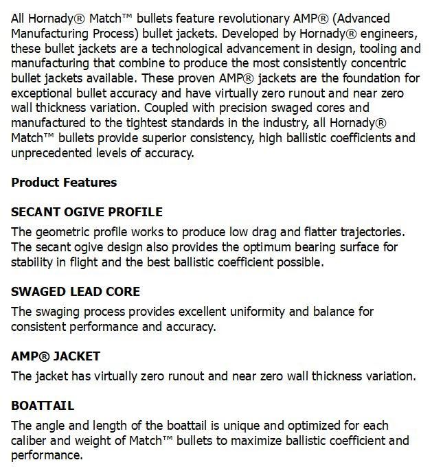 Hornady’s AMP Bullet Jackets (Advanced Manufacturing Process) offer the best ballistic coefficient possible. Profile delivers low drag and flat trajectories and swaged lead core provides uniformity and consistency for unmatched accuracy at long distances. *Match bullets are not recommended for hunting.