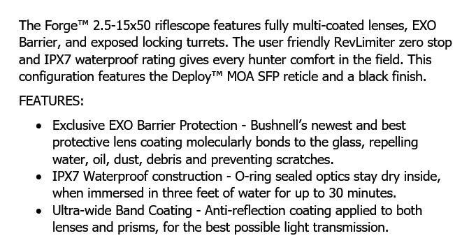 Bushnell Forge rifle scope. The Forge™ 2.5-15x50 riflescope features fully multi-coated lenses, EXO Barrier, and exposed locking turrets. The user friendly RevLimiter zero stop and IPX7 waterproof rating gives every hunter comfort in the field. This configuration features the Deploy™ MOA SFP and FFP reticle options in either a black or Terrain finish.
