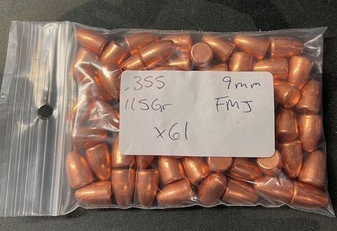 9mm 115gr .355in FMJ BRASS BULLETS - 1 bag of 61pcs