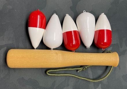 Hand crafted wooden fishing floats and fish bonker. Hand made with repurposed wood in the Kootenays.