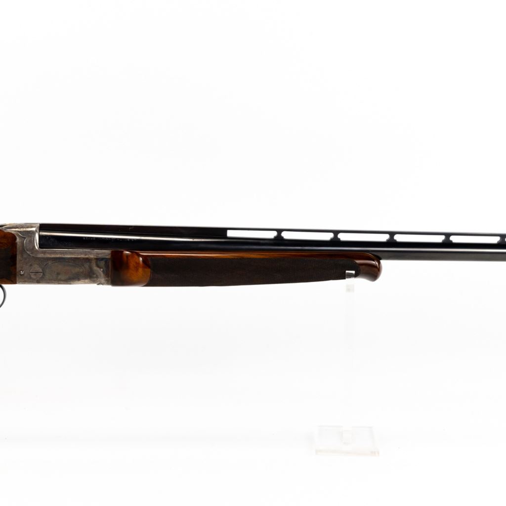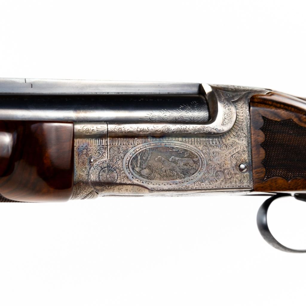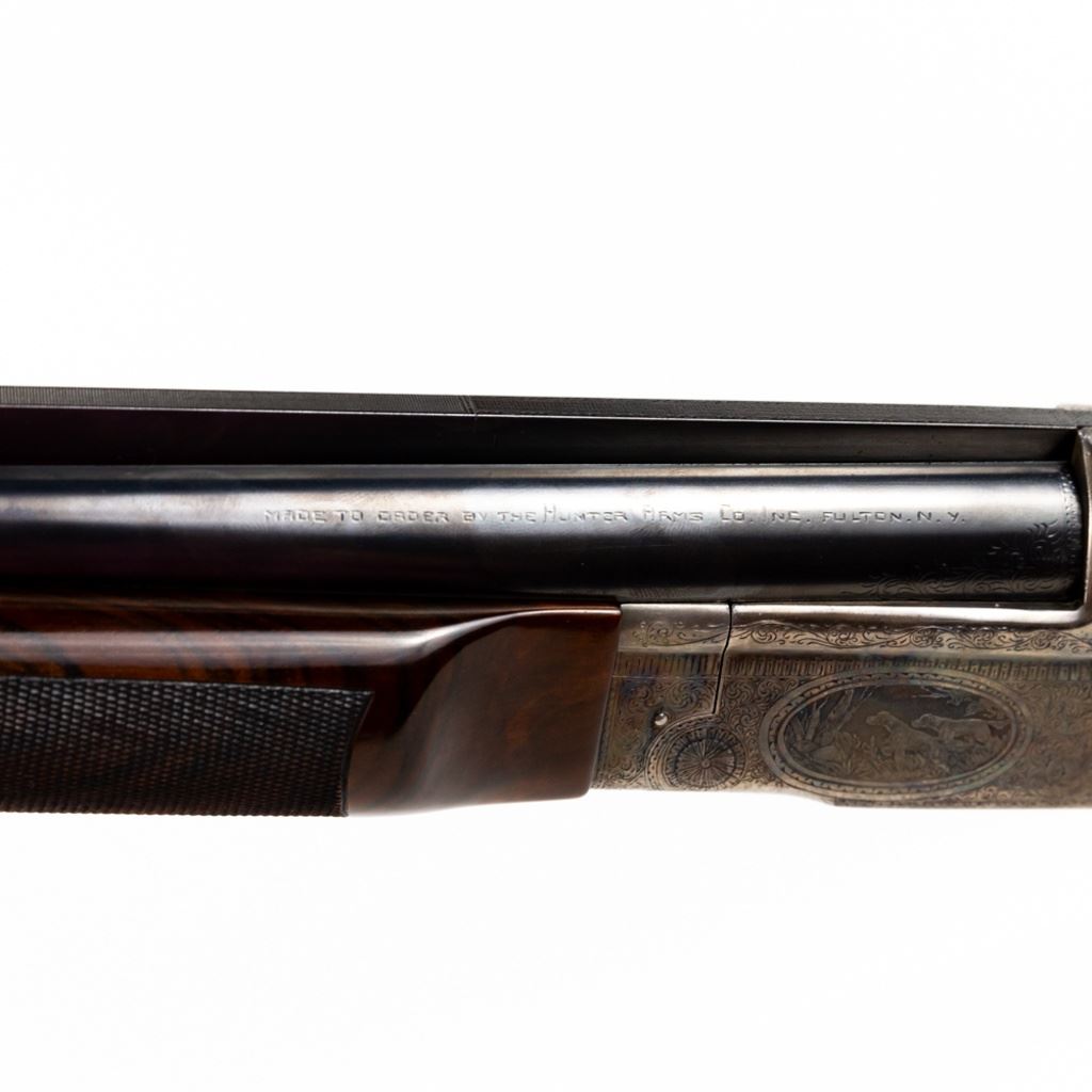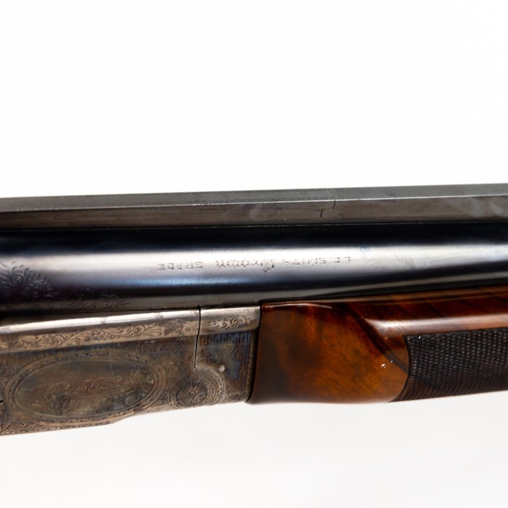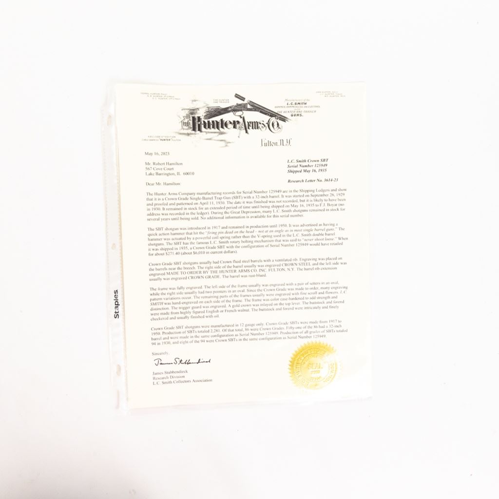 LC Smith CROWN Grade Single Barrel Trap (SBT) 12g 32" Shotgun in excellent condition with the lightest of wear. Comes with a FACTORY LETTER (Hunter Arms). ABSOLUTELY BEAUTIFUL!! Appears to be all original, NOT refinished! 90-95% original case hardening remaining on a receiver engraved with gorgeous hunting dogs and floral fine scroll work. There's engraving on the barrel and trigger guard. The oil finished English (High Grain) Walnut is LIKE NEW with exquisite fine checkering and a Schnabel finished beaver-tail forend! The 32" brilliant bore barrel has a ventilated rib with "ivory" bead and mid-bead. A GOLD CROWN is inlayed on the top lever. Leather capped recoil pad. Almost 100 year old, and almost like NEW. Soft case. MFG 1930 C&R Eligible S/N:125949