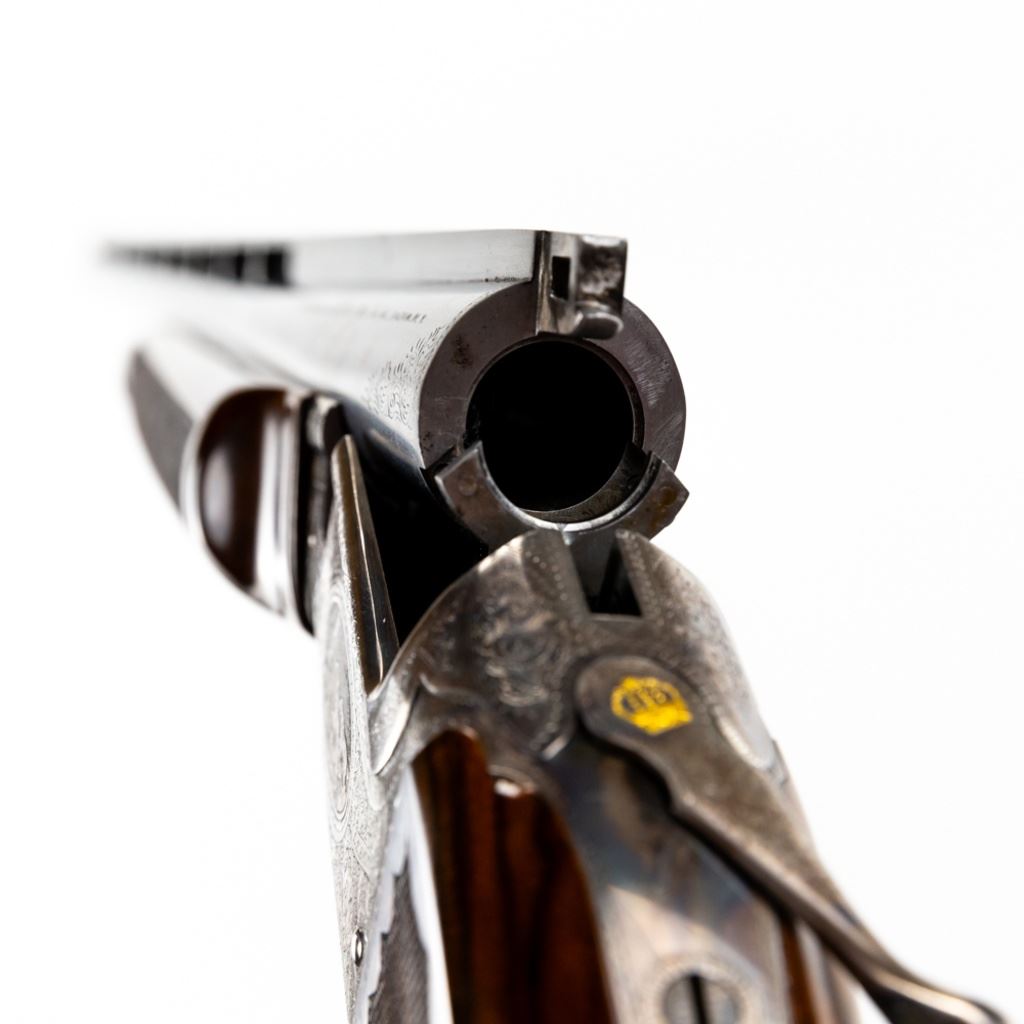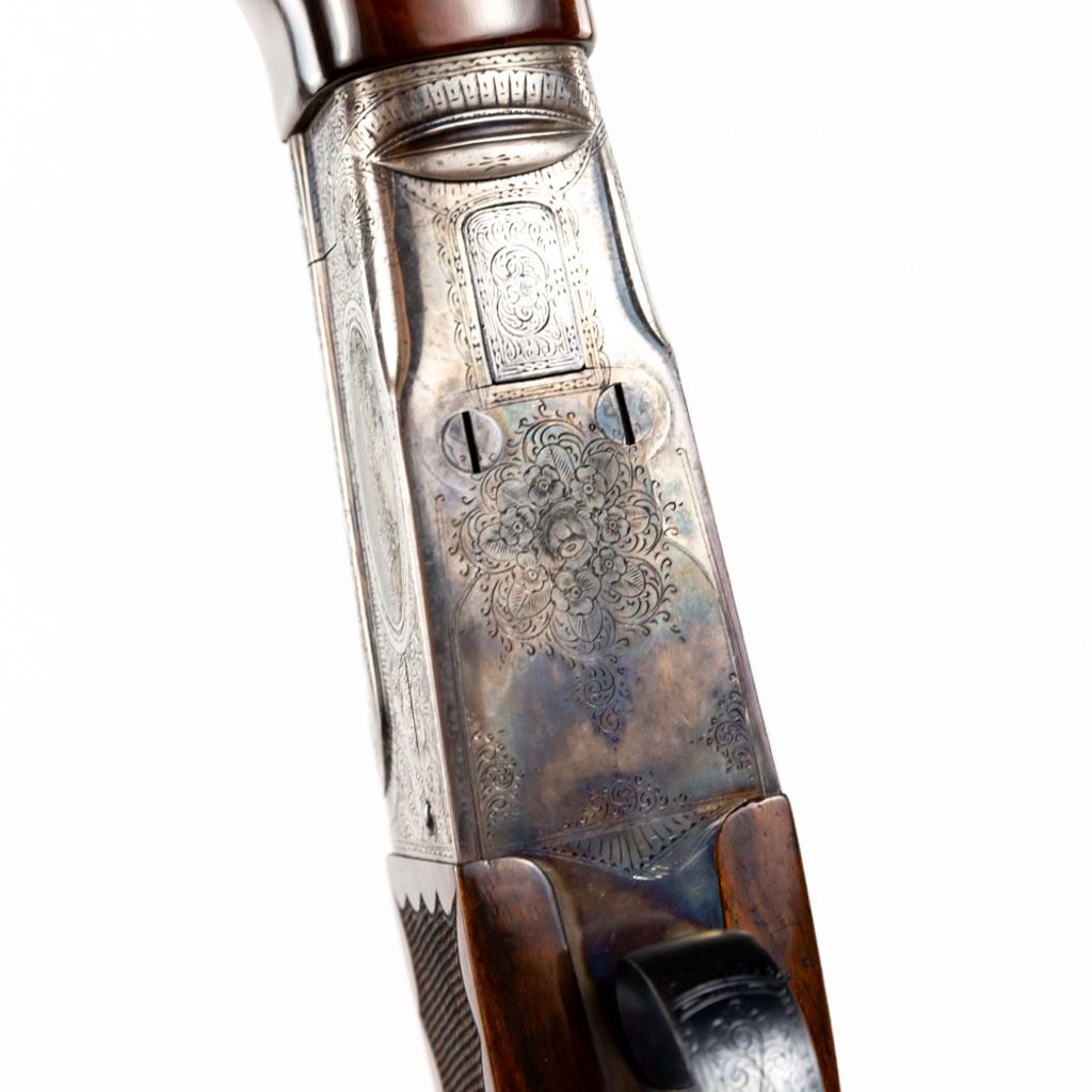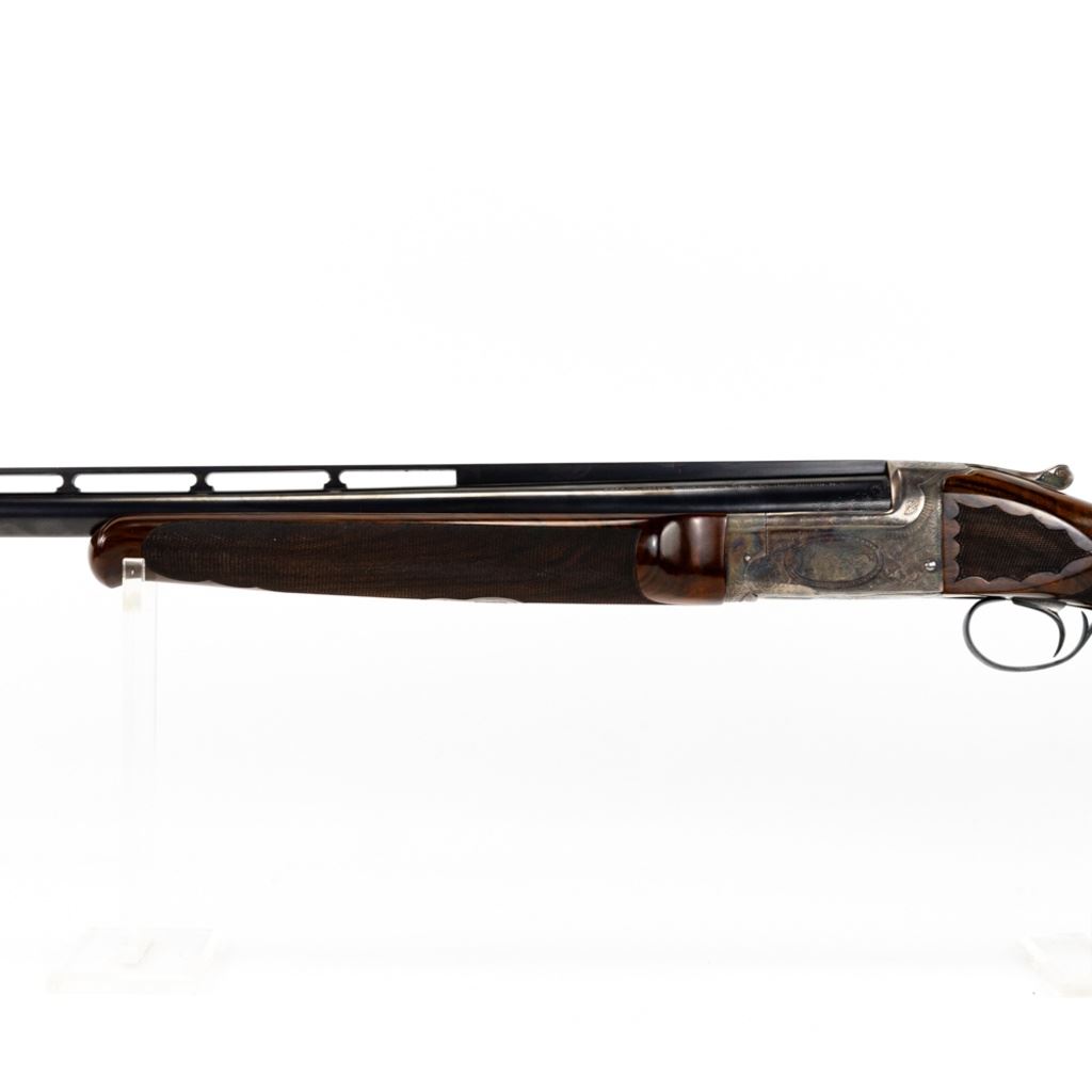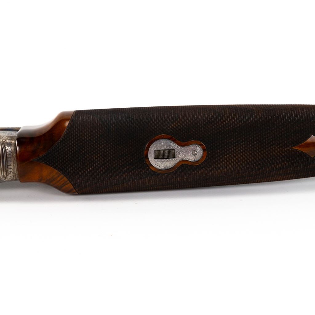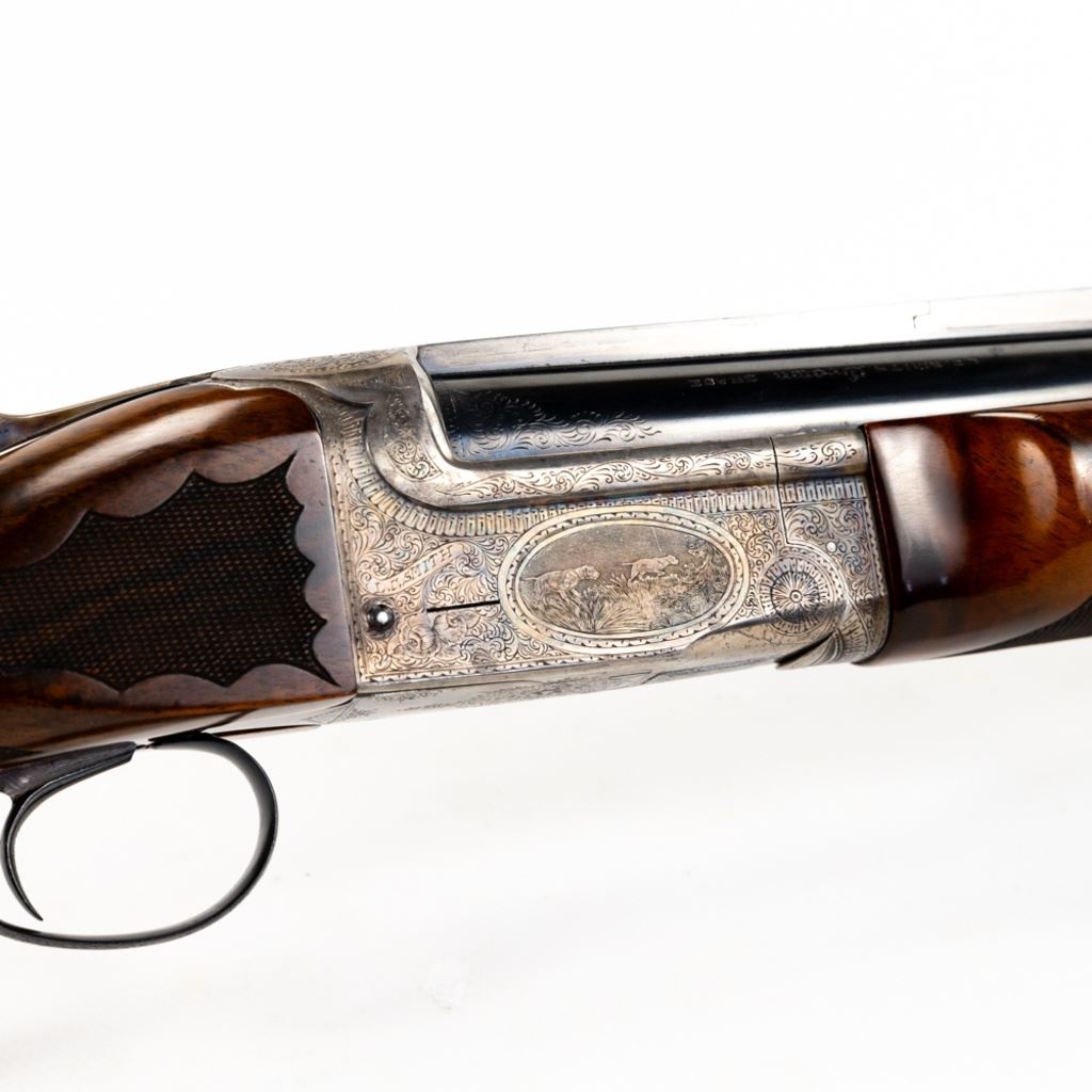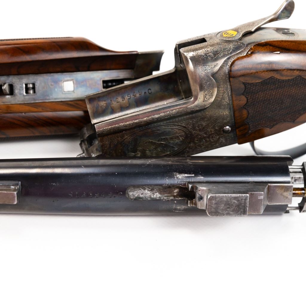 LC Smith CROWN Grade Single Barrel Trap (SBT) 12g 32" Shotgun in excellent condition with the lightest of wear. Comes with a FACTORY LETTER (Hunter Arms). ABSOLUTELY BEAUTIFUL!! Appears to be all original, NOT refinished! 90-95% original case hardening remaining on a receiver engraved with gorgeous hunting dogs and floral fine scroll work. There's engraving on the barrel and trigger guard. The oil finished English (High Grain) Walnut is LIKE NEW with exquisite fine checkering and a Schnabel finished beaver-tail forend! The 32" brilliant bore barrel has a ventilated rib with "ivory" bead and mid-bead. A GOLD CROWN is inlayed on the top lever. Leather capped recoil pad. Almost 100 year old, and almost like NEW. Soft case. MFG 1930 C&R Eligible S/N:125949