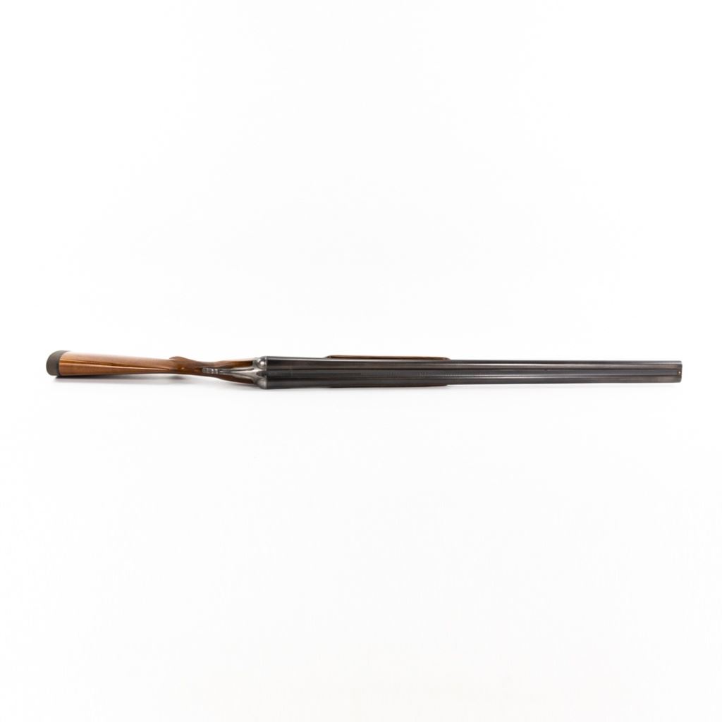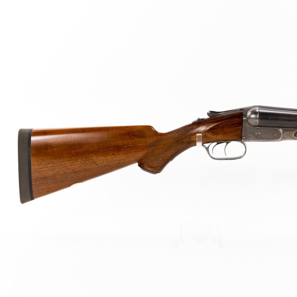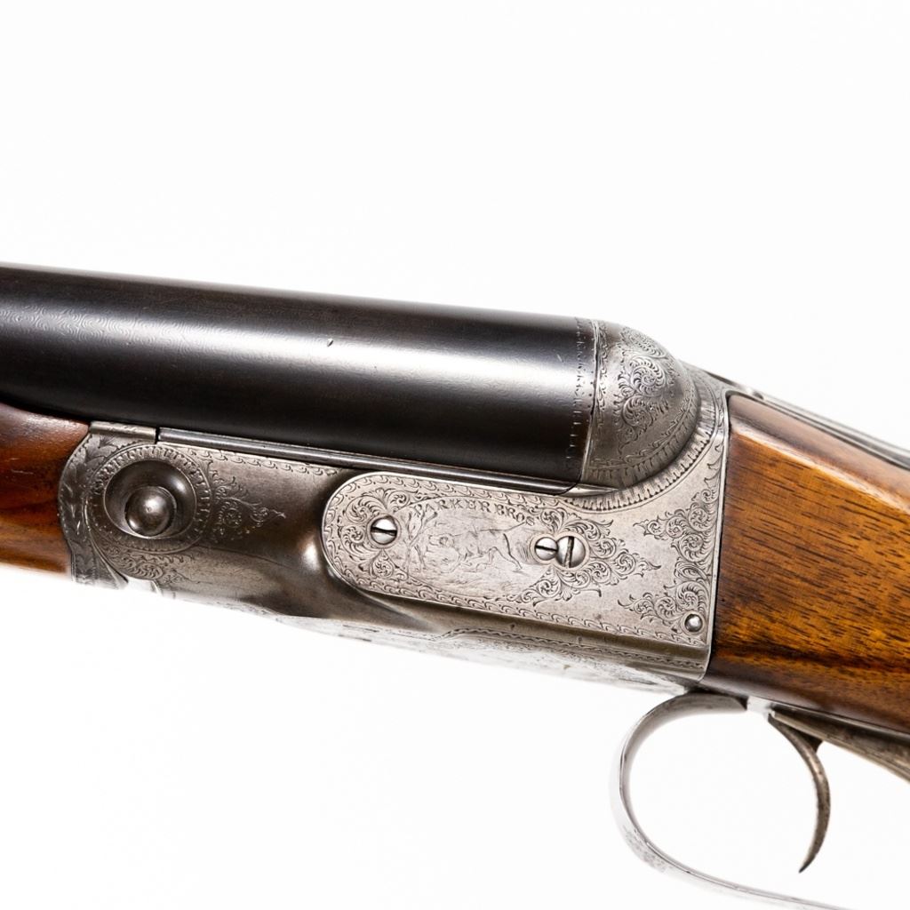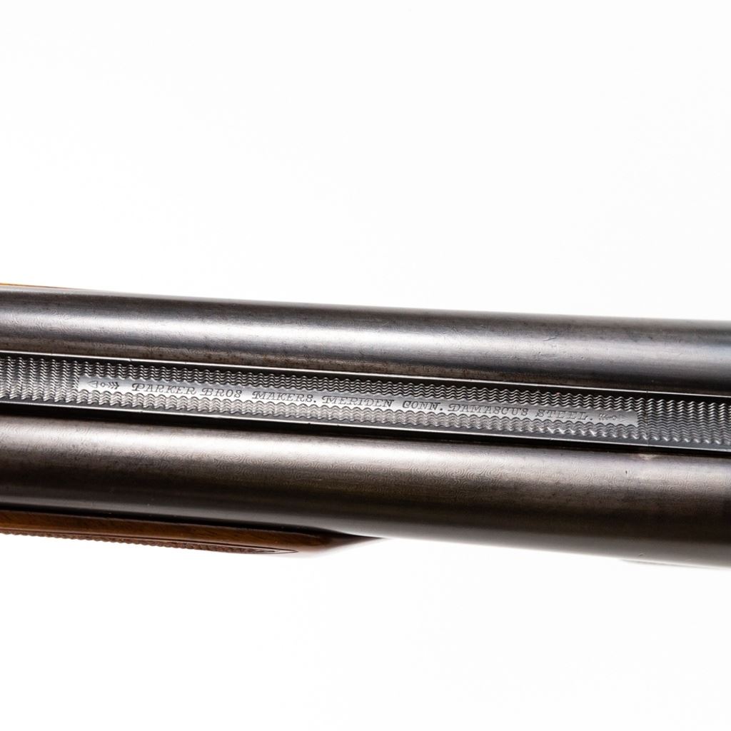 Parker D3 2-75" 12g 30" 14-1/8" LOP SXS Hammerless Extractor IC/IC Shotgun in very good condition with very minor wear and blemishes. Exquisite fine scroll engraving with pointers and marsh waterfowl scenes on the grey patina receiver with faint case hardening remaining. The re-blued Damascus barrels are just starting to patina and the beautiful wood was masterfully refinished. Stock has had a HiViz X-coil recoil pad fitted to it. The action is smooth, tight and seems fully functional - the bore is shiny with minute freckling at the muzzle. Capped pistol grip stock and double triggers. MFG 1888 C&R Eligible S/N: 55317