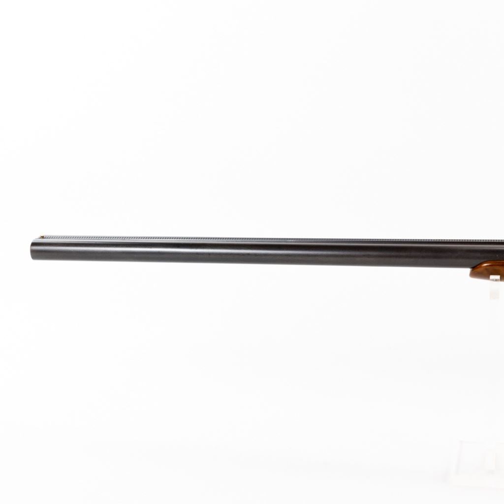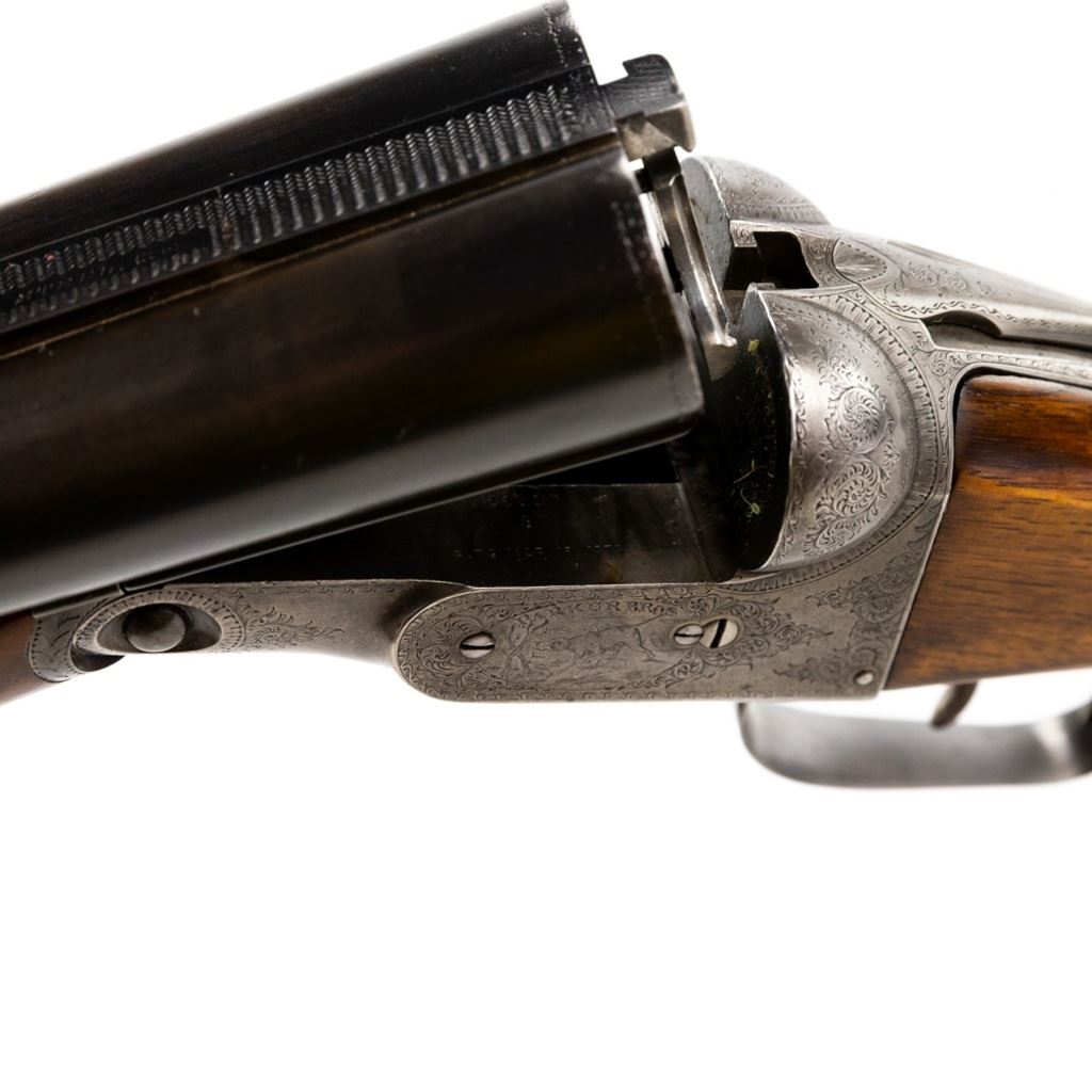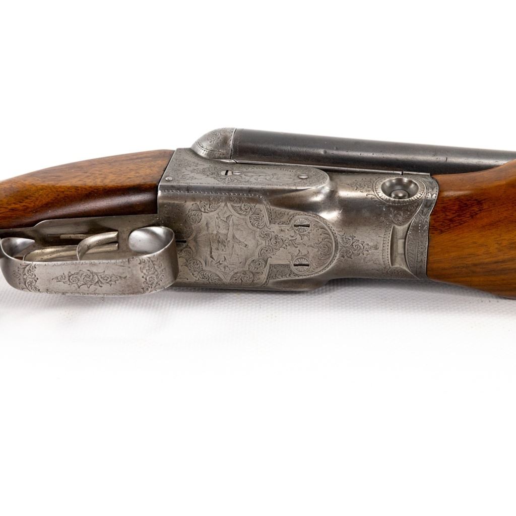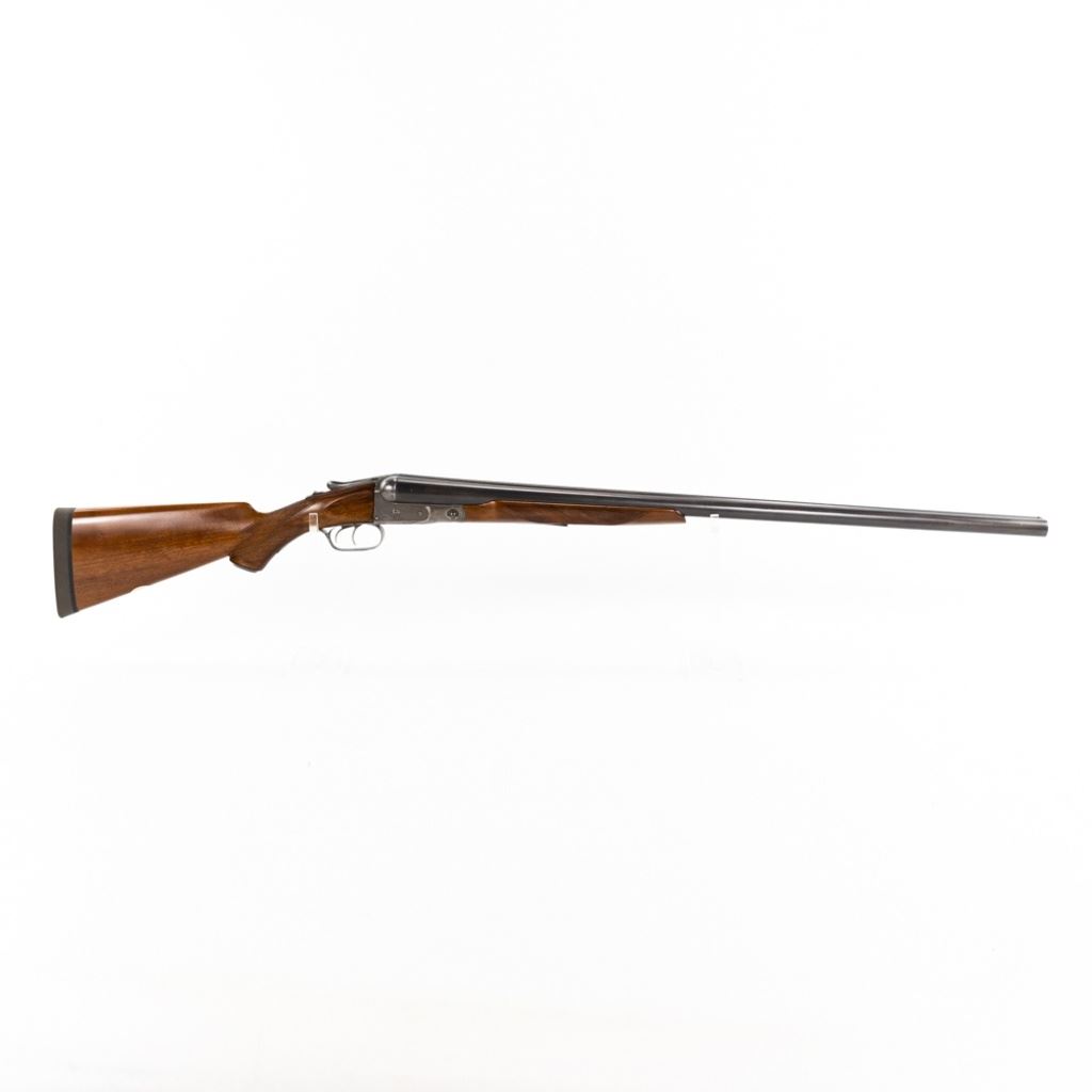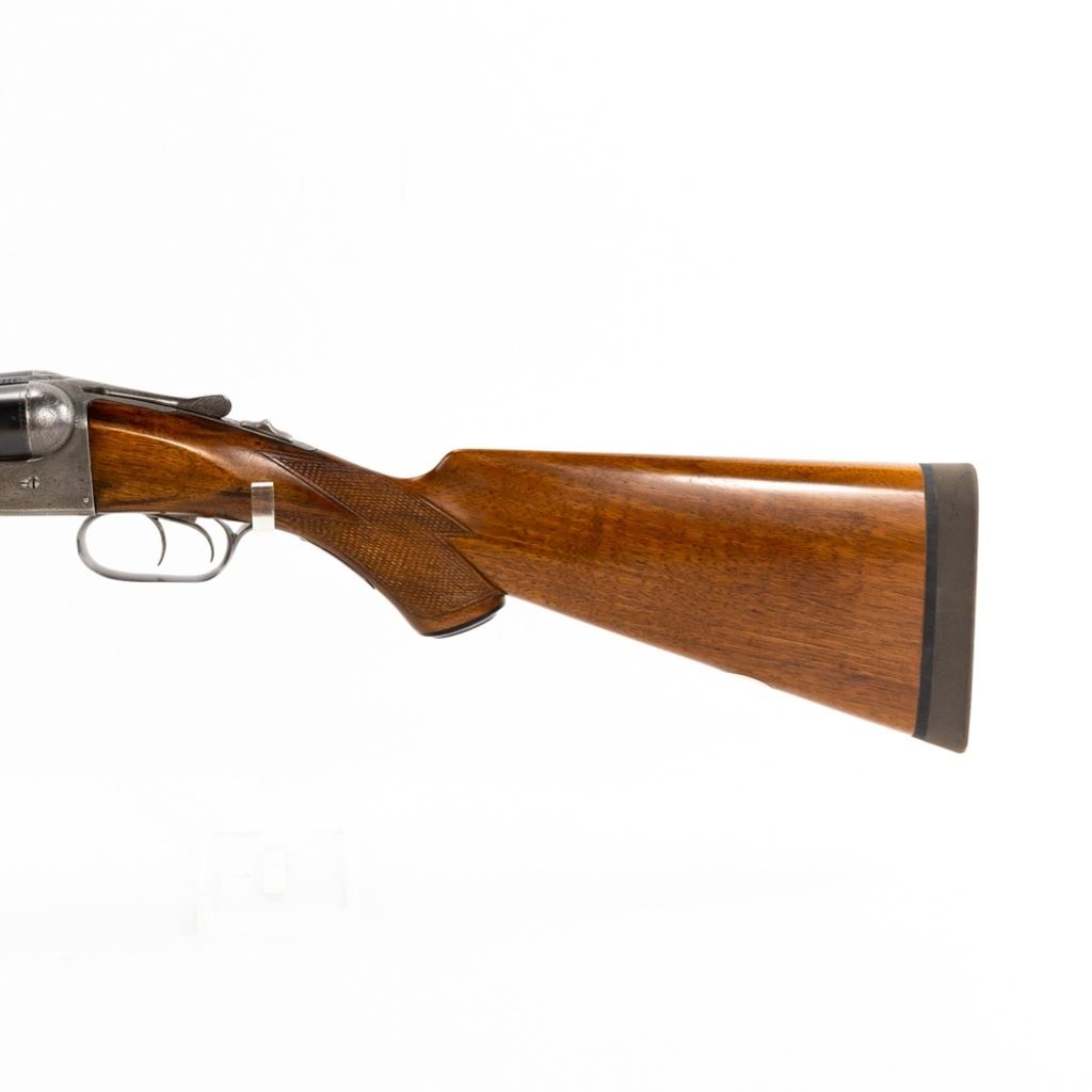 Parker D3 2-75" 12g 30" 14-1/8" LOP SXS Hammerless Extractor IC/IC Shotgun in very good condition with very minor wear and blemishes. Exquisite fine scroll engraving with pointers and marsh waterfowl scenes on the grey patina receiver with faint case hardening remaining. The re-blued Damascus barrels are just starting to patina and the beautiful wood was masterfully refinished. Stock has had a HiViz X-coil recoil pad fitted to it. The action is smooth, tight and seems fully functional - the bore is shiny with minute freckling at the muzzle. Capped pistol grip stock and double triggers. MFG 1888 C&R Eligible S/N: 55317
