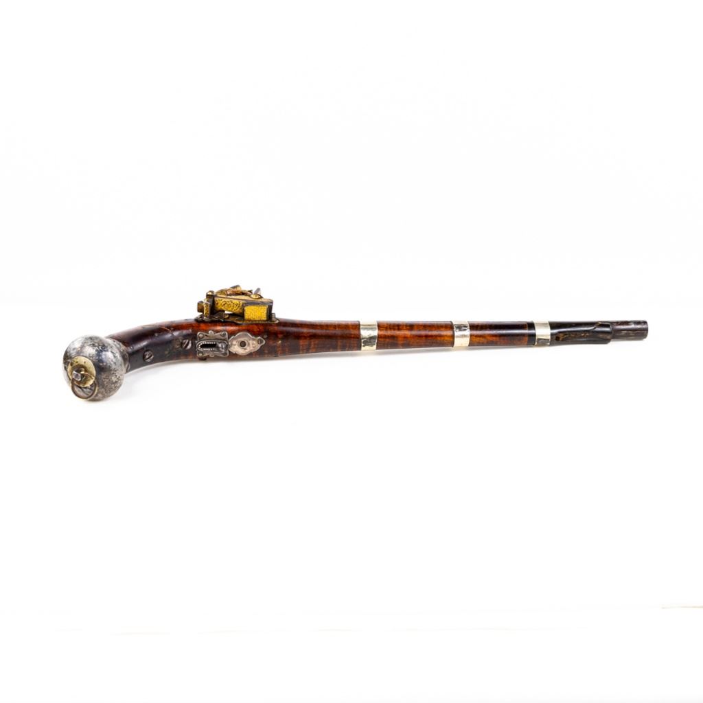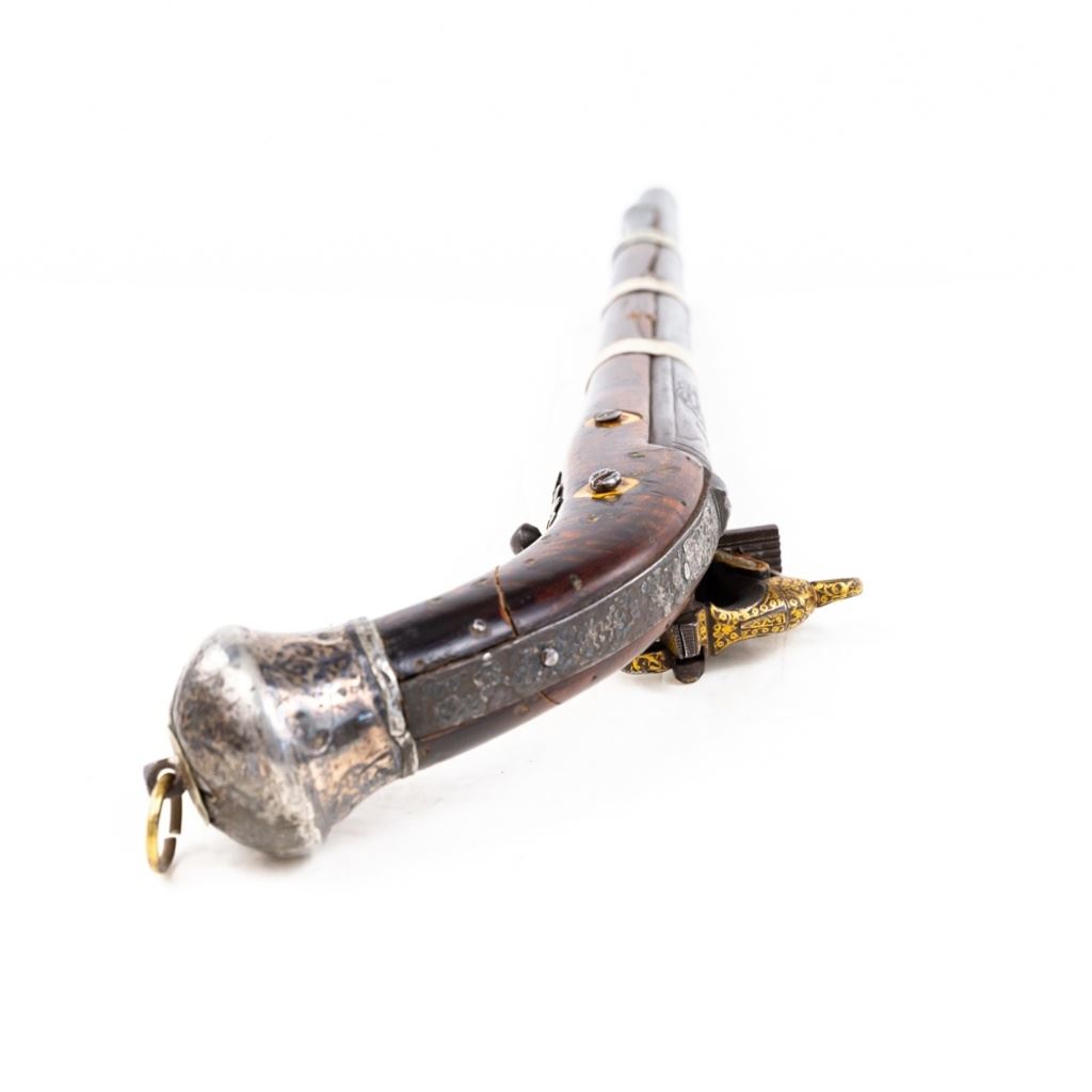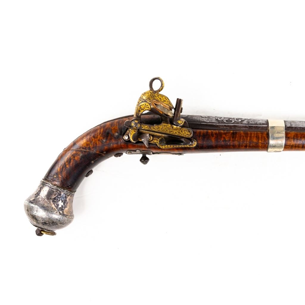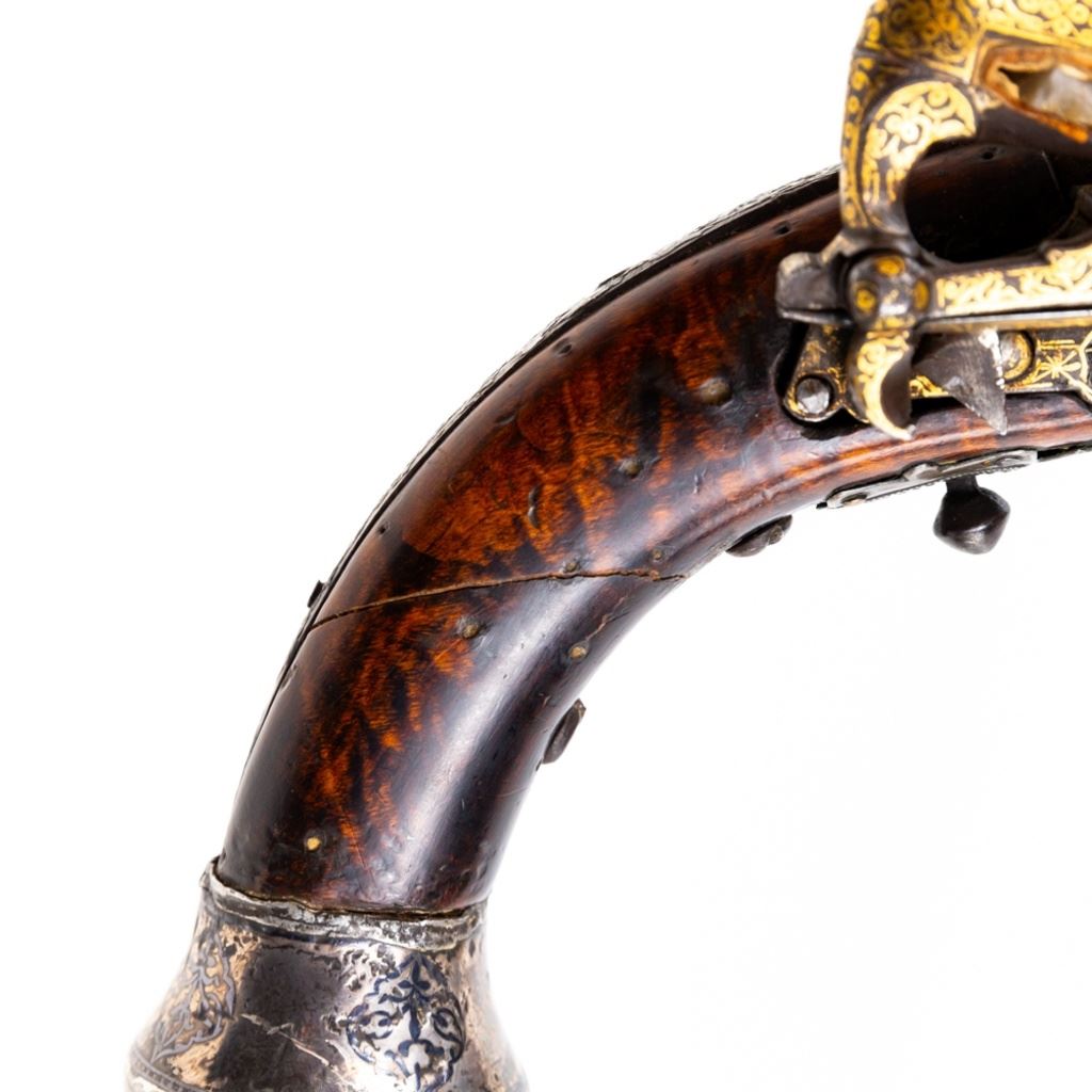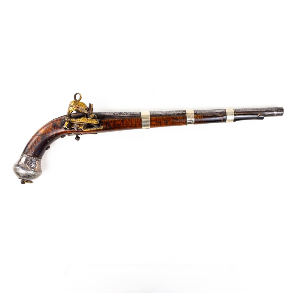 Believed to be a Russian (Caucasian) Antique Flintlock .60 14" Pistol in excellent antique condition. Possible manufactured in the late 1600's to the late 1700's. Very ornate gold inlays on the hammer and frizzen plate. silver barrel bands, trigger plates and butt knob and relief engraving on top of the barrel and back strap. Seems fully functional (though firing is not recommended).Striped wood with a crack at the grip. The only marking found is a horse in a square on top of the barrel.C&R Eligible S/N:nsn