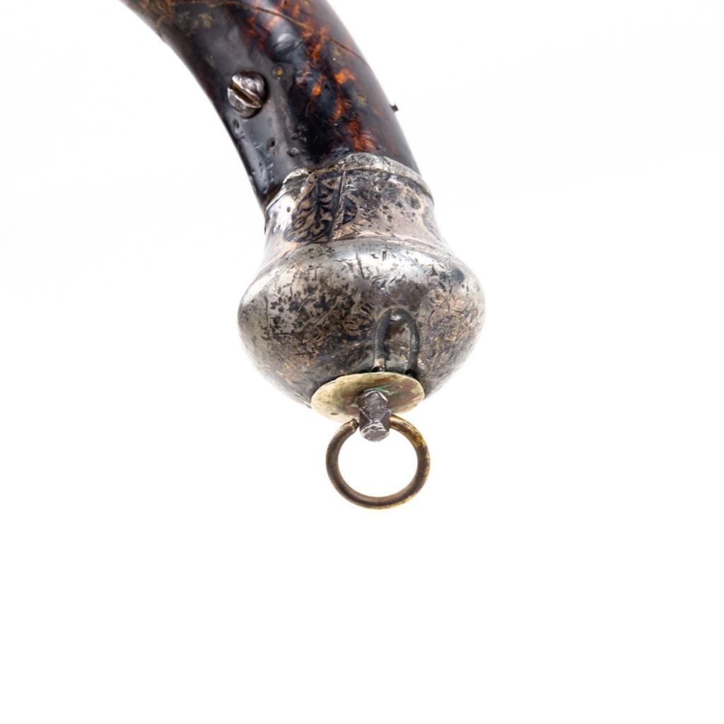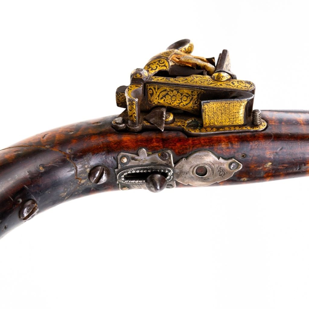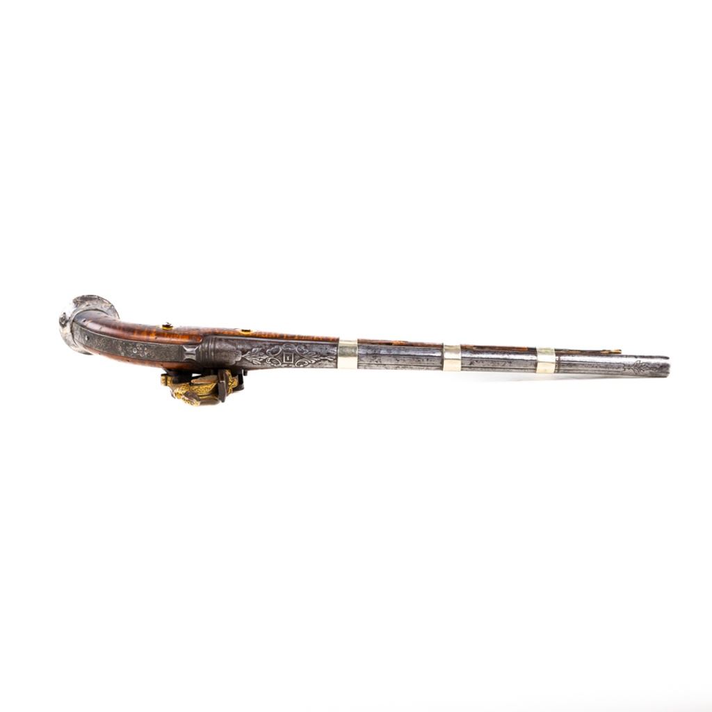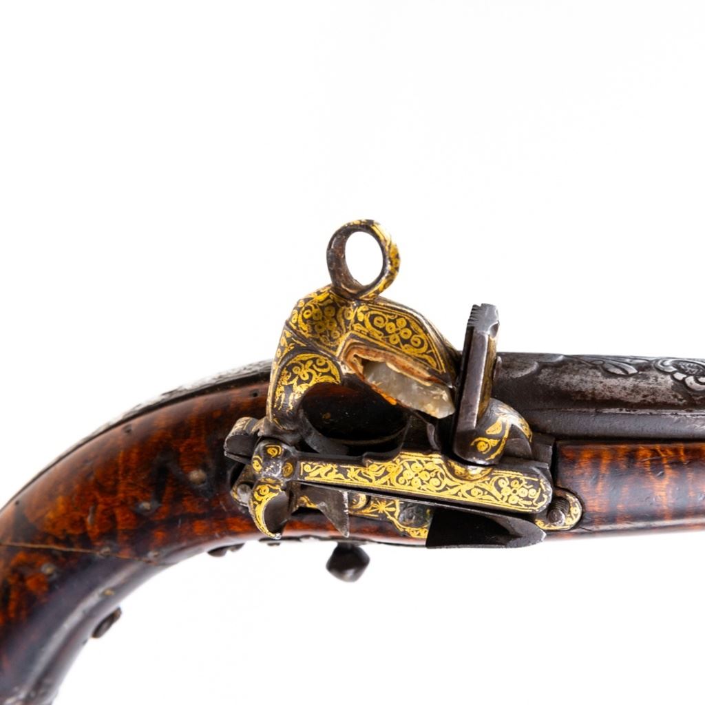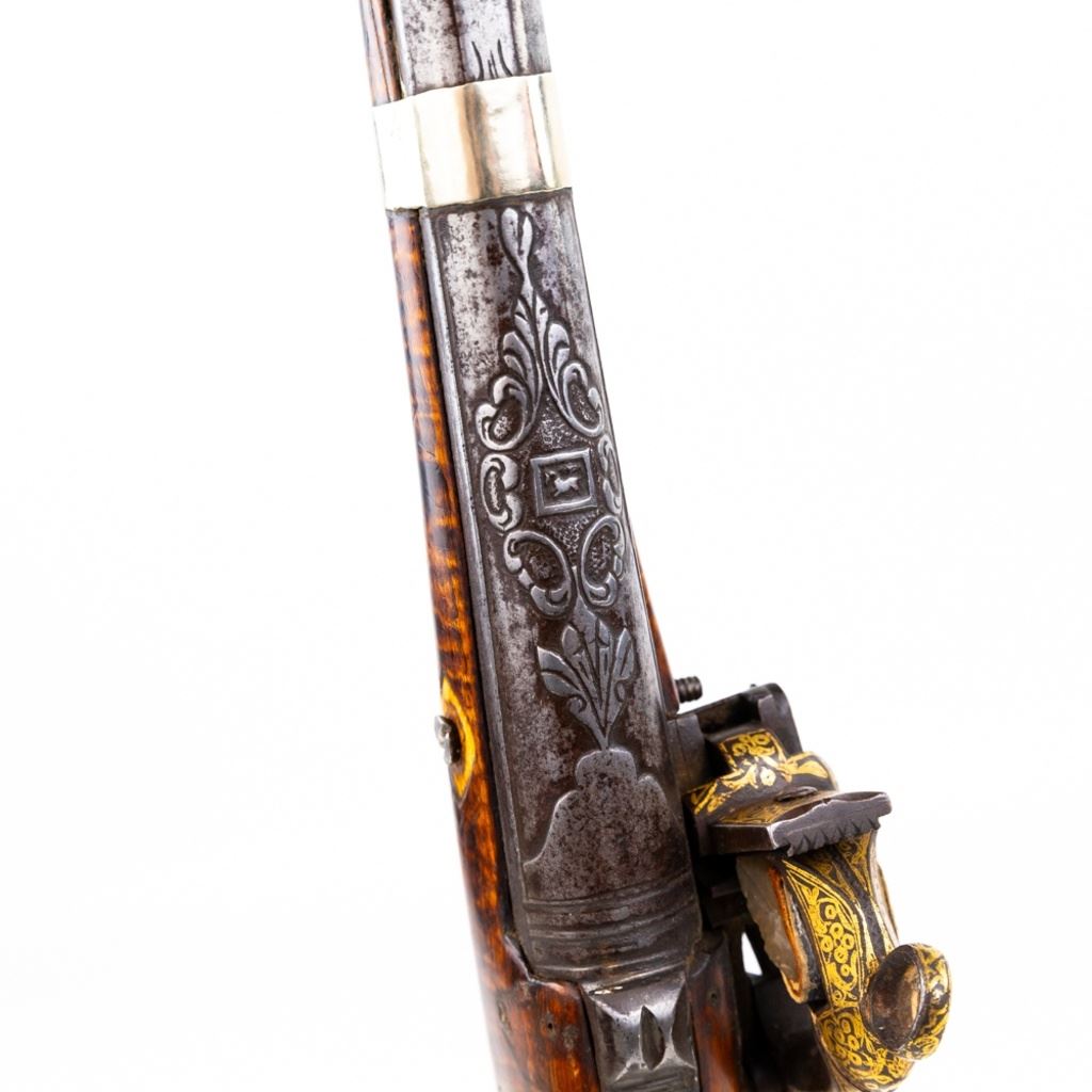 Believed to be a Russian (Caucasian) Antique Flintlock .60 14" Pistol in excellent antique condition. Possible manufactured in the late 1600's to the late 1700's. Very ornate gold inlays on the hammer and frizzen plate. silver barrel bands, trigger plates and butt knob and relief engraving on top of the barrel and back strap. Seems fully functional (though firing is not recommended).Striped wood with a crack at the grip. The only marking found is a horse in a square on top of the barrel.C&R Eligible S/N:nsn