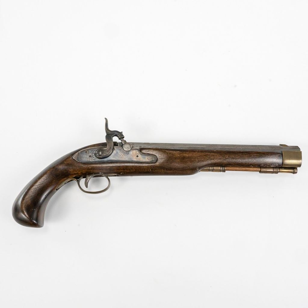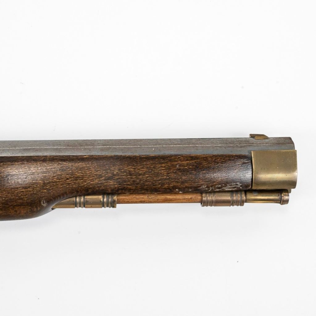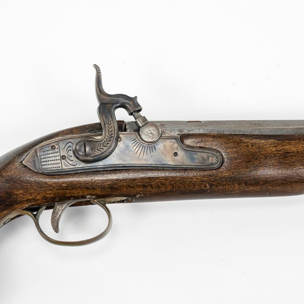 Unknown MFG Cap & Ball .45 10" Pistol in very good condition with handling wear and light oxidation in the bore. The barrel is in the white with speckles. C&R Eligible S/N:077955