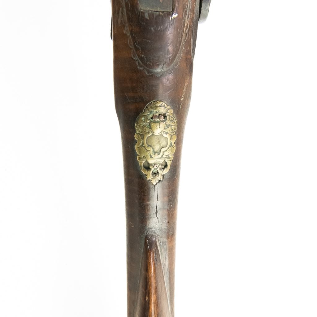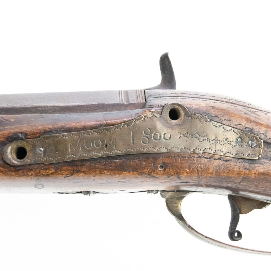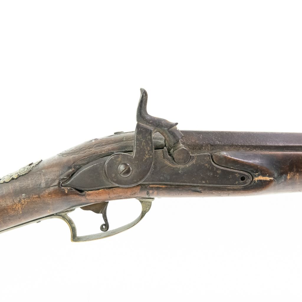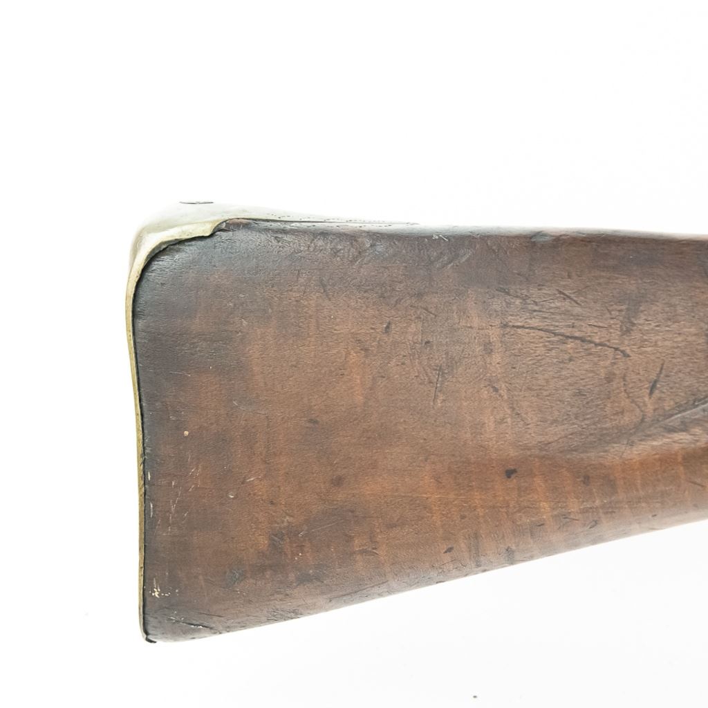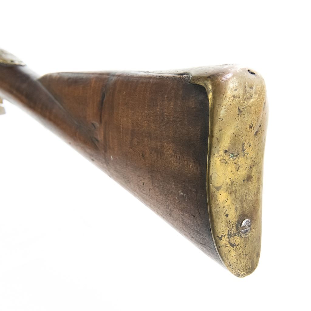 Unknown MFG .65 C&B Musket in good condition with wear. The bore is smooth with a coating of "orange". The converted (from flintlock) mechanism is inoperative. Appears mid to late 1700's. Beautiful brass crest on wrist. Some pieces are detached. Brass backing plate is stippled "H. Moon 1800". C&R Eligible S/N:nsn
