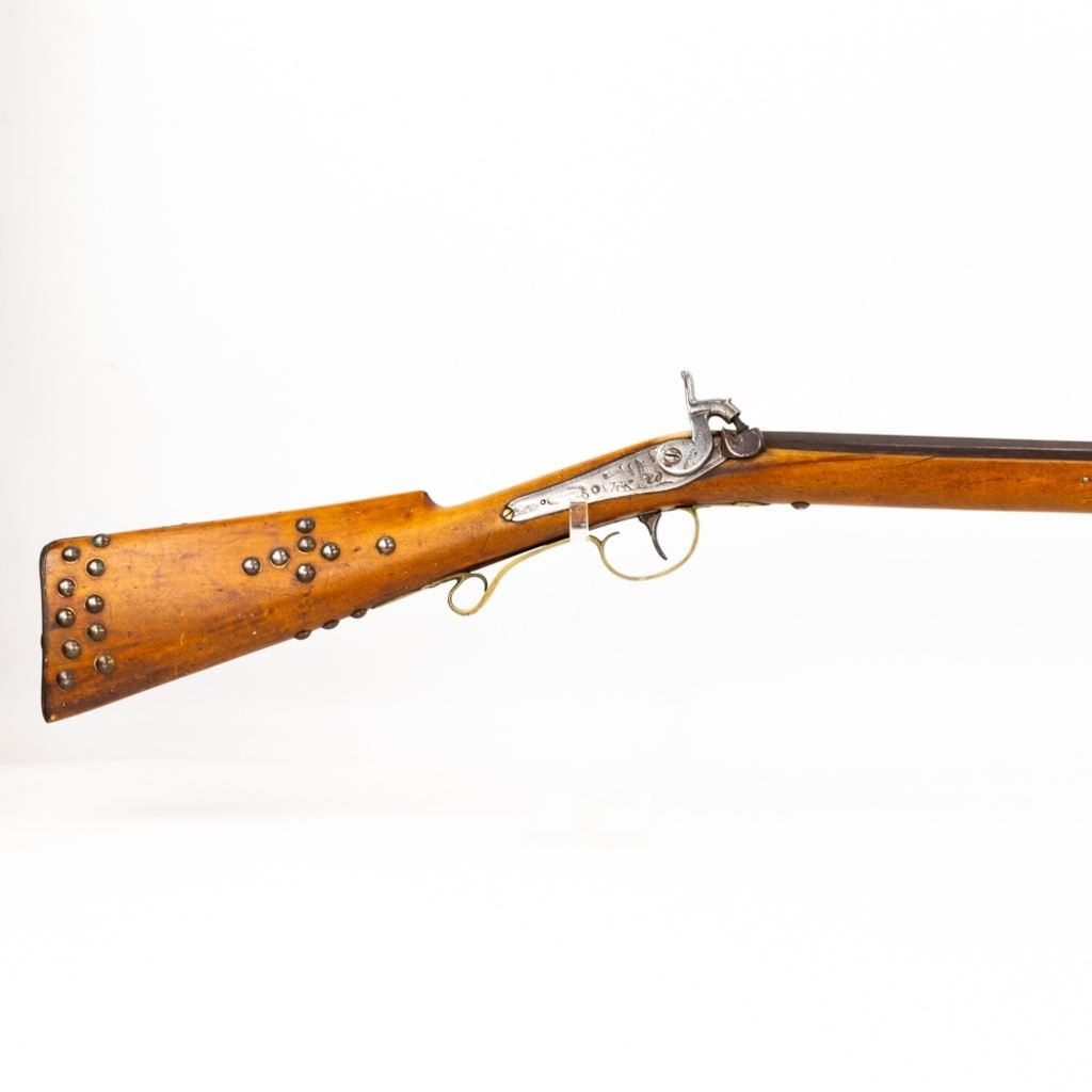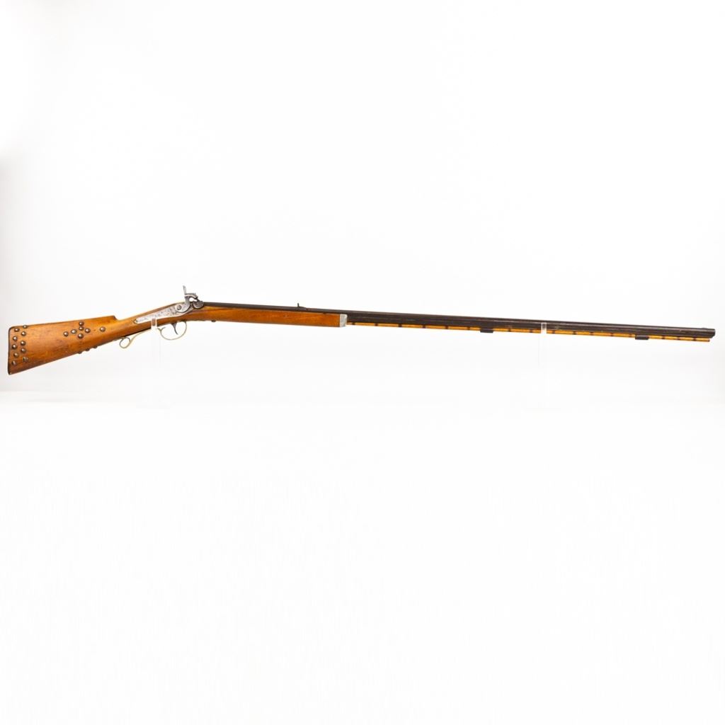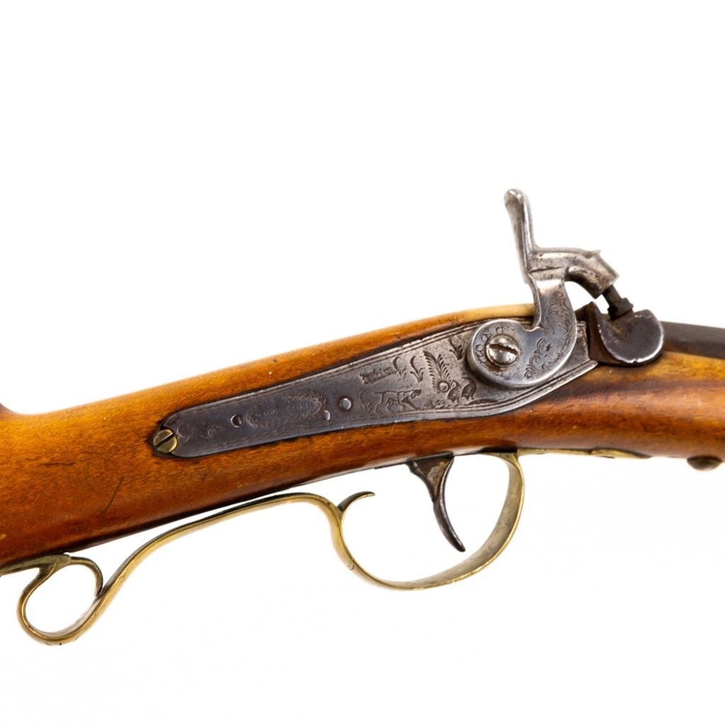 G. Goulcher .54 45" Musket in very good condition with some wear. Vintage percussion conversion. Octagon to round 45" barrel with a beautiful bore. Game scene engraving. Vintage "Native American" style stock tacks. MFG early to mid 1800's C&R Eligible S/N:nsn