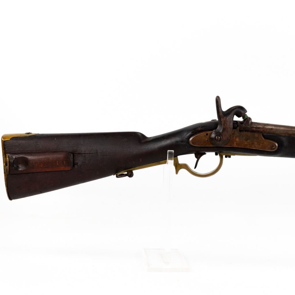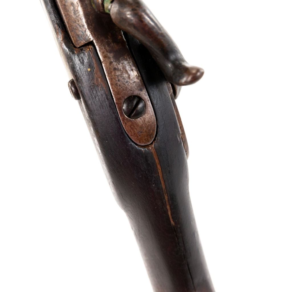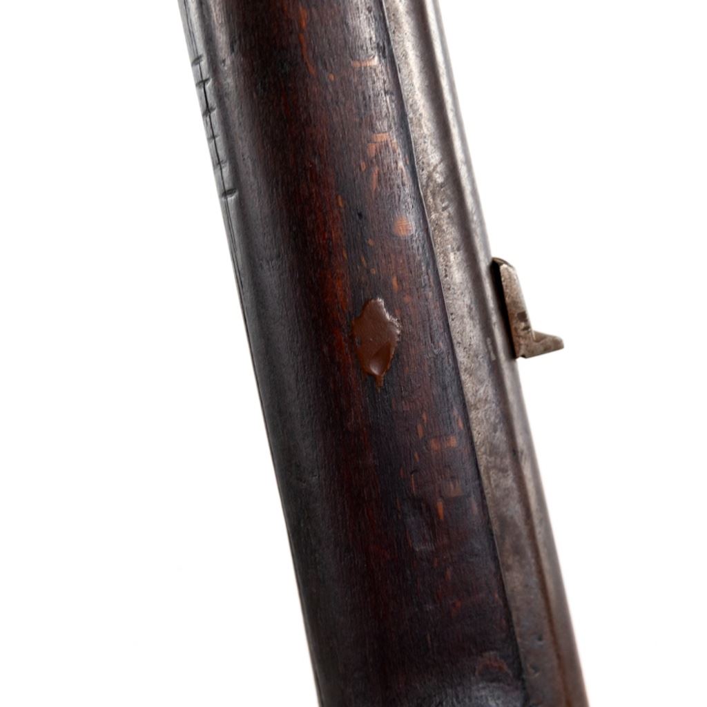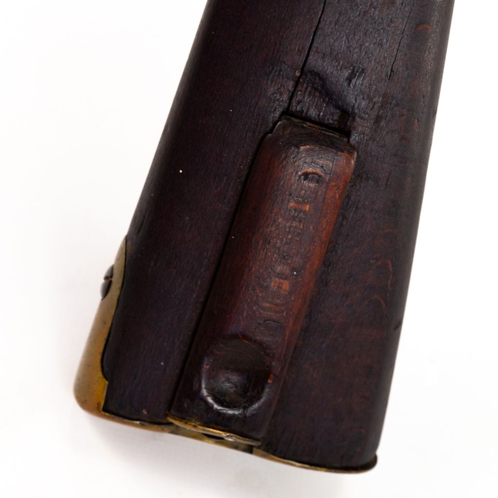 Unknown Manufacturer .74 Percussion 32" Patchbox Rifle in fair condition with wear, oxidation and cracked wood. Barrel bands missing. Rifling strong with some oxidation Several cracks throughout the wood behind the wrist. C&R Eligible S/N:nsn