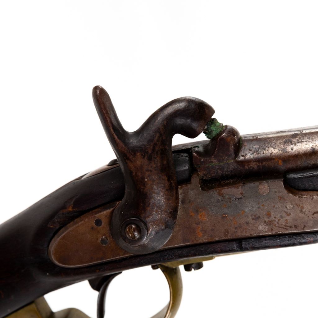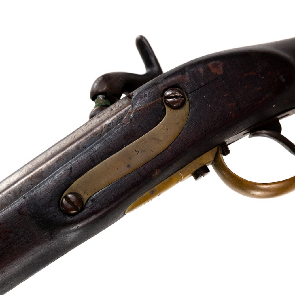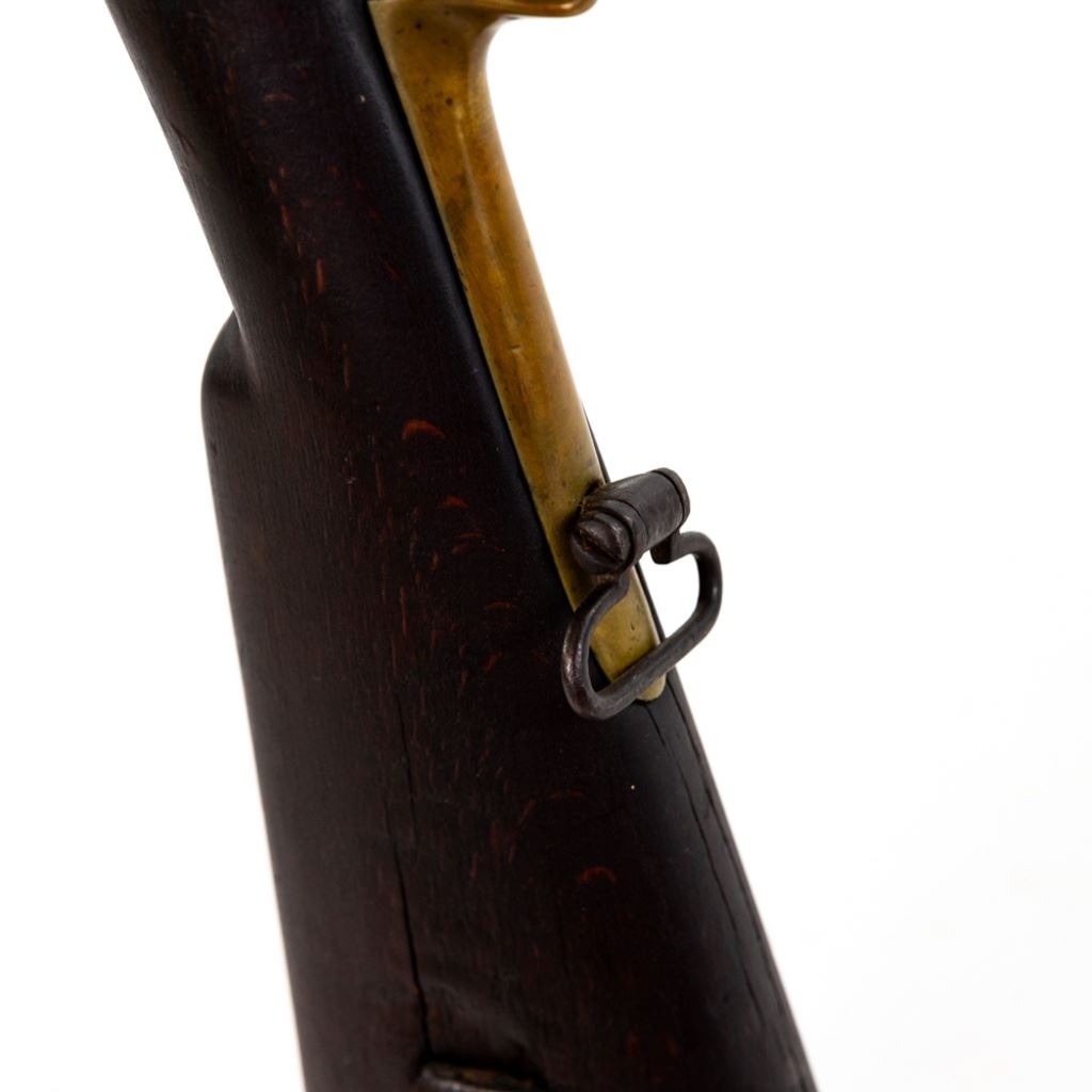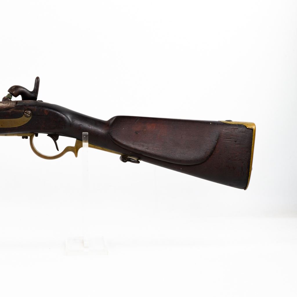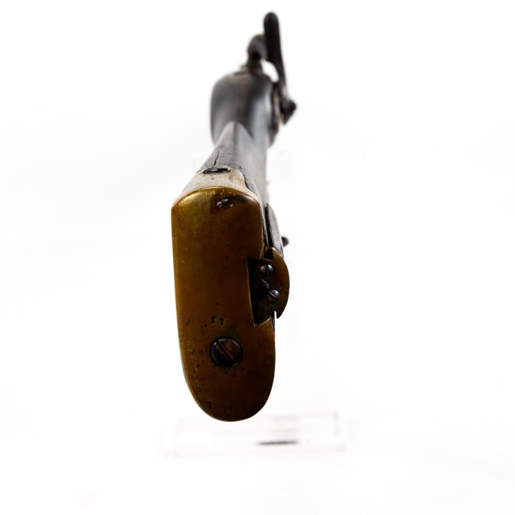 Unknown Manufacturer .74 Percussion 32" Patchbox Rifle in fair condition with wear, oxidation and cracked wood. Barrel bands missing. Rifling strong with some oxidation Several cracks throughout the wood behind the wrist. C&R Eligible S/N:nsn