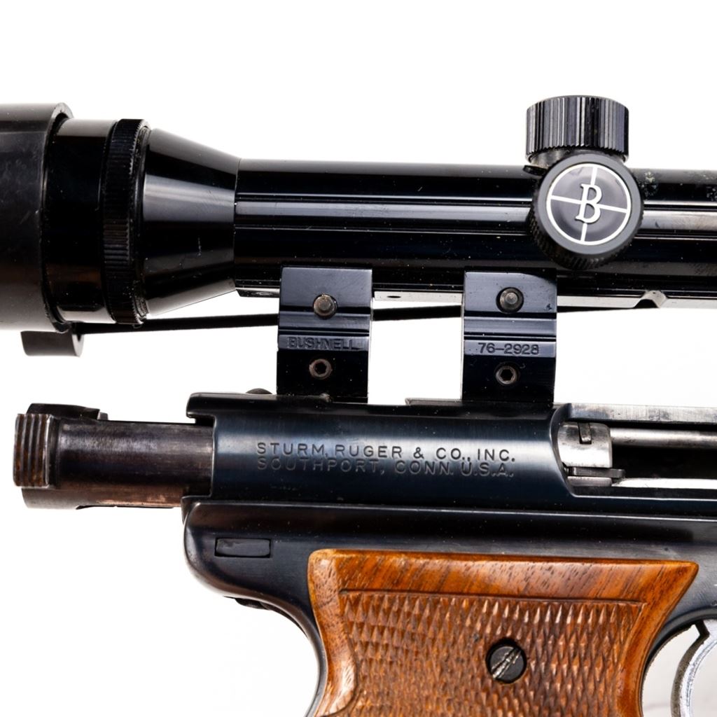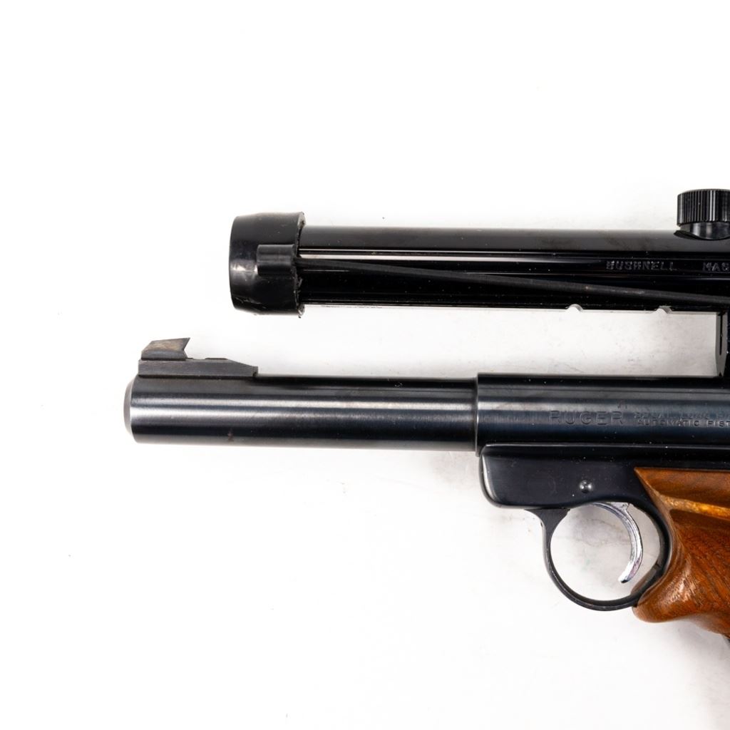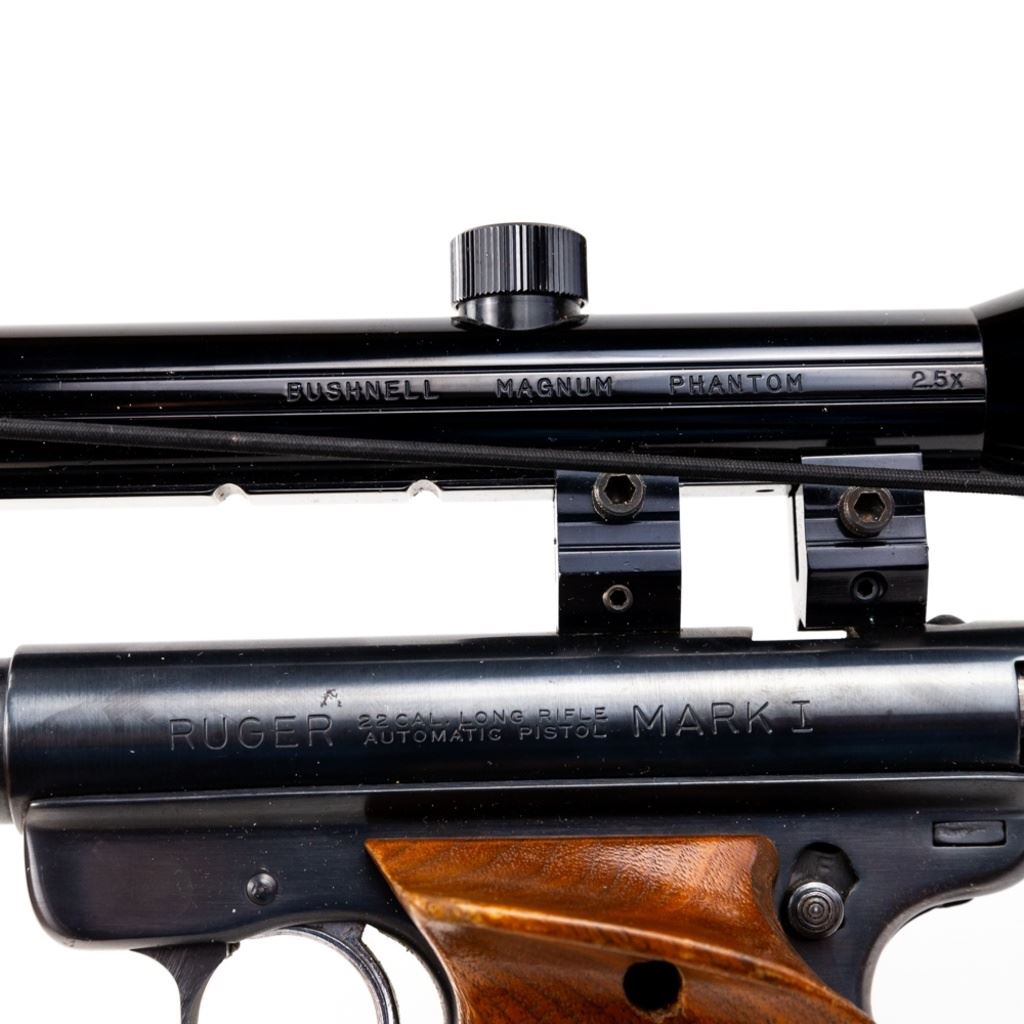 Ruger Mark I 22lr 5.5" Heavy Target Barrel Pistol in very good condition with some wear. Comes with Bushnell 2.5x Magnum Phantom scope and wooden target grips. S/N:13-07523