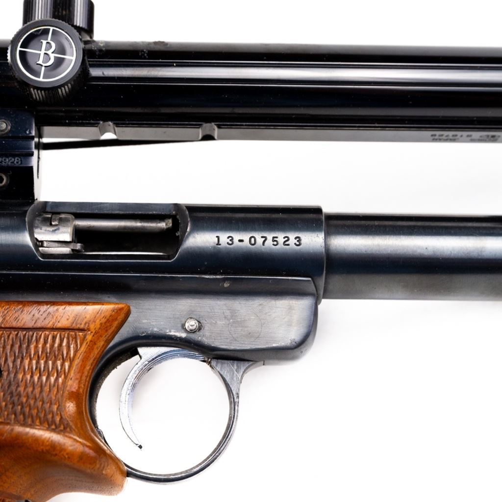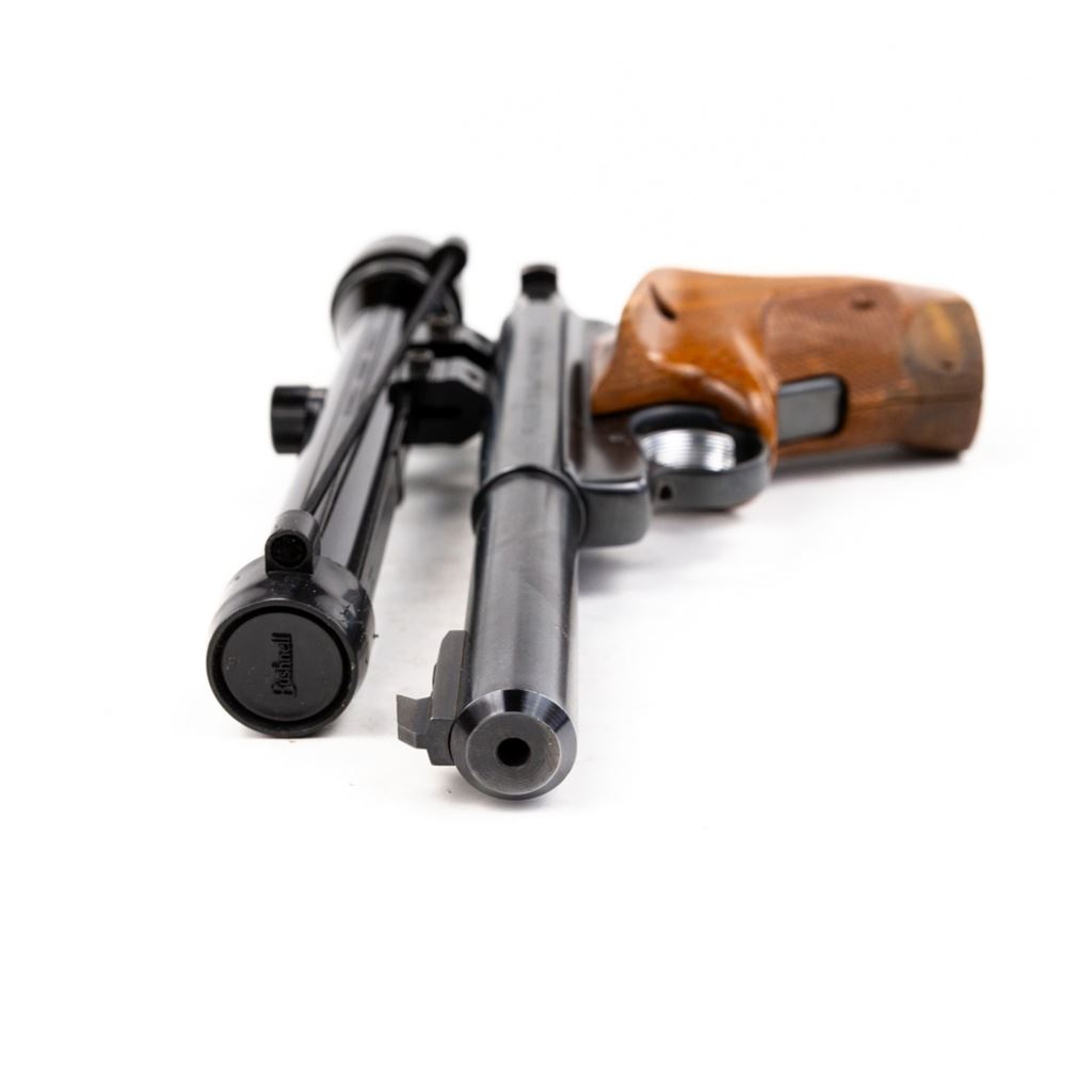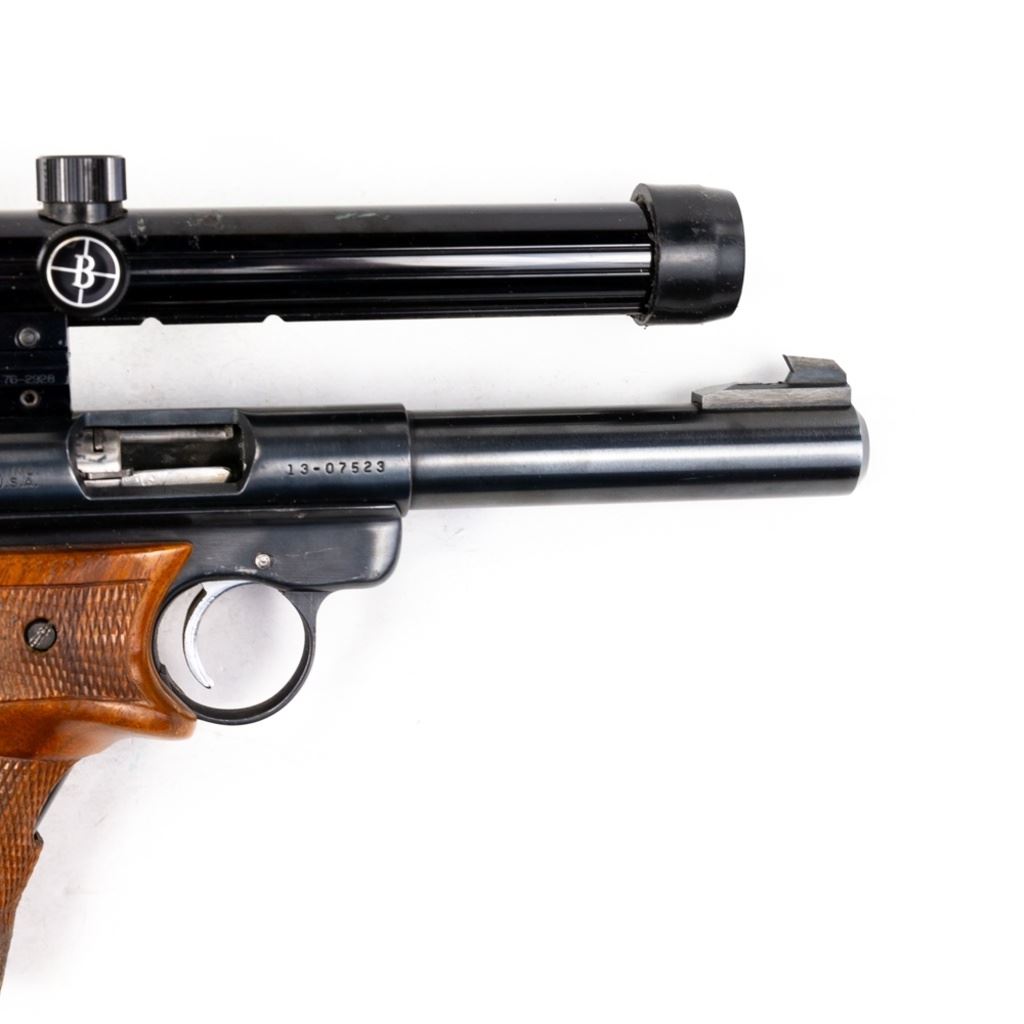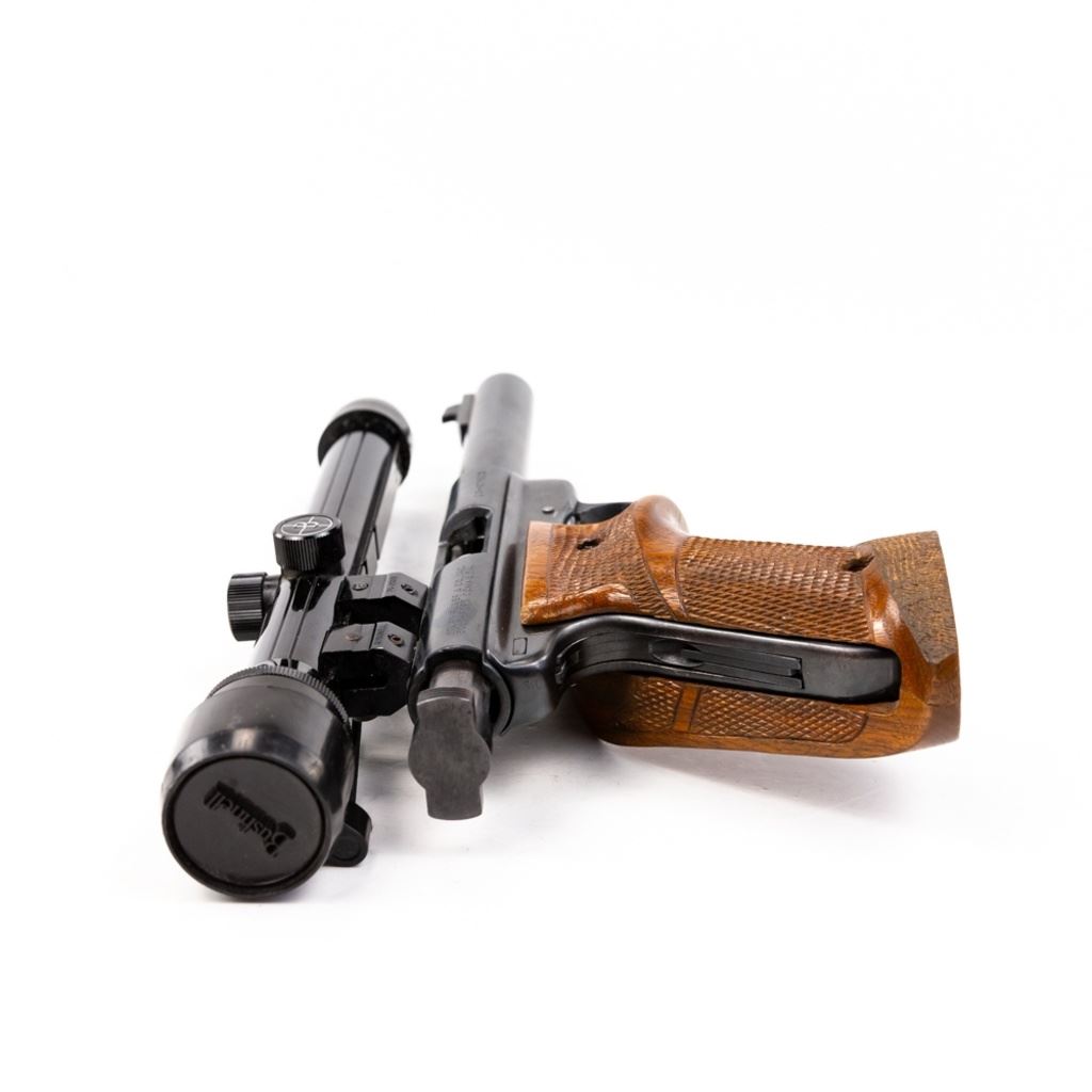 Ruger Mark I 22lr 5.5" Heavy Target Barrel Pistol in very good condition with some wear. Comes with Bushnell 2.5x Magnum Phantom scope and wooden target grips. S/N:13-07523