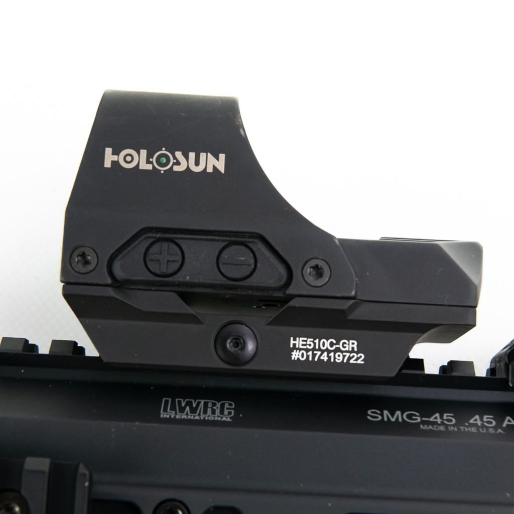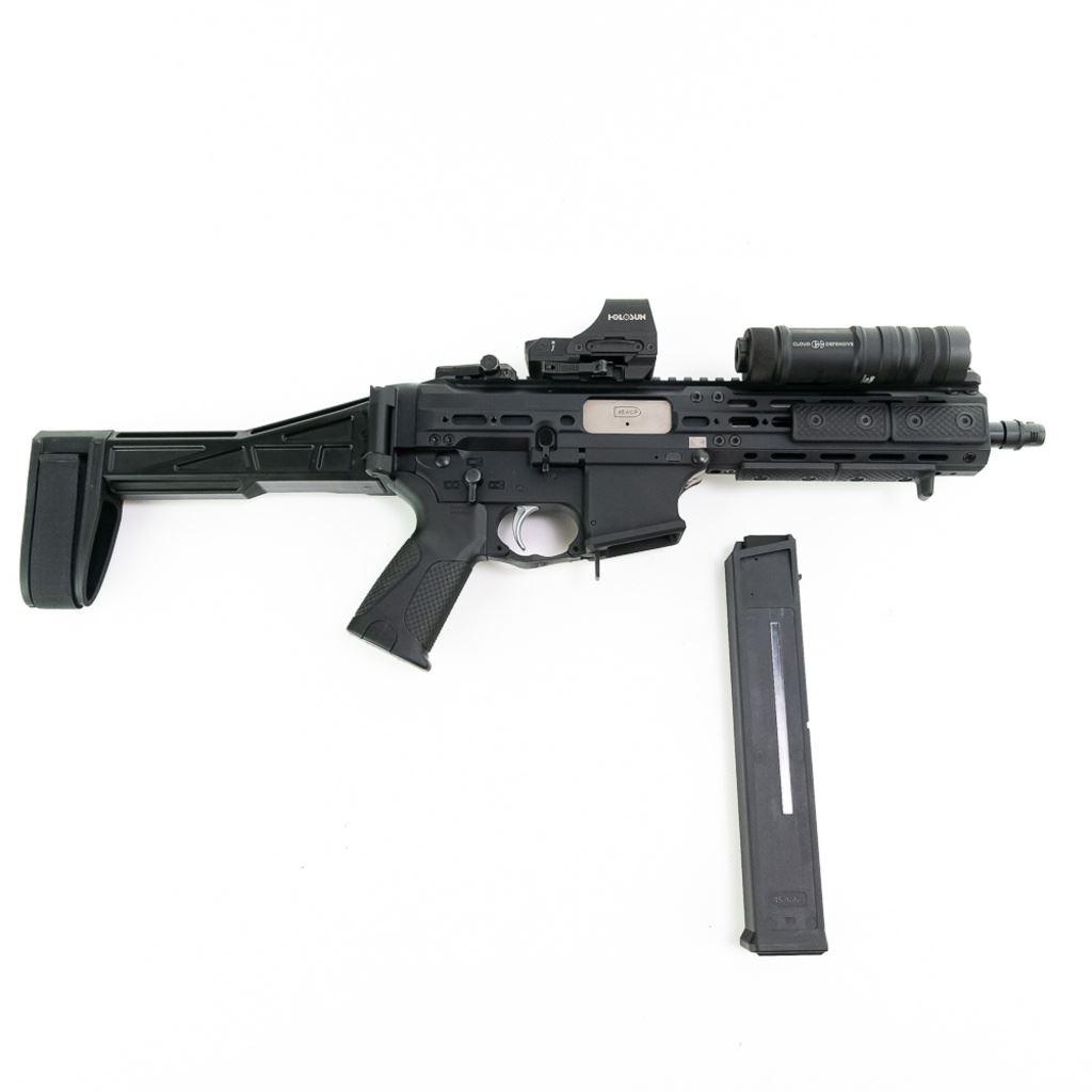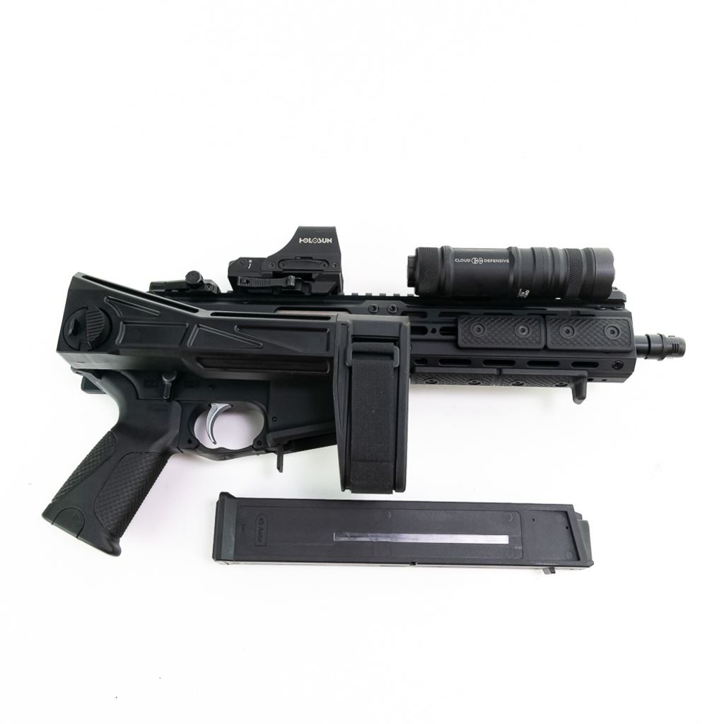 LWRC SMG45 .45acp Pistol in excellent condition with very minor wear. Comes with 3x magazines, Holosun Red Dot optic, Cloud Defense Owl weapon light, SB tactical Brace, and original box. S/N:SMG1161 CANNOT BE SOLD TO ILLINOIS RESIDENTS!! NOTES AUCTIONEER: CANNOT BE SOLD TO ILLINOIS RESIDENTS!!