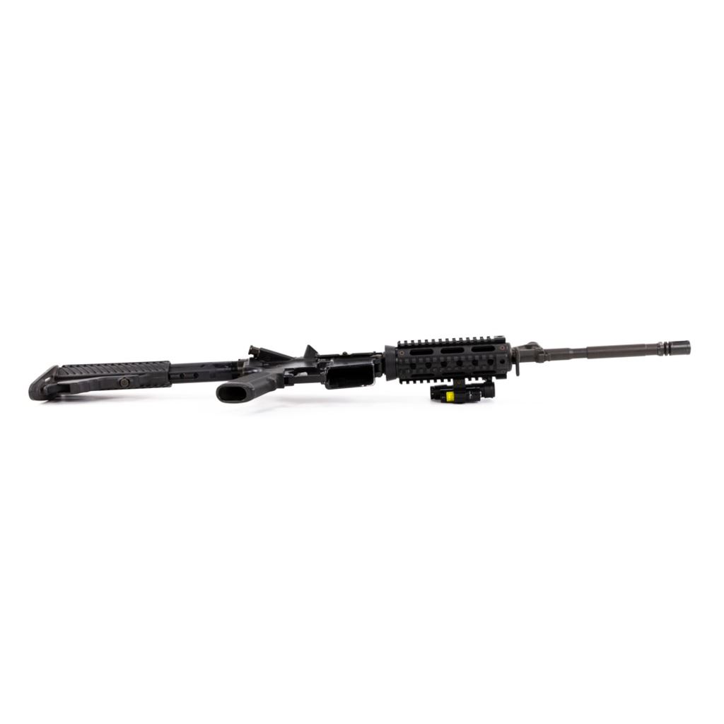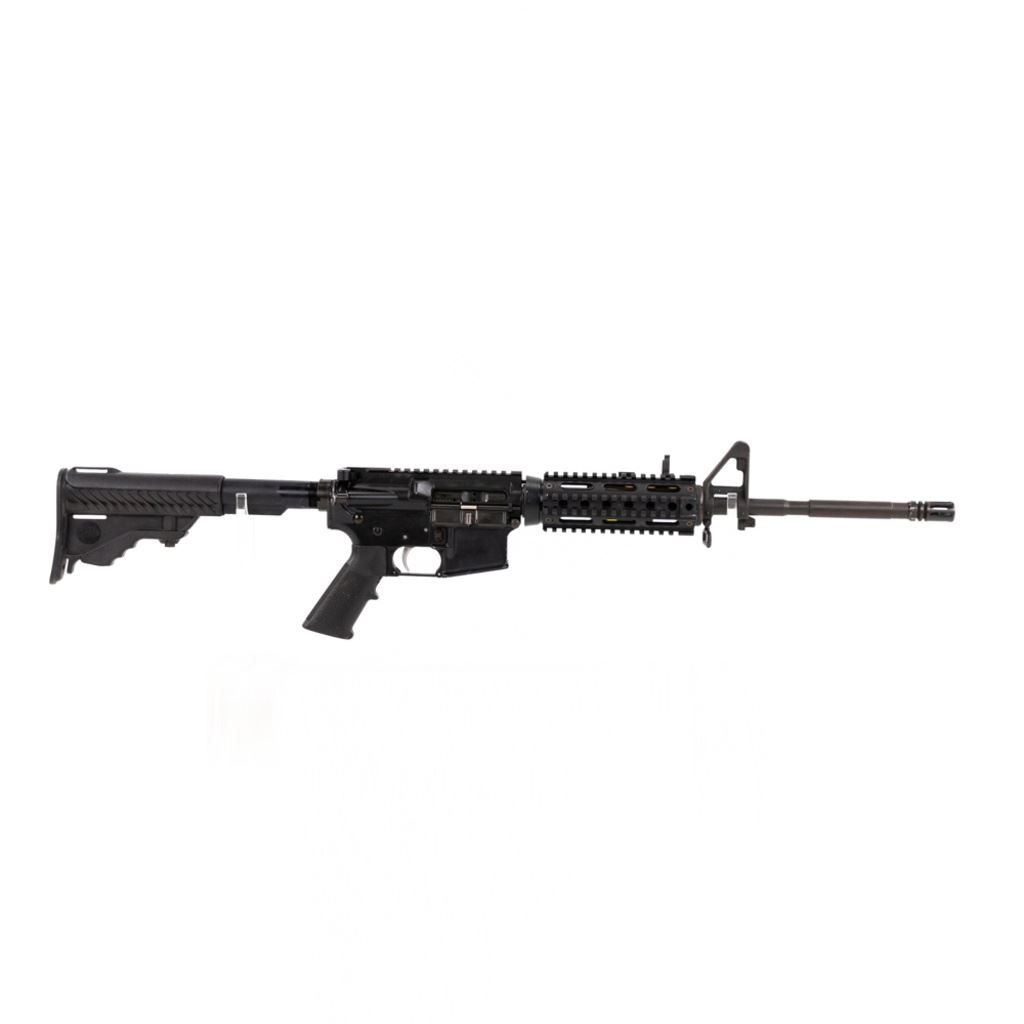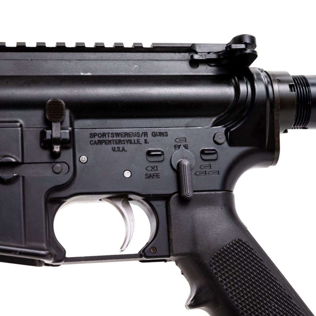 CANNOT SELL TO ILLINOIS RESIDENTS!!R-Guns TRR-15 5.56 16" Rifle in very good condition with some wear. Comes with a quad rail fore end and 1x magazine. S/N:TRR0A5352 THIS WAS A MOVIE PROP GUN USED IN MOVIES AND TELEVISION SHOWS SHOT HERE IN CHICAGO. IT SHOULD BE CHECKED BY A COMPETENT GUNSMITH TO CHECK FOR SHOOTABILITY BEFORE FIRING. BARRELS MAY HAVE BEEN MODIFIED TO ALSO SHOOT BLANKS. NOTES AUCTIONEER: CANNOT SELL TO ILLINOIS RESIDENTS!