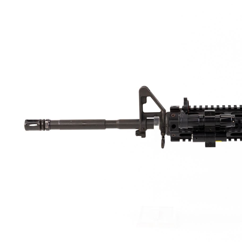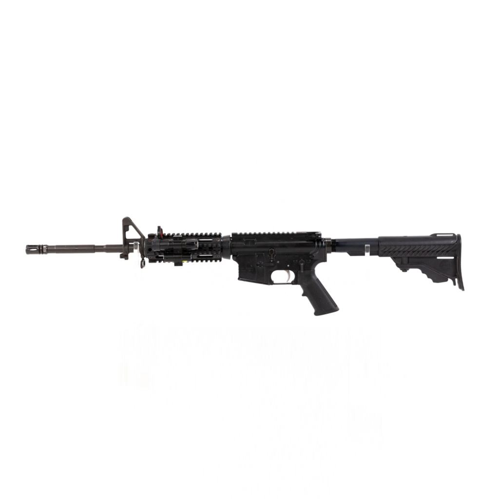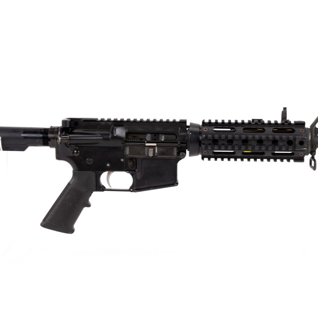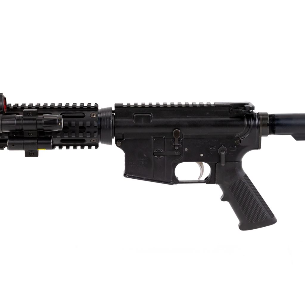 CANNOT SELL TO ILLINOIS RESIDENTS!!R-Guns TRR-15 5.56 16" Rifle in very good condition with some wear. Comes with a quad rail fore end and 1x magazine. S/N:TRR0A5352 THIS WAS A MOVIE PROP GUN USED IN MOVIES AND TELEVISION SHOWS SHOT HERE IN CHICAGO. IT SHOULD BE CHECKED BY A COMPETENT GUNSMITH TO CHECK FOR SHOOTABILITY BEFORE FIRING. BARRELS MAY HAVE BEEN MODIFIED TO ALSO SHOOT BLANKS. NOTES AUCTIONEER: CANNOT SELL TO ILLINOIS RESIDENTS!