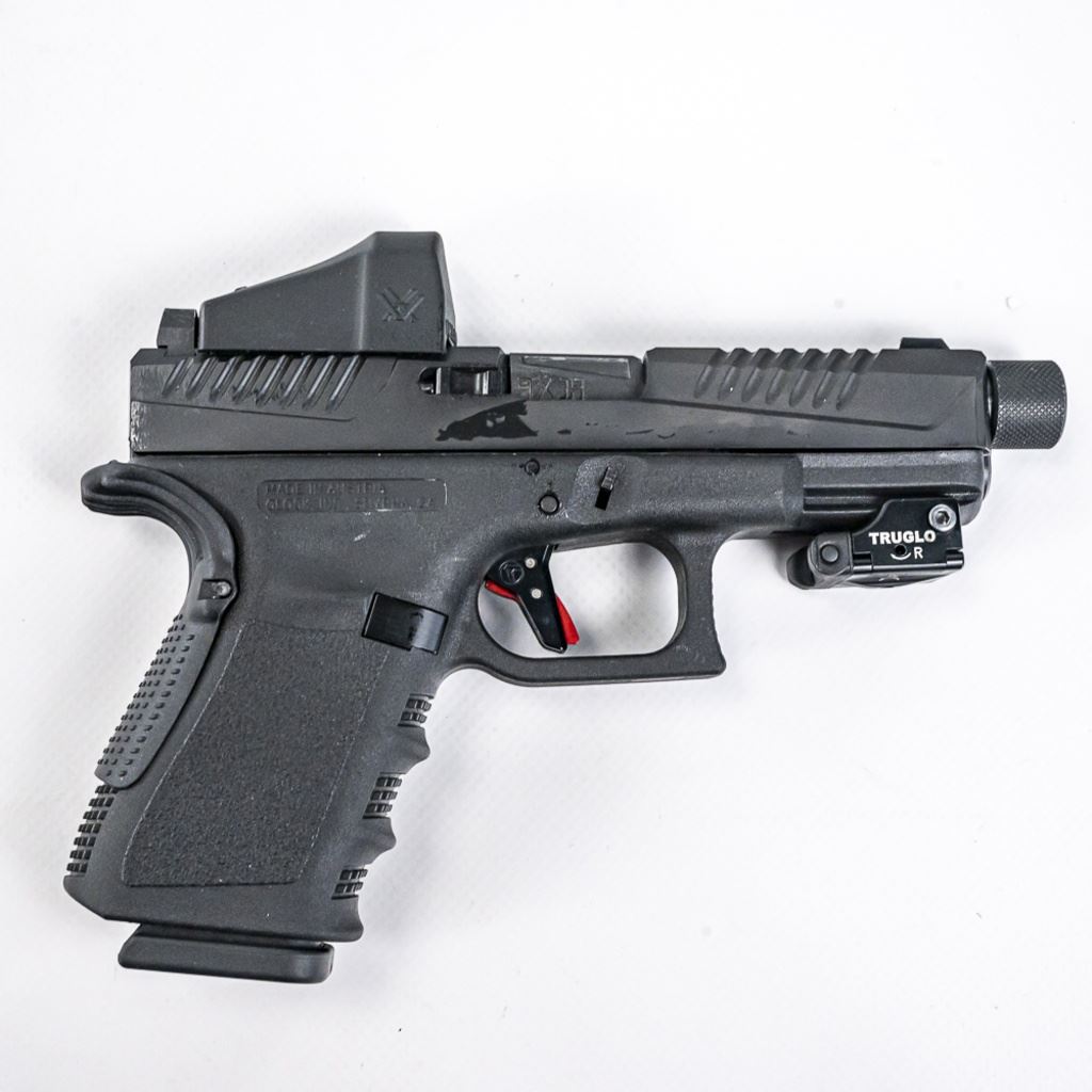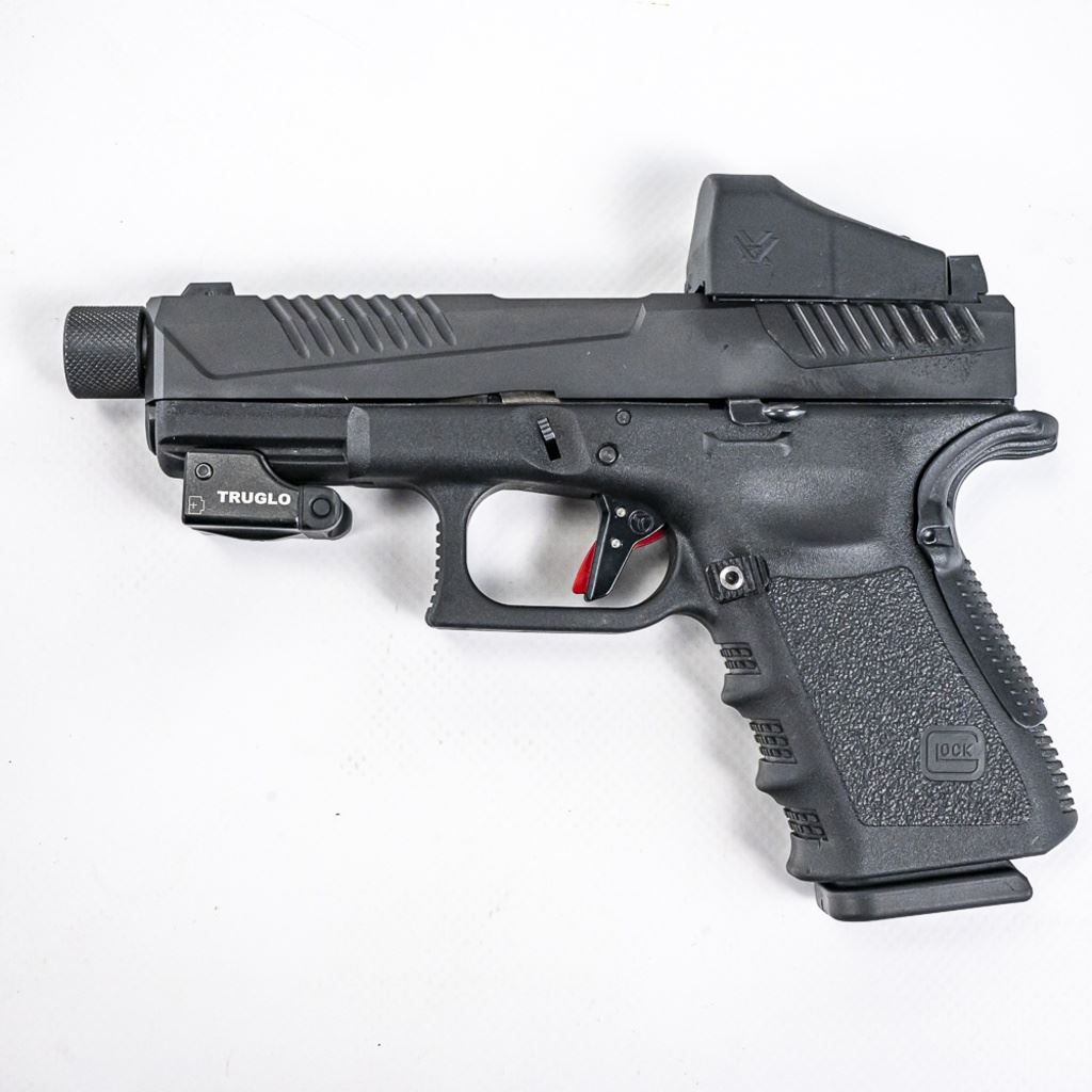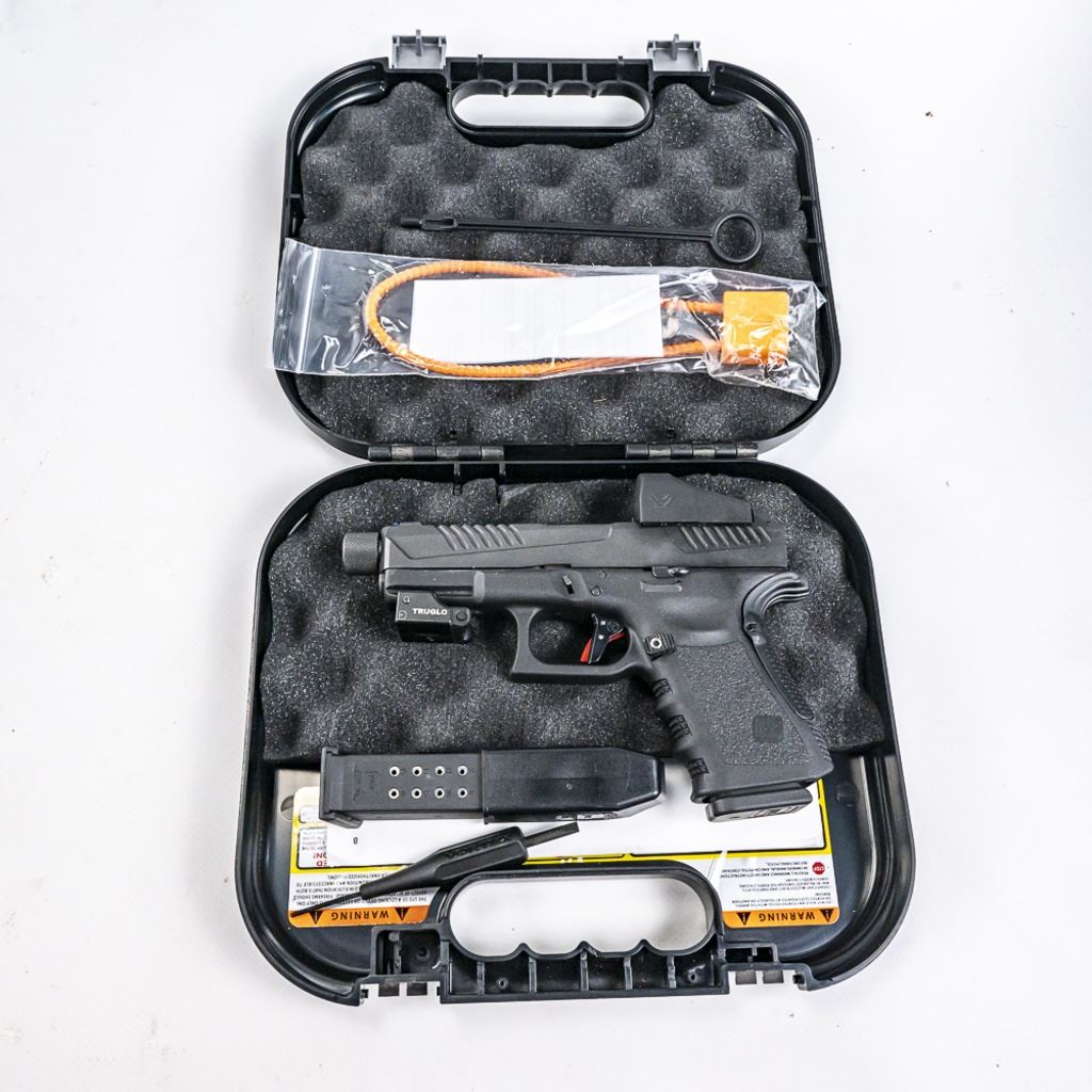 CUSTOMIZED! Glock 19 G4 9mm Pistol in excellent condition. Modifications: Voo-Doo slide & threaded barrel, Timney trigger, Vortex Venom red dot, extended mad release and slide release, TruGlo laser. Comes with the original case, manuals, 2x magazines and MANY extra parts! S/N:BCAZ296