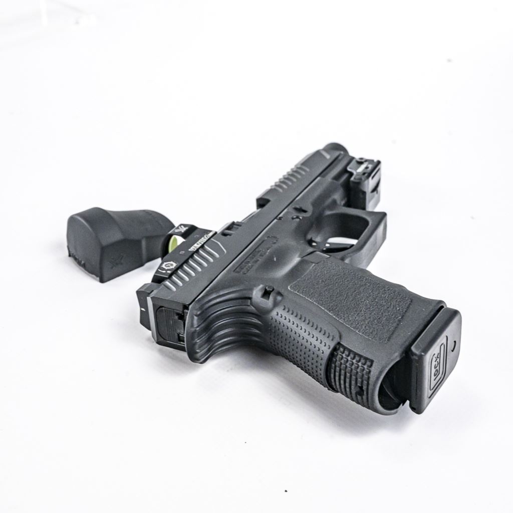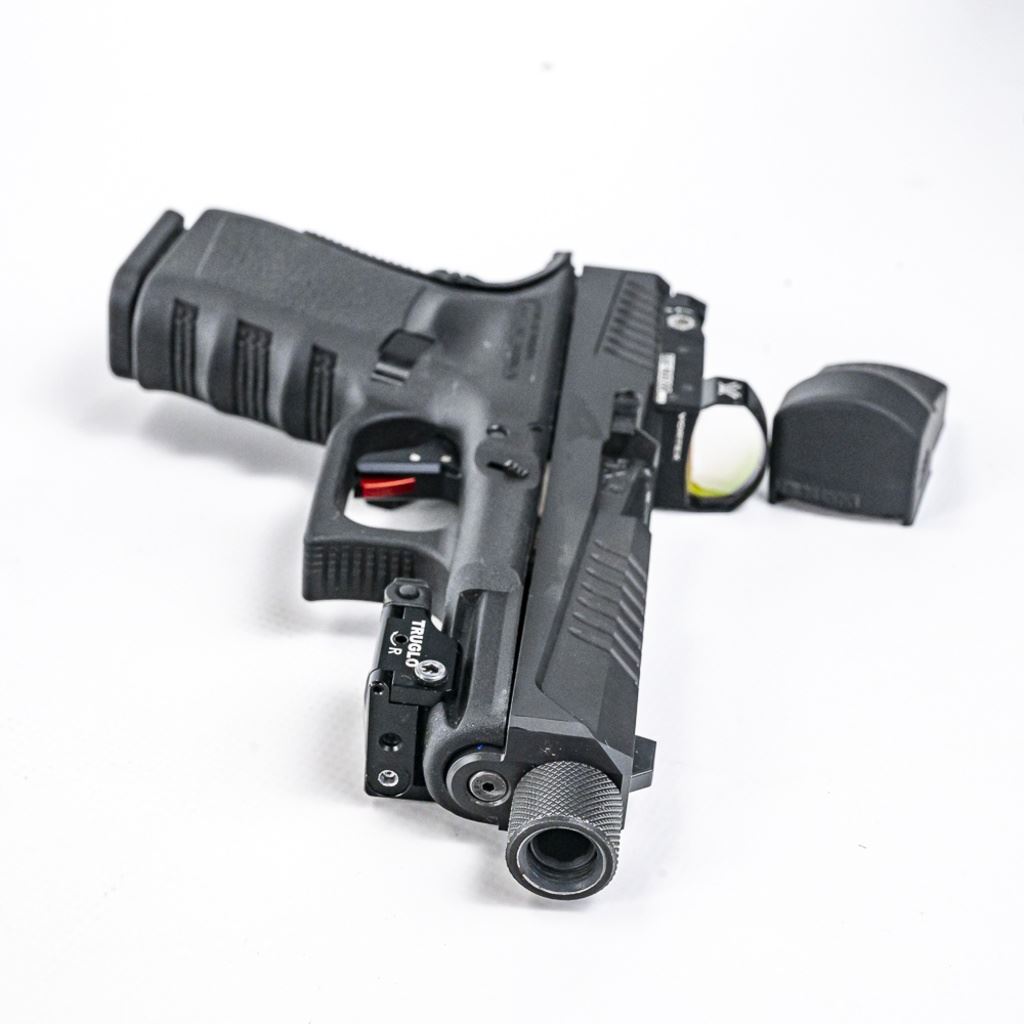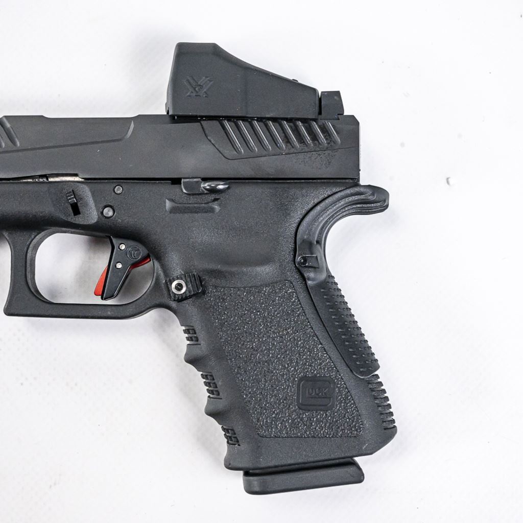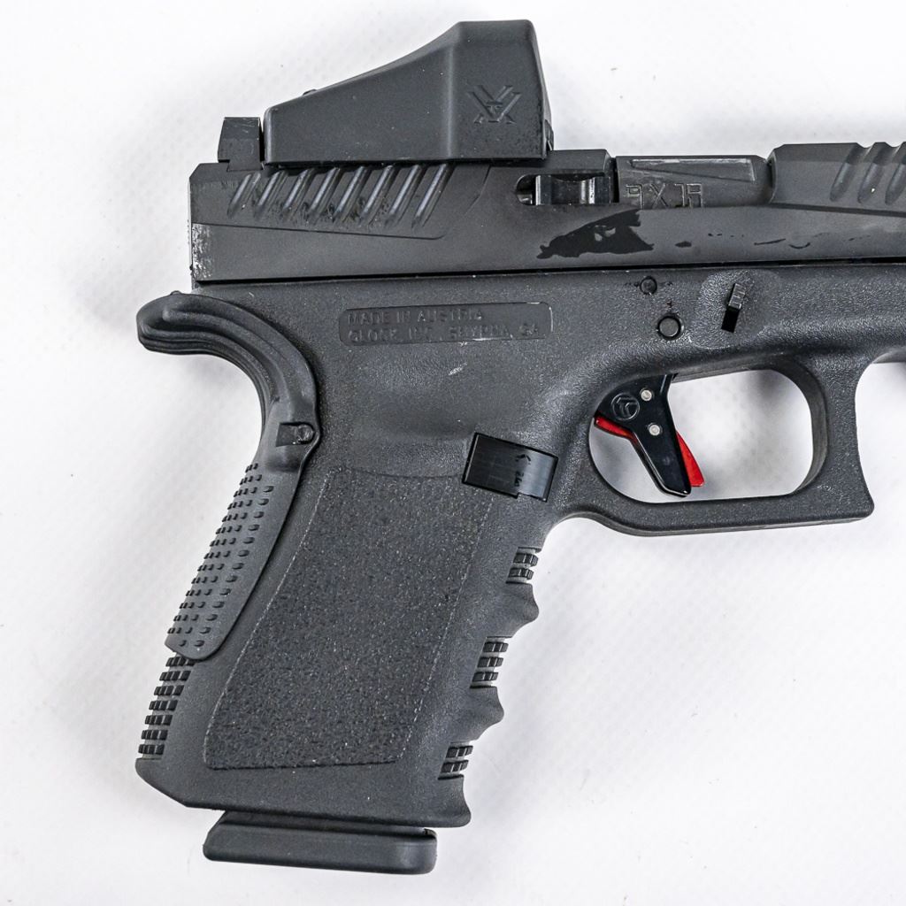 CUSTOMIZED! Glock 19 G4 9mm Pistol in excellent condition. Modifications: Voo-Doo slide & threaded barrel, Timney trigger, Vortex Venom red dot, extended mad release and slide release, TruGlo laser. Comes with the original case, manuals, 2x magazines and MANY extra parts! S/N:BCAZ296