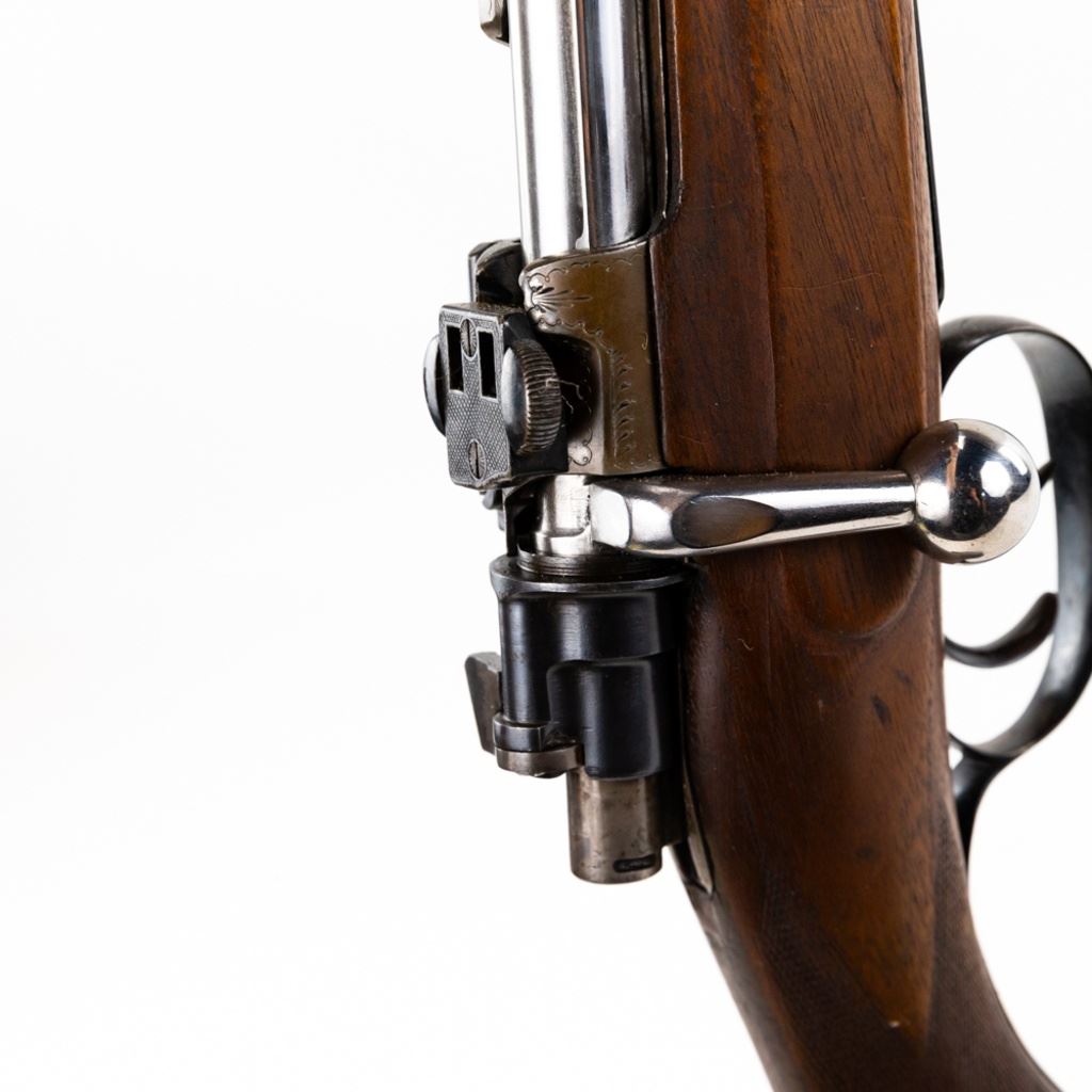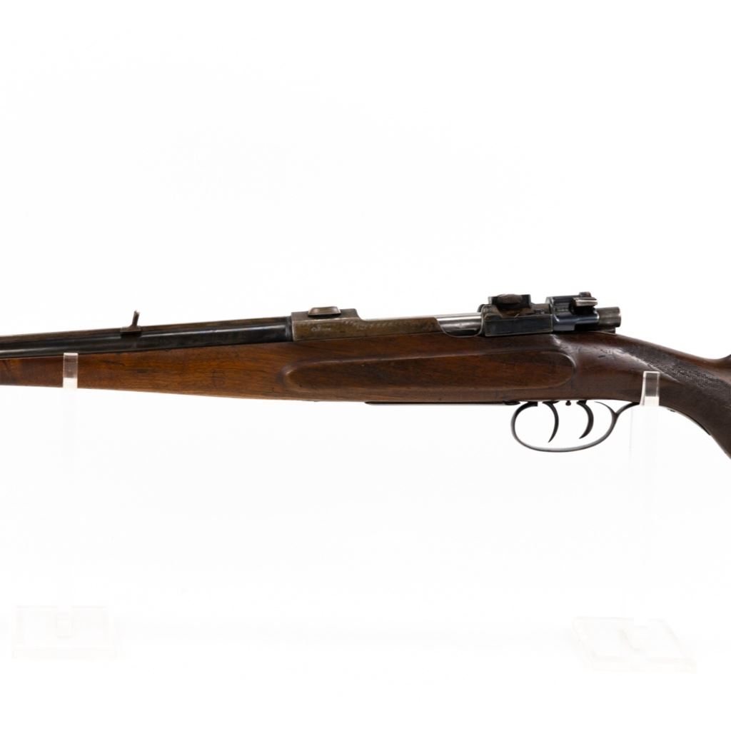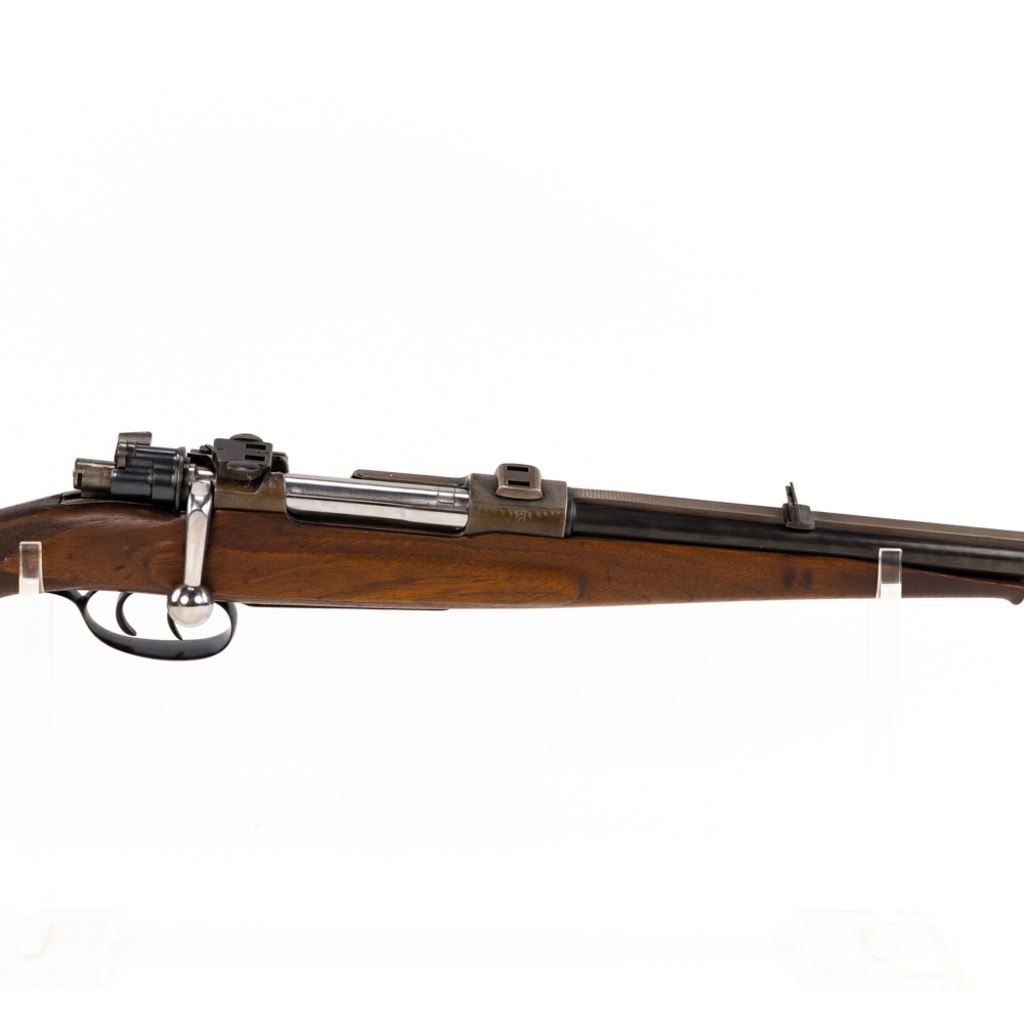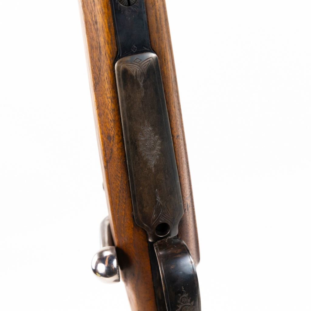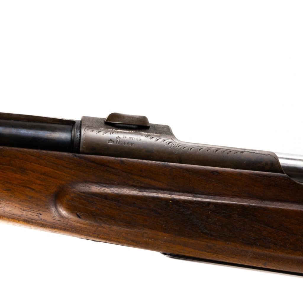 Unknown MFG Mauser Style 8mm(?) German Hunting Rifle in very good condition with some wear. Appears to be a WWII souvenir. Very tasteful German style engraving on the receiver. Set triggers. Flip rear sights, fiber optic front sight added. Solid rib and vintage euro scope mounts. Nicely carved wood stock with a Schnabel fore end. C&R Eligible S/N:nsn