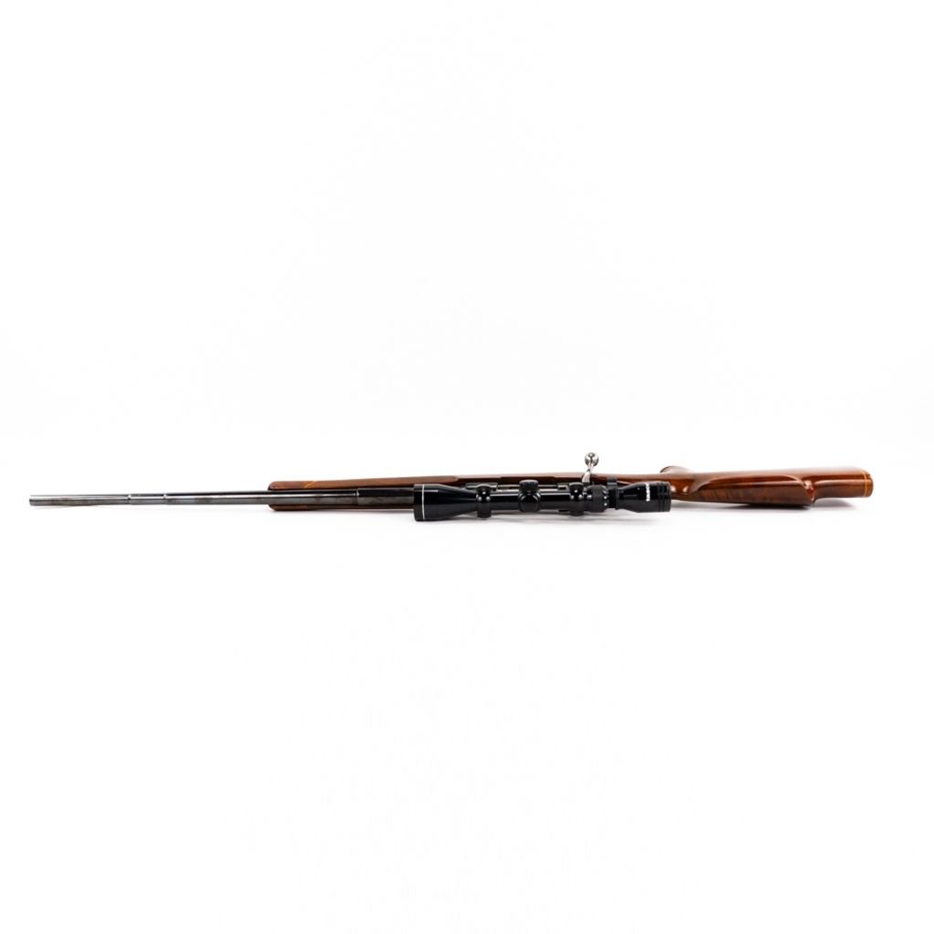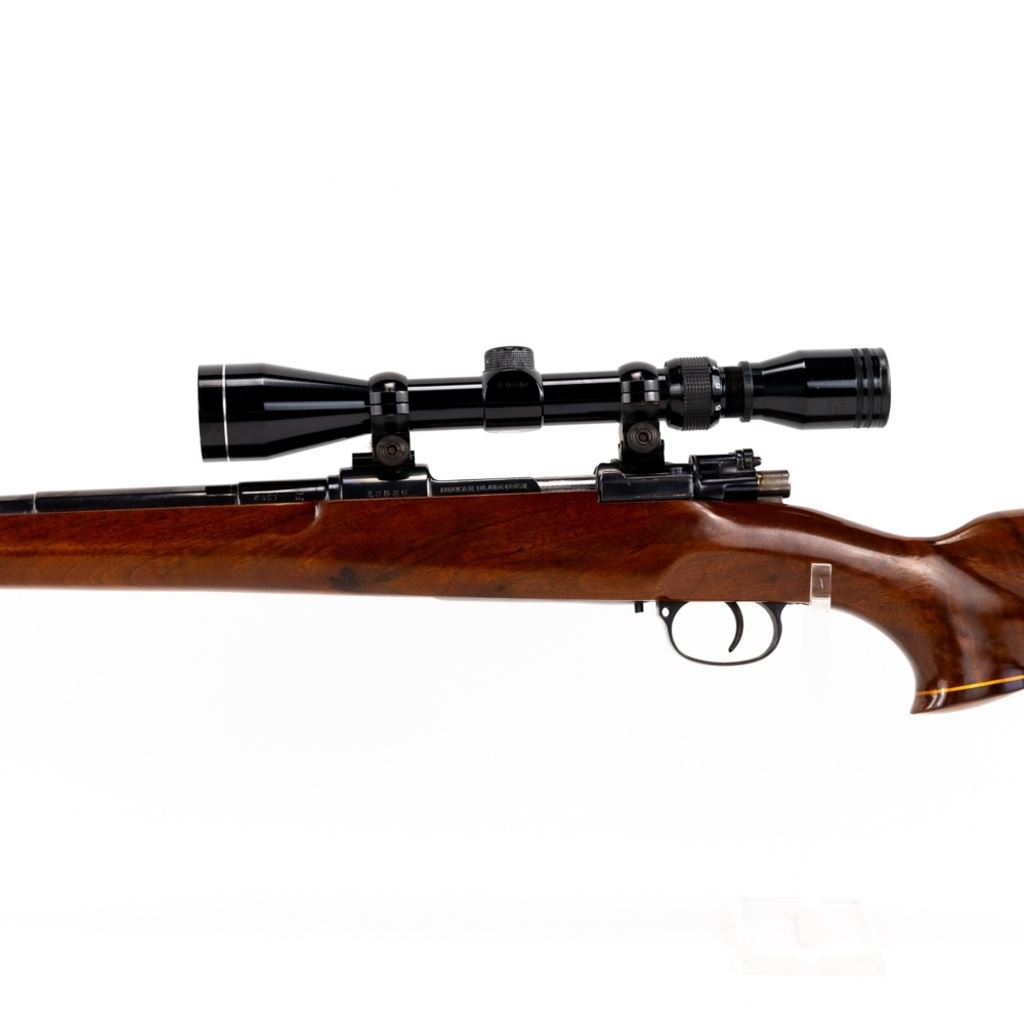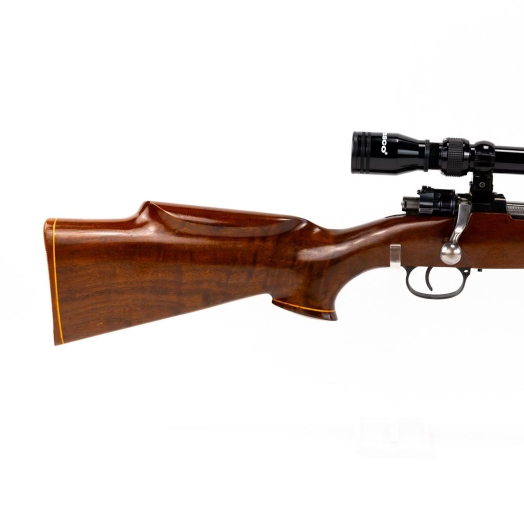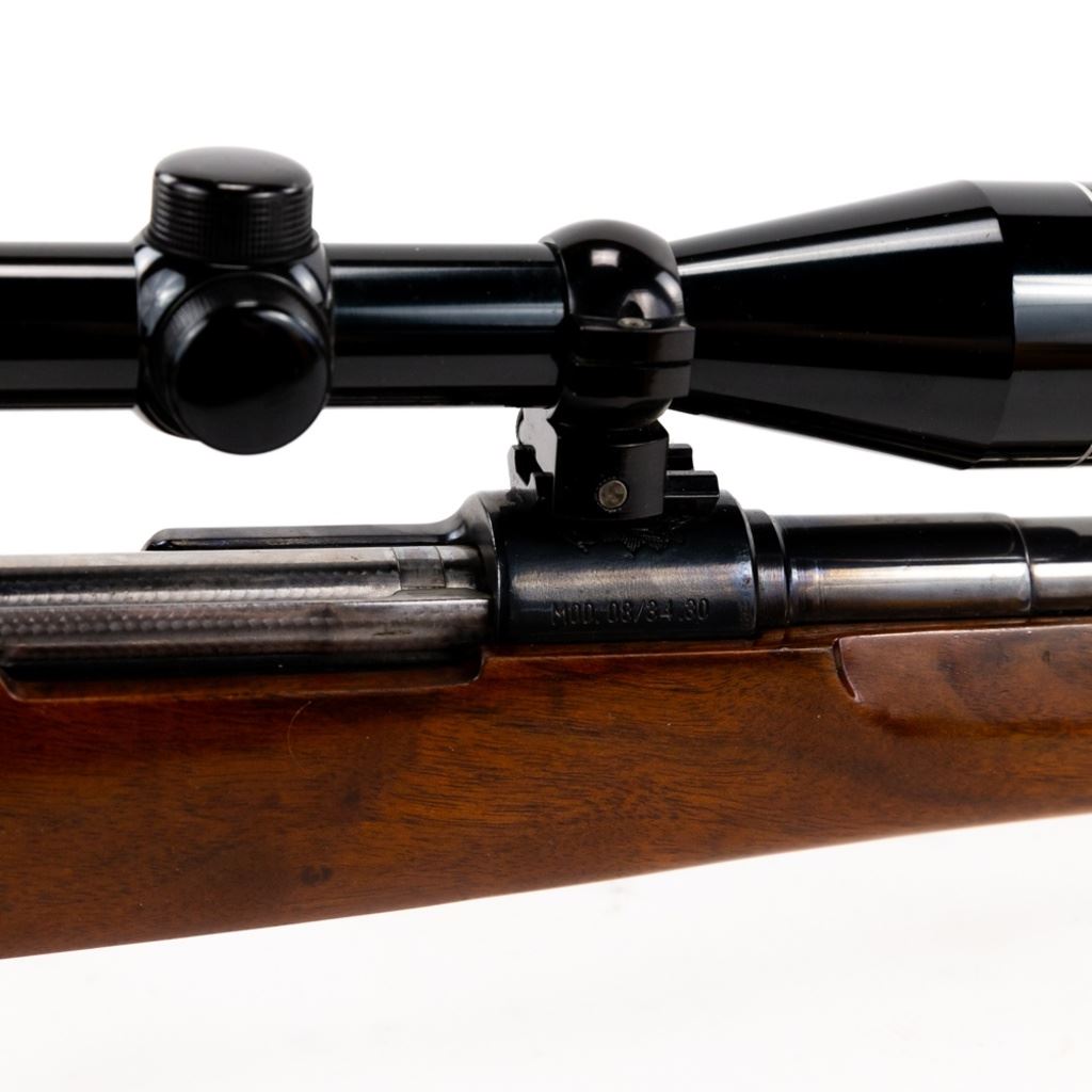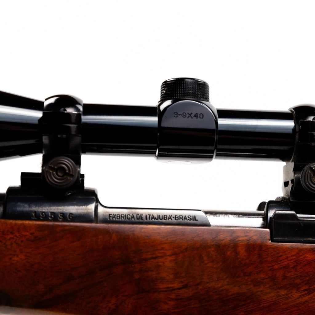 Sporterized Fabrica de Itajuba 08/34.30 7mm Rifle in good condition with some wear and oxidation, Very nice Monte Carlo stock with fore end and pistol grip caps. Has a Tasco 3-9x40 scope and jeweled bolt. The action seems fully functional and the bore has some oxidation.