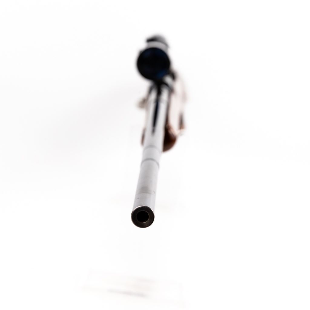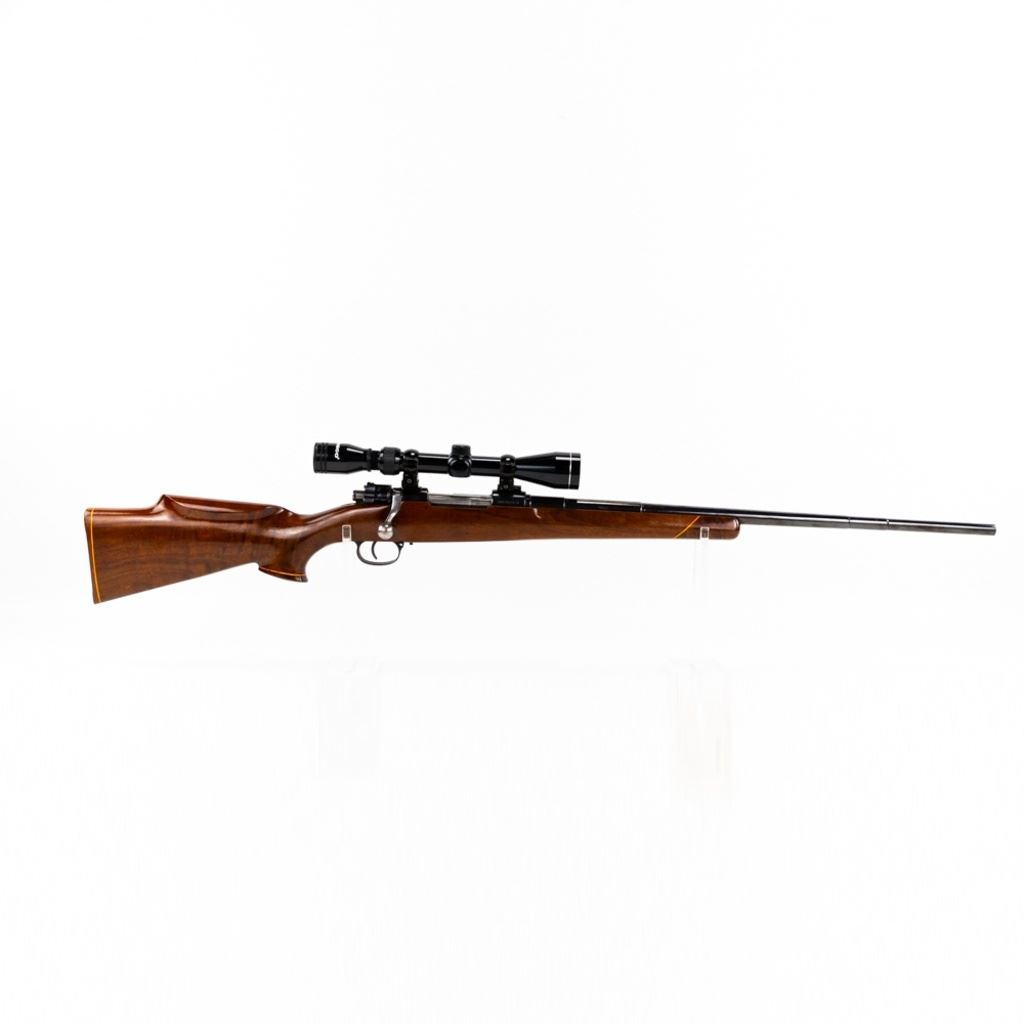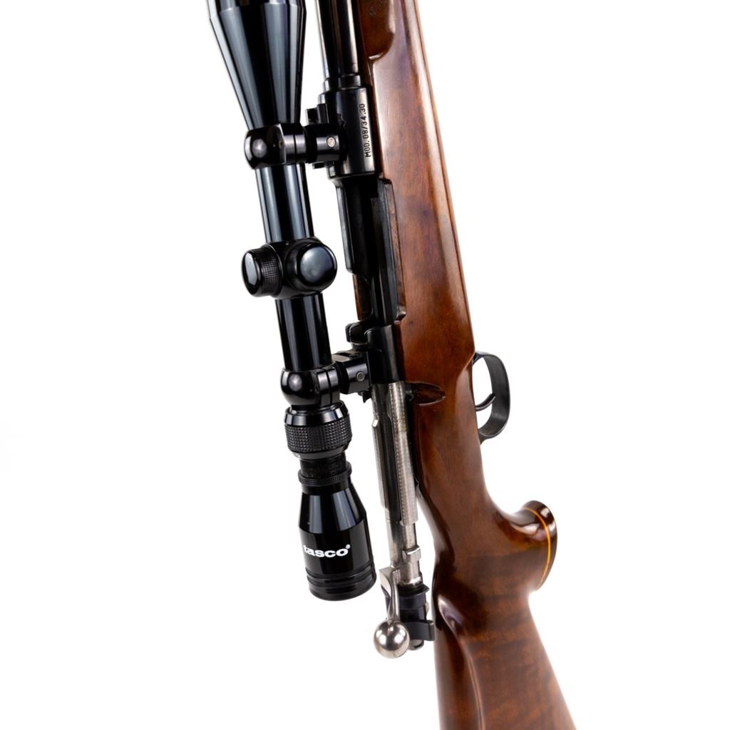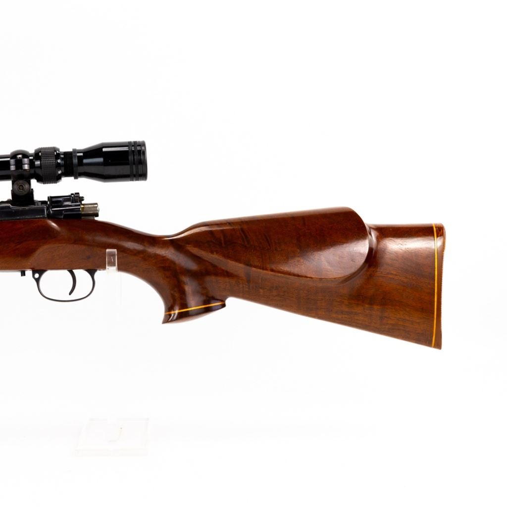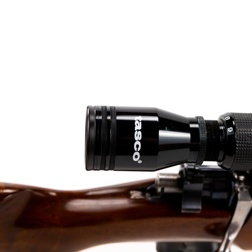 Sporterized Fabrica de Itajuba 08/34.30 7mm Rifle in good condition with some wear and oxidation, Very nice Monte Carlo stock with fore end and pistol grip caps. Has a Tasco 3-9x40 scope and jeweled bolt. The action seems fully functional and the bore has some oxidation.