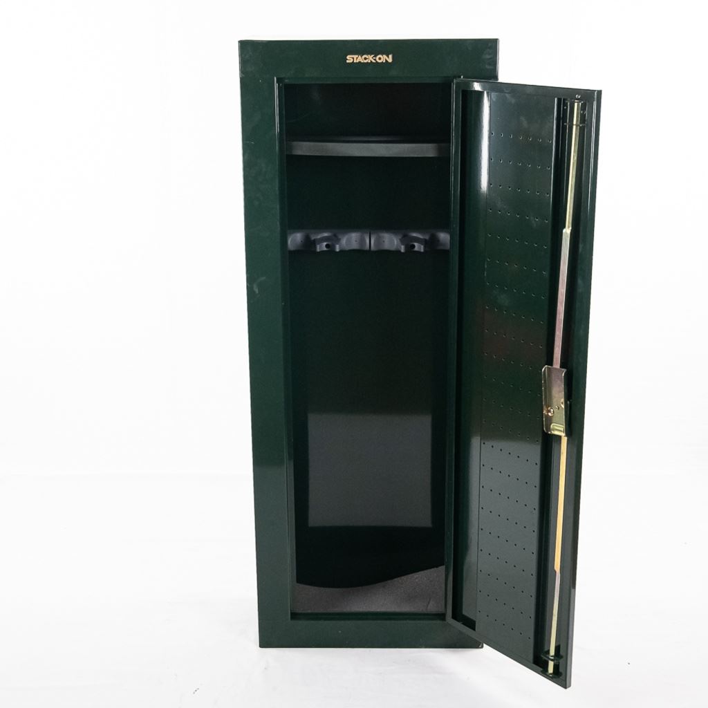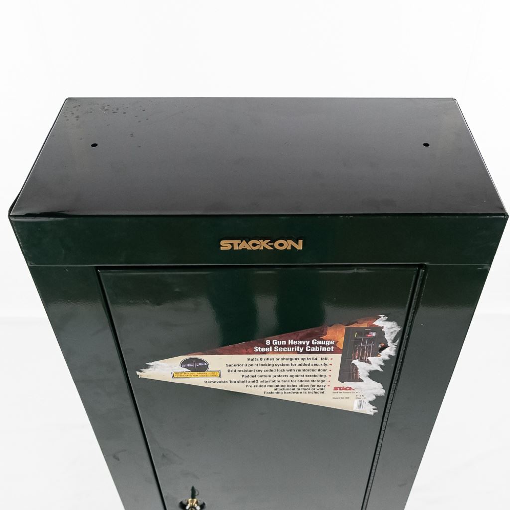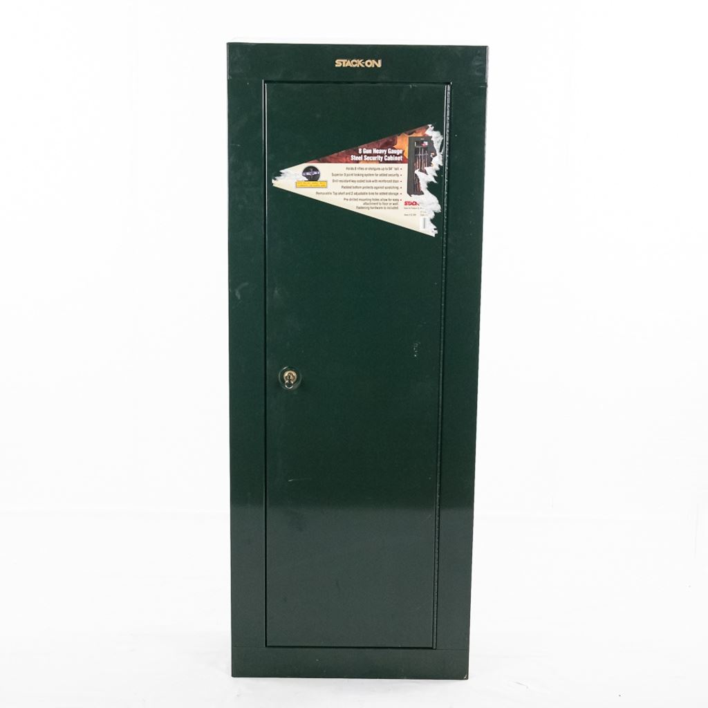 Stack-On 8 Gun Steel Security Cabinet. Cabinet is used but in excellent condition with minor moving scratches and wear. Inside has shelf and barrel rests. Cabinet comes with 1 key. See Photos.