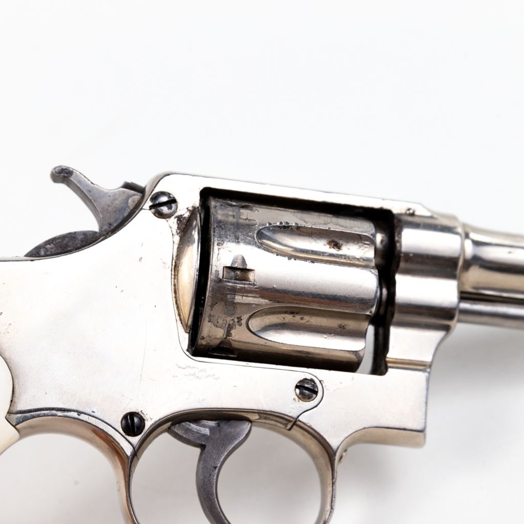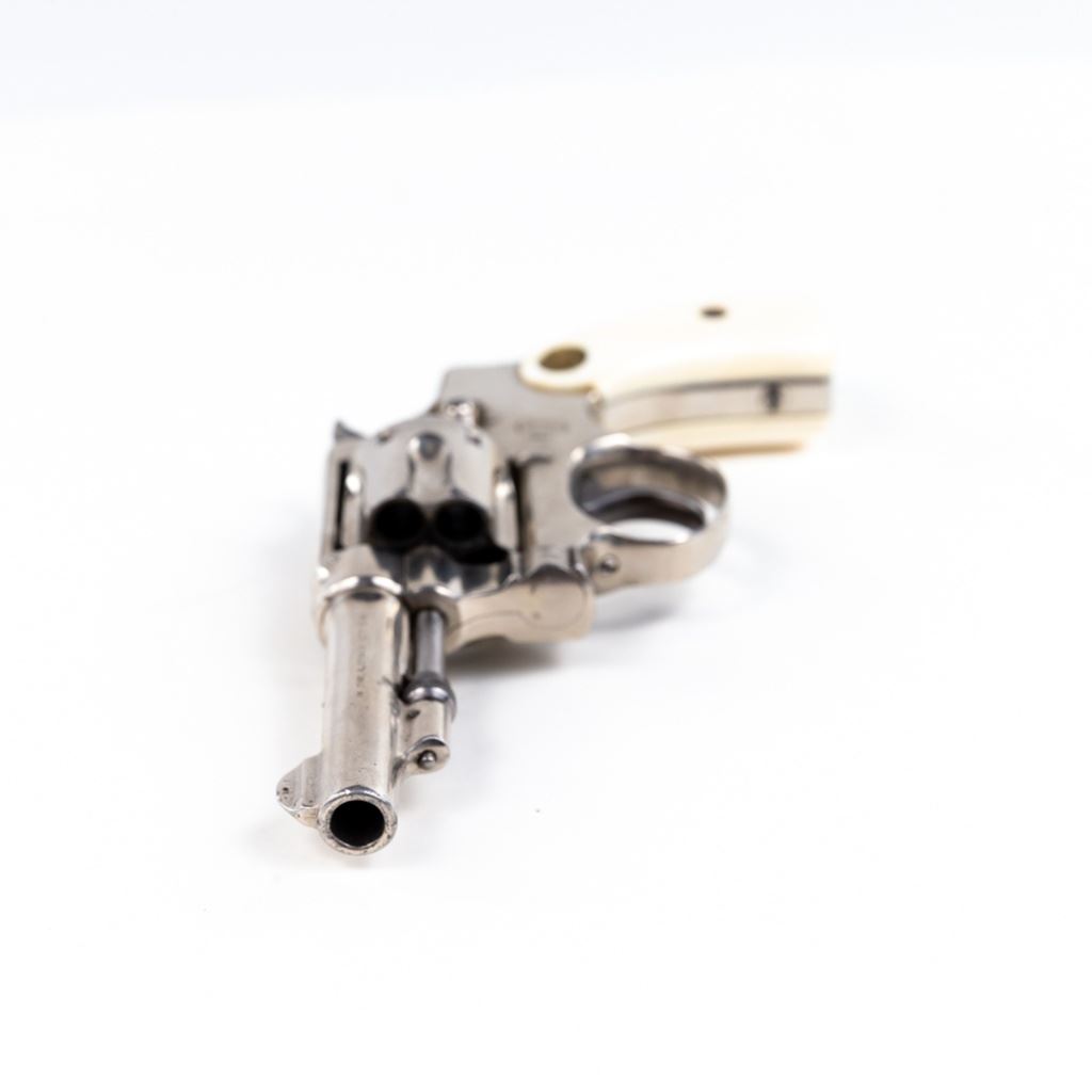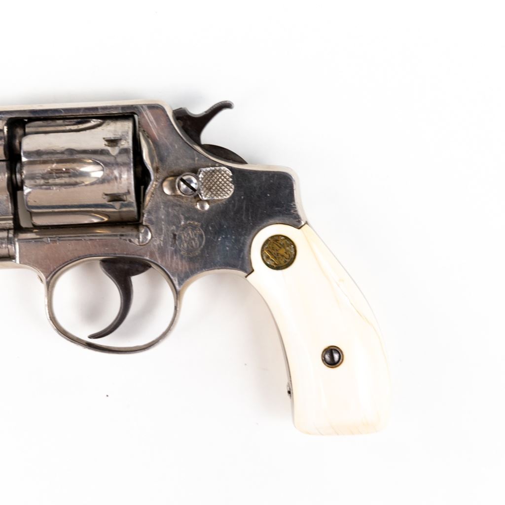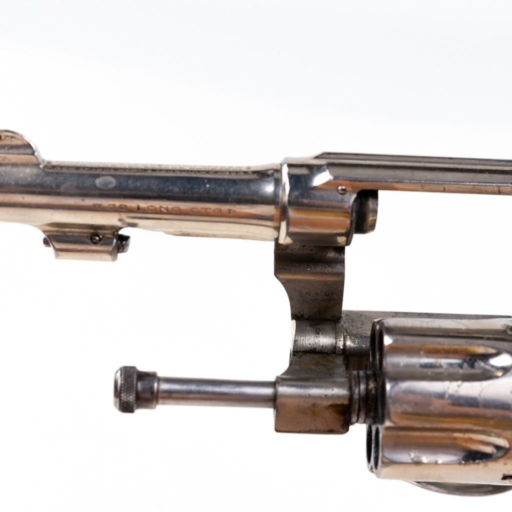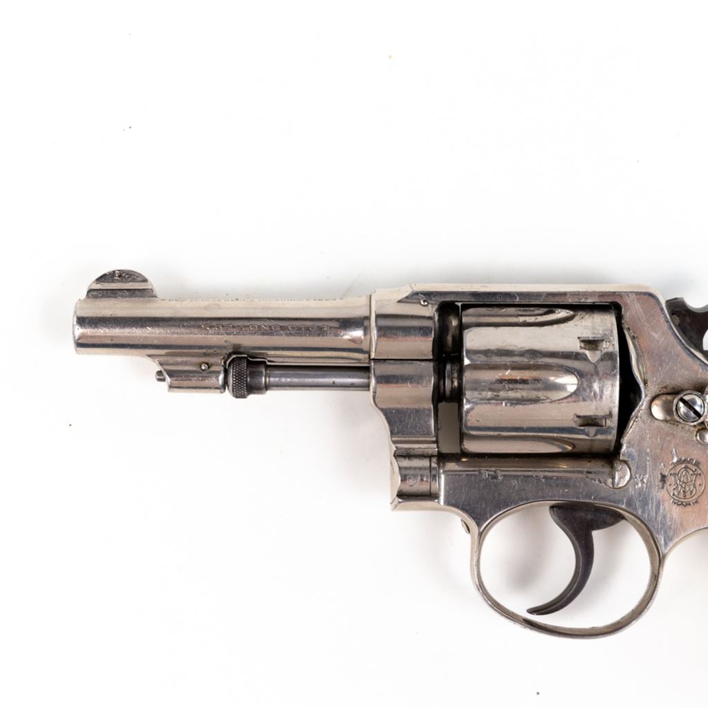 S&W 5-Screw Hand Ejector .32Long 3.25" Revolver in good condition with wear and "bubbling" nickel finish. several scratches. Timing is a little off. Includes leather holster. C&R Eligible S/N:30404