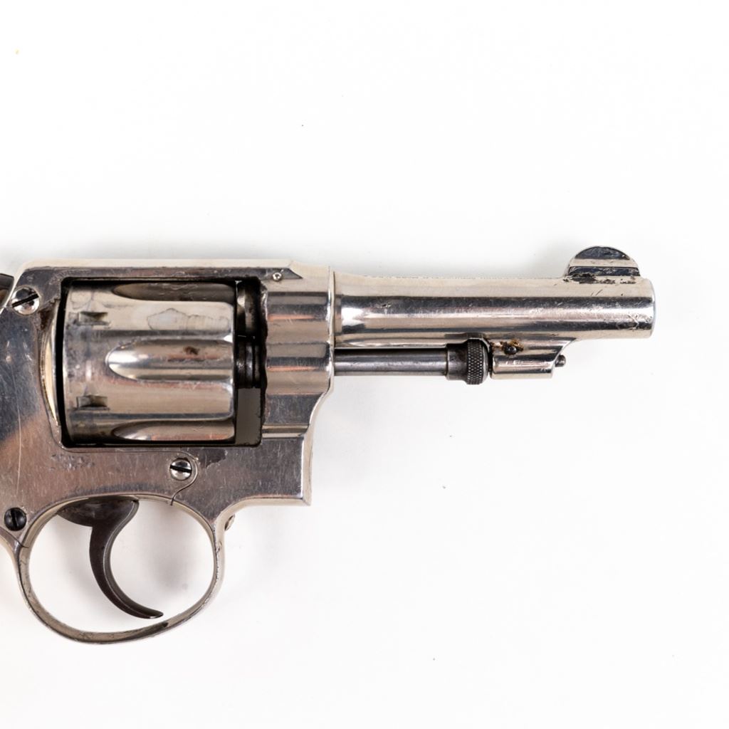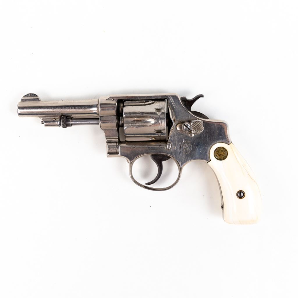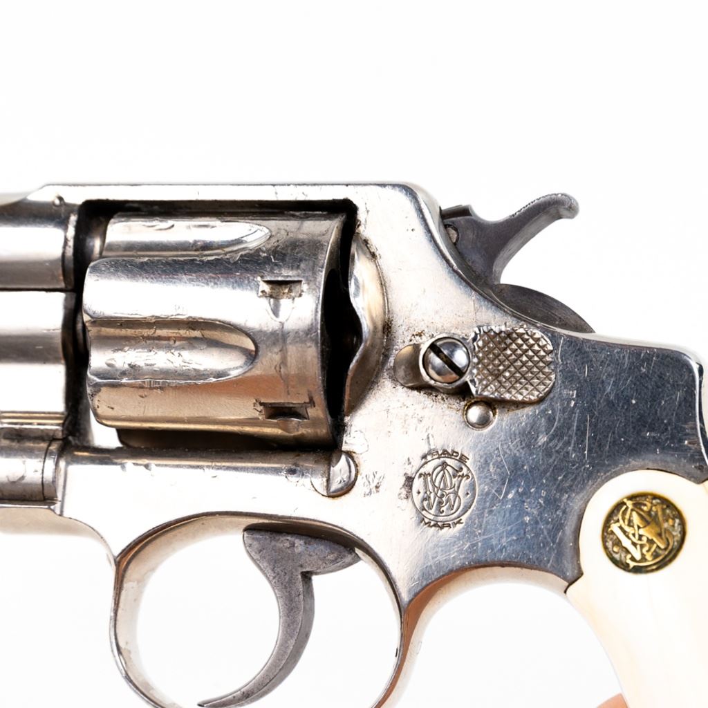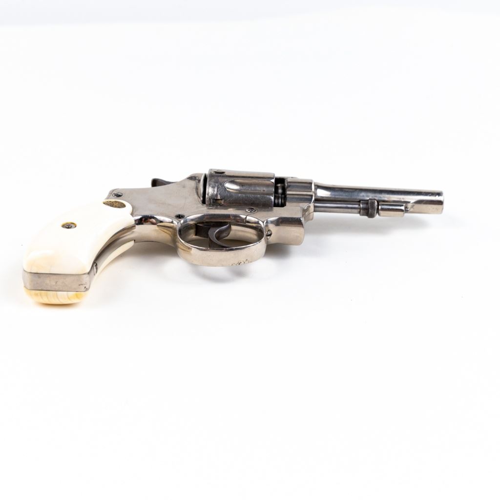 S&W 5-Screw Hand Ejector .32Long 3.25" Revolver in good condition with wear and "bubbling" nickel finish. several scratches. Timing is a little off. Includes leather holster. C&R Eligible S/N:30404