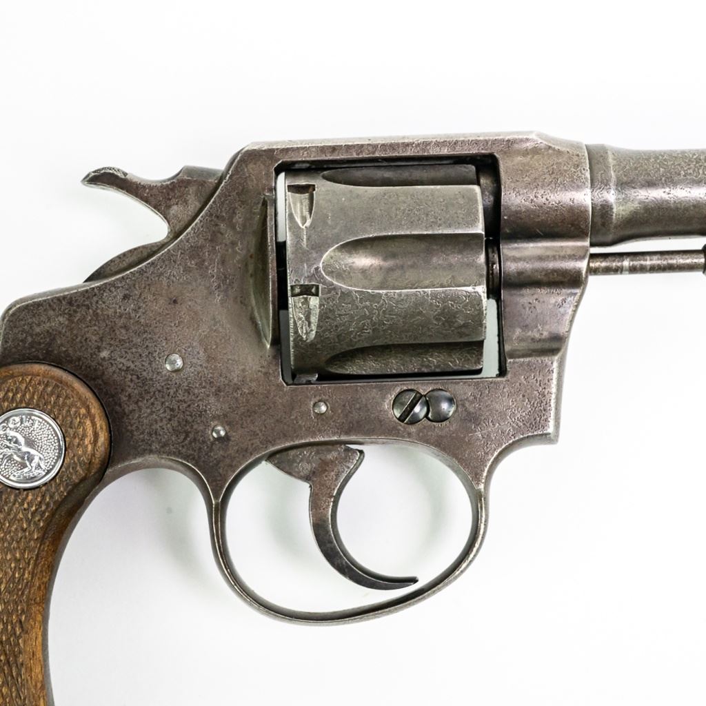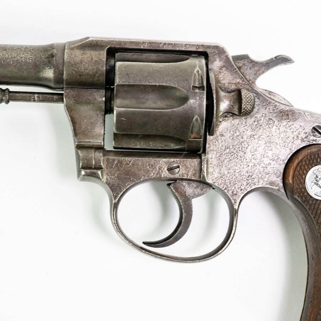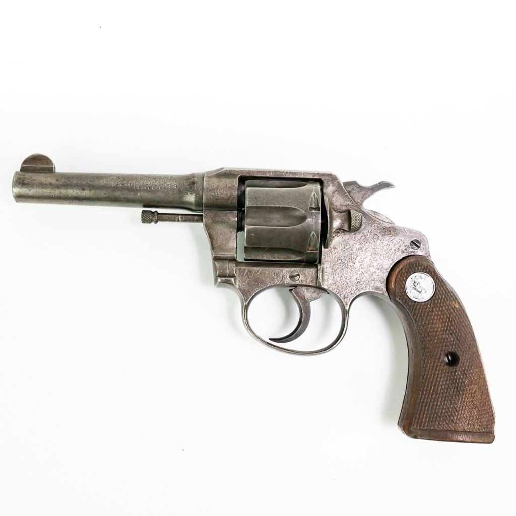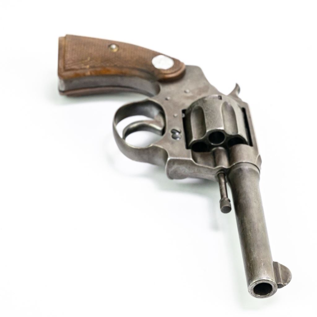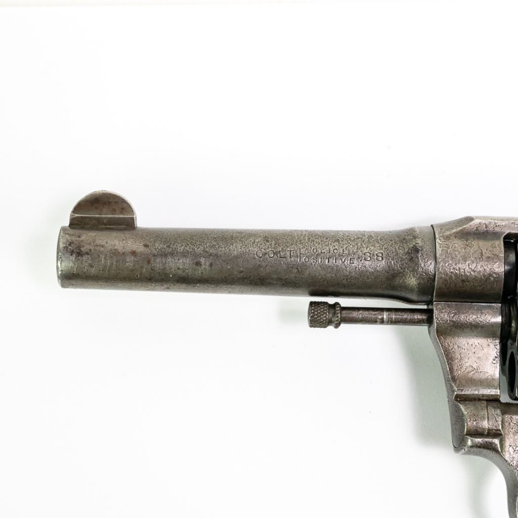 Colt Police Positive 38 4" Revolver in fair condition with wear and pitting. Action is tight and smooth. Back strap stamped "Am. RY. EXP." (American Railway Express) Left grip is chipped. MFG 1937 C&R Eligible S/N:156815