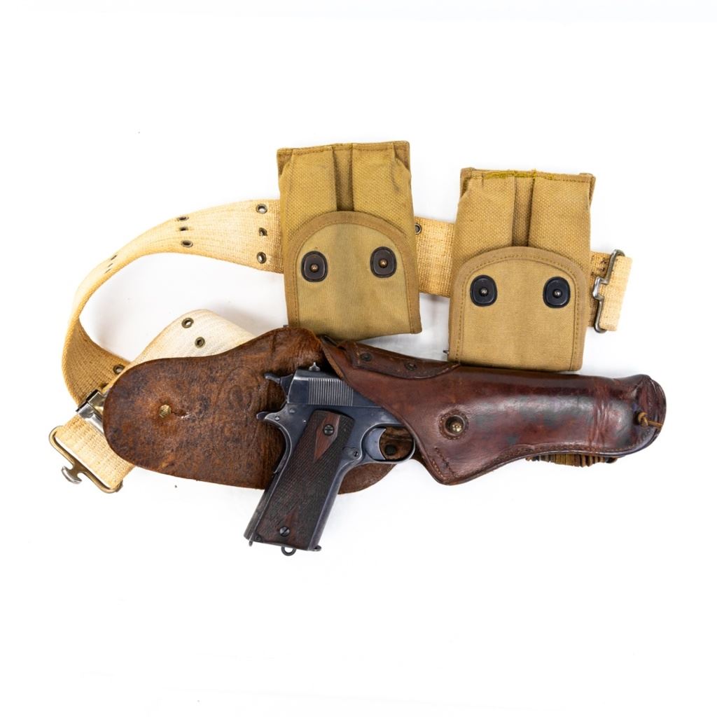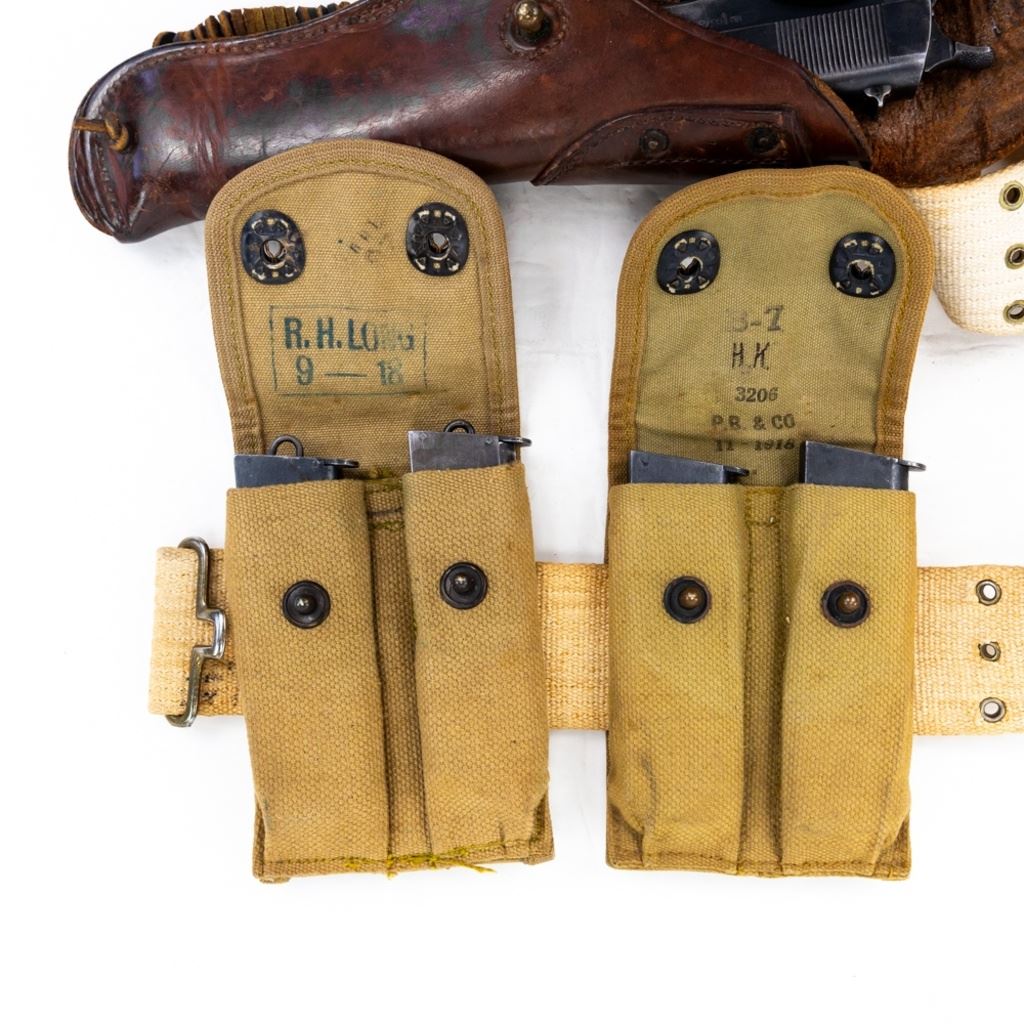 ULTRA RARE! 1915 WWI SPRINGFIELD1911 45 Pistol in very good vintage condition with wear . About 75-80% finish remains and the bore is BEAUTIFUL. The original folded and brazed floorplate WWI Springfield loop magazine is intact (RARE). Barrel:"S", stocks: Springfield Walnut, finish: blue/black, slide lock: milled cut "S", rear sight: flat top w/U notch, recoil spring guide: short legs, hammer: (S), main spring housing, grip safety, trigger: 1911, Ordnance bulls-eye bomb inspection marks on frame and slide, W.J. 1918 leather holster, R.H Long 9-18 mag pouch, P.B. & co 11-18 mag pouch, American Legion gun belt(?), 2x looped magazines, 2x other magazines (1x two tone)