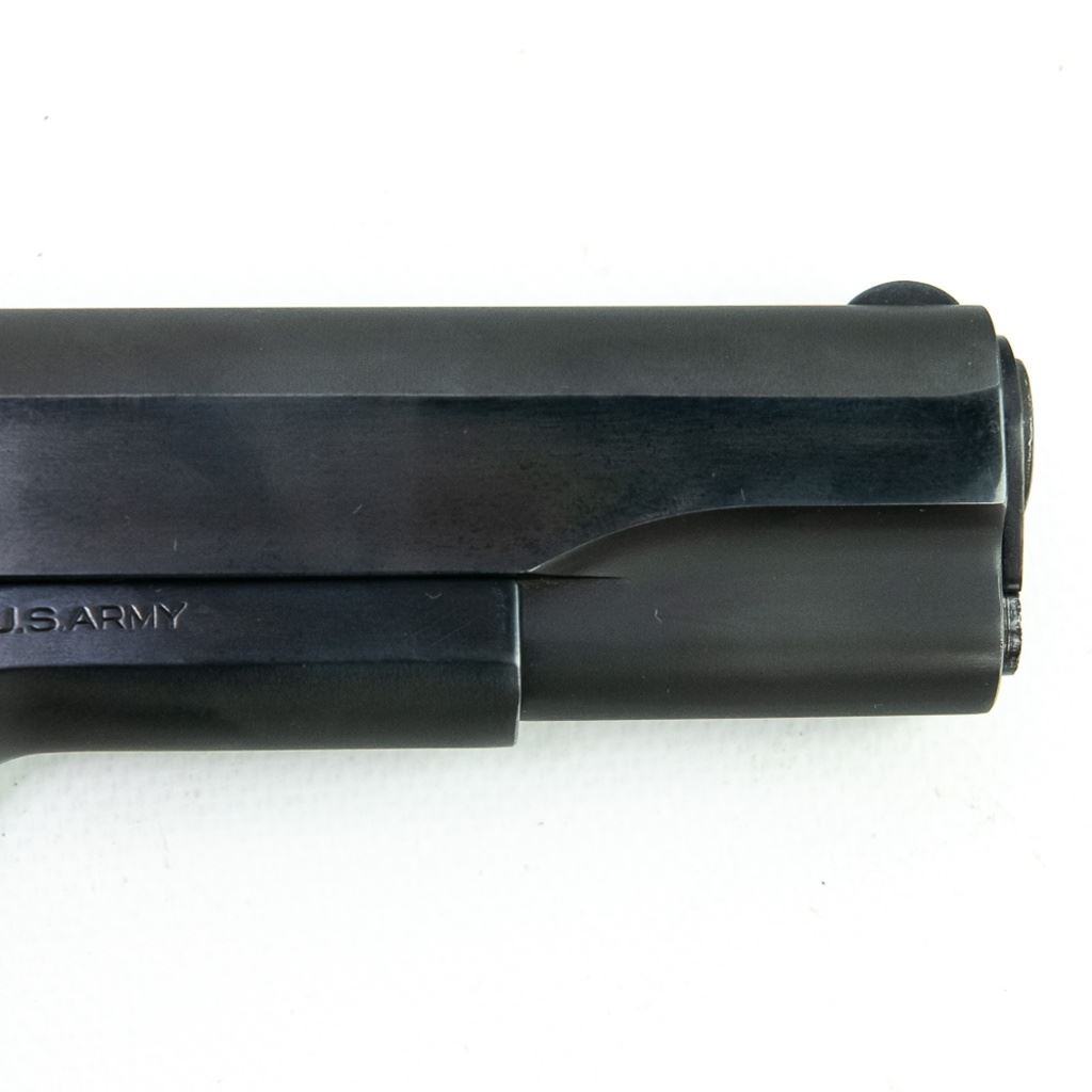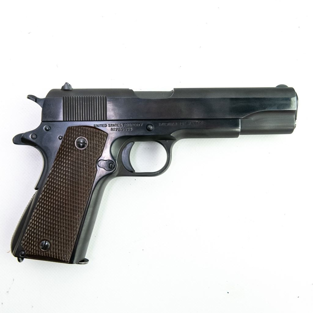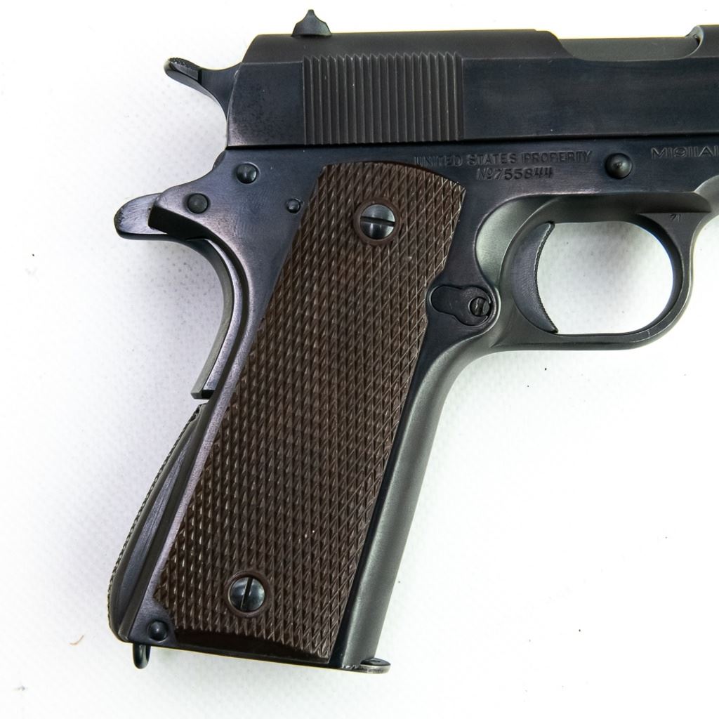 1941 WWII US Army Colt 1911A1 45acp Pistol in excellent professionally restored condition. The barrel has "S" "P" on lug and has an excellent lug, the slide has a square rear sight with a circular notch, there is a "P" in front of it and a "PN" on the underside. The frame has "WB" in a rectangle and a "P" by the mag release on the left side, "UNITED STATES PRODERTY M1911A1 U.S.ARMY" AND No755844 ON THE RIGHT SIDE,"H "G" on the top side. Very nice plastic grips. MFG 1941 C&R Eligible S/N:755844.