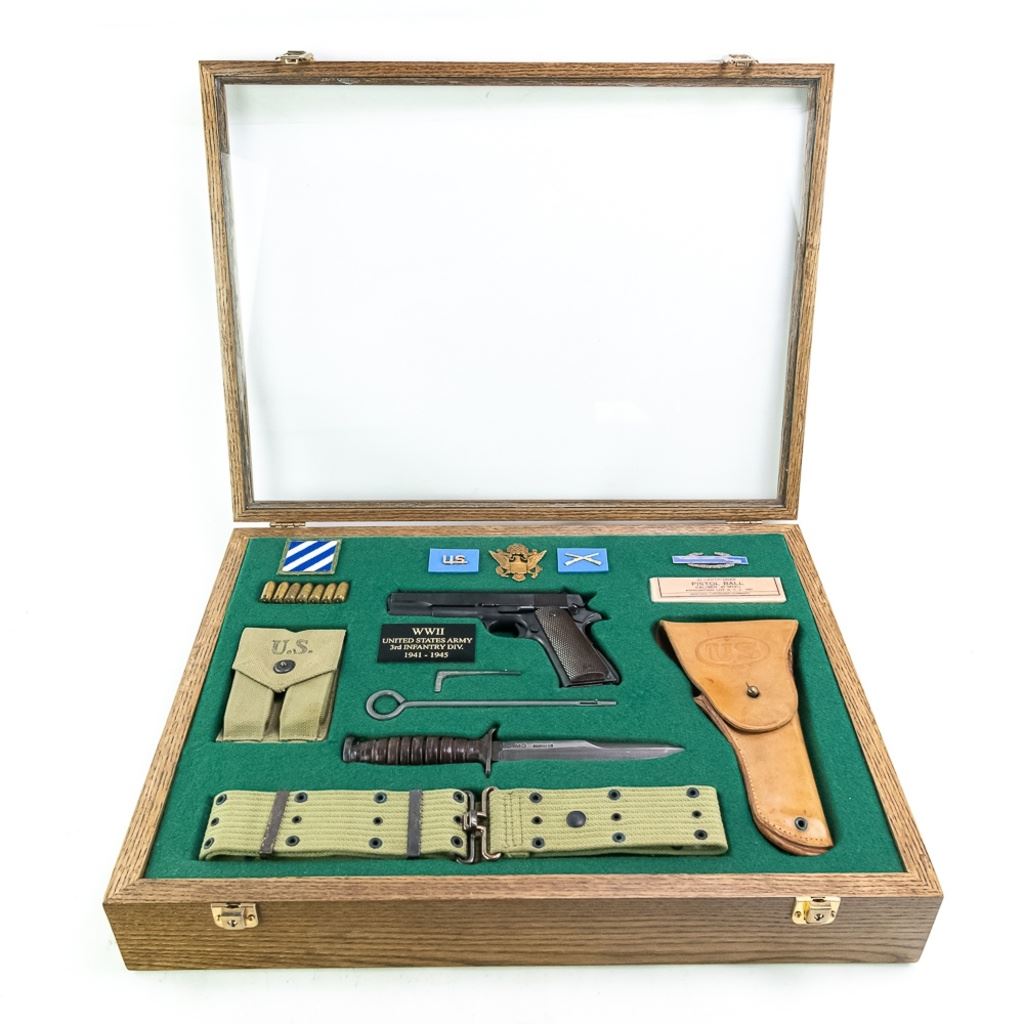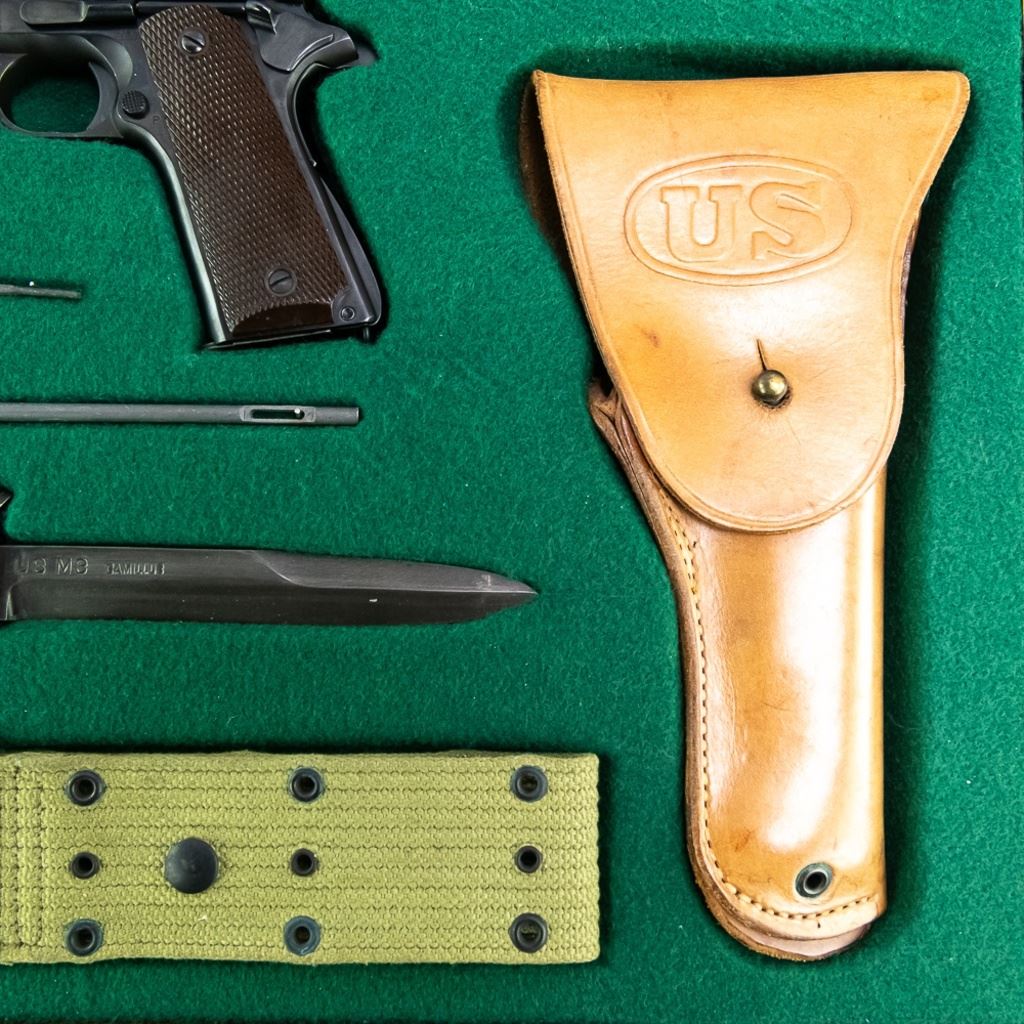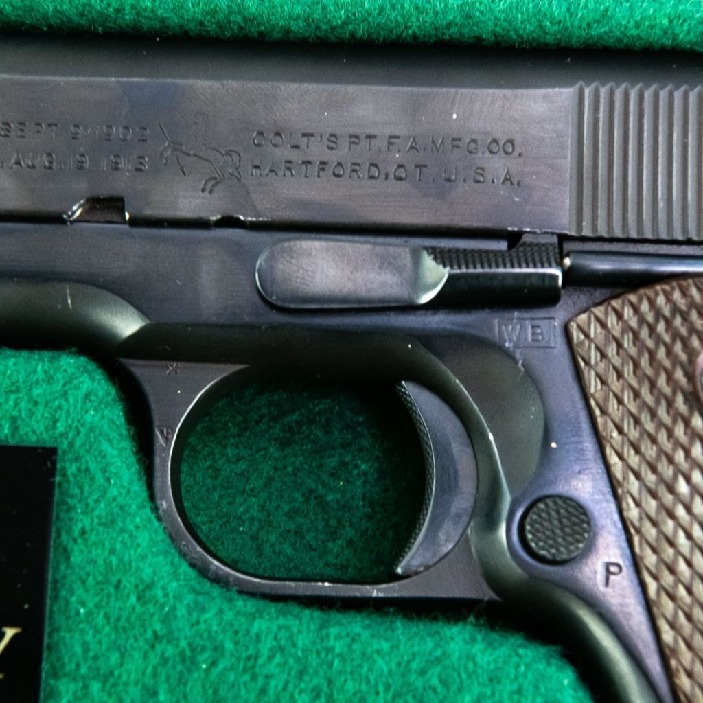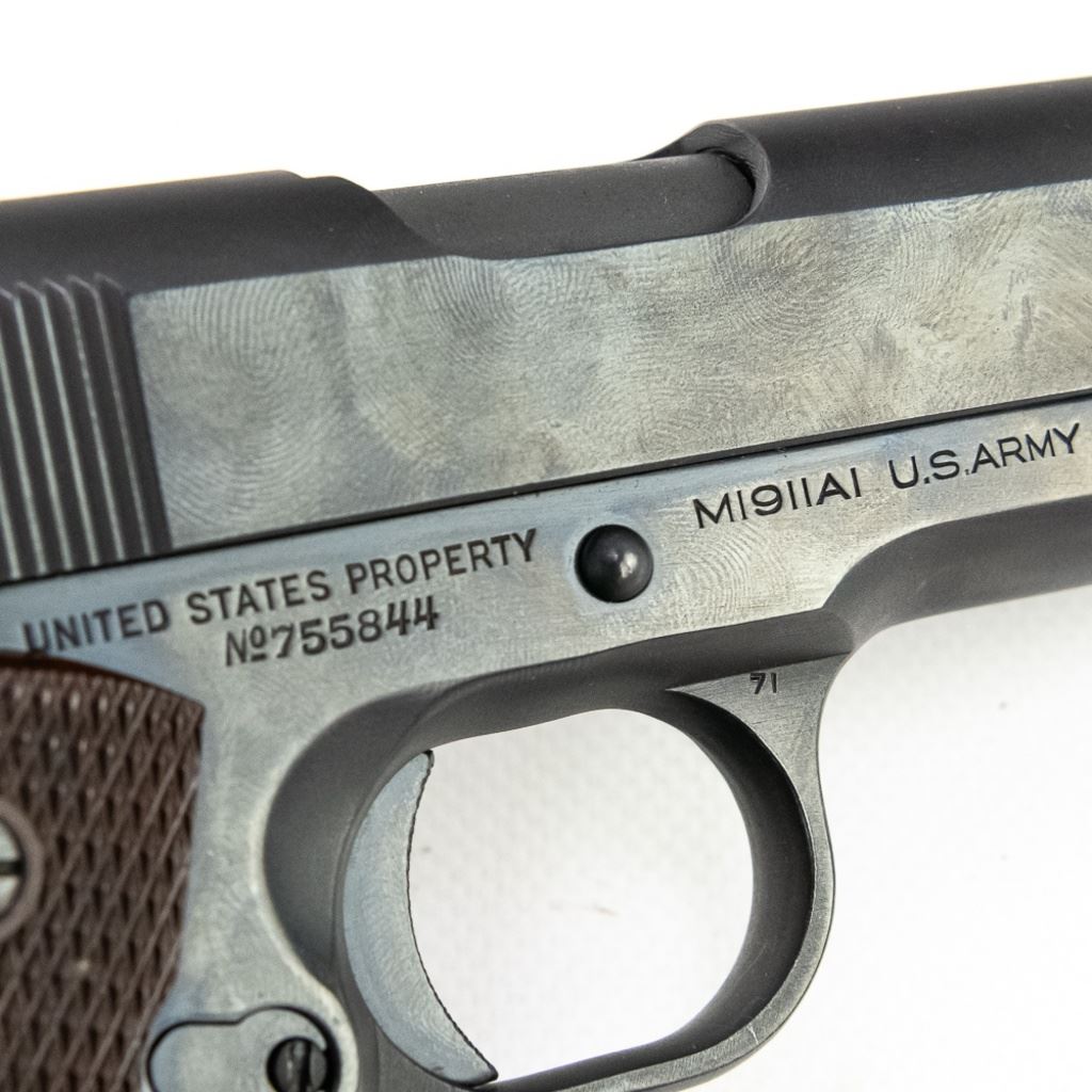 1941 WWII US Army Colt 1911A1 45acp Pistol in excellent professionally restored condition. The barrel has "S" "P" on lug and has an excellent lug, the slide has a square rear sight with a circular notch, there is a "P" in front of it and a "PN" on the underside. The frame has "WB" in a rectangle and a "P" by the mag release on the left side, "UNITED STATES PRODERTY M1911A1 U.S.ARMY" AND No755844 ON THE RIGHT SIDE,"H "G" on the top side. Very nice plastic grips. MFG 1941 C&R Eligible S/N:755844.
