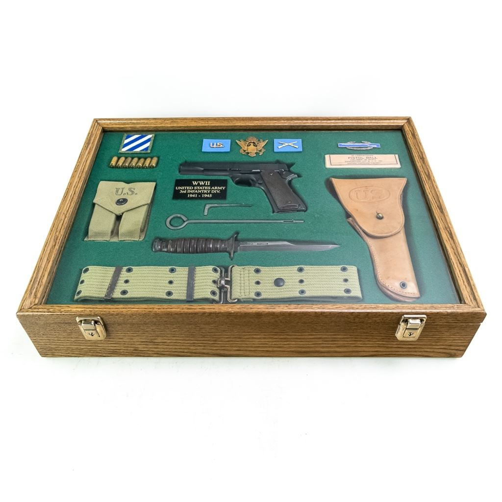 The display is housed in a custom made locking fitted oak case with glass top and includes: