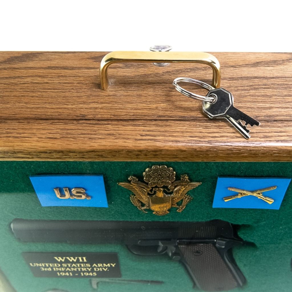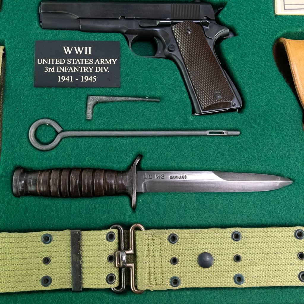 -insignia including U.S. Army 3rd Inf. Div. shoulder patch, Infantry collar DI's, and a heavy brass Army cap shield.1`