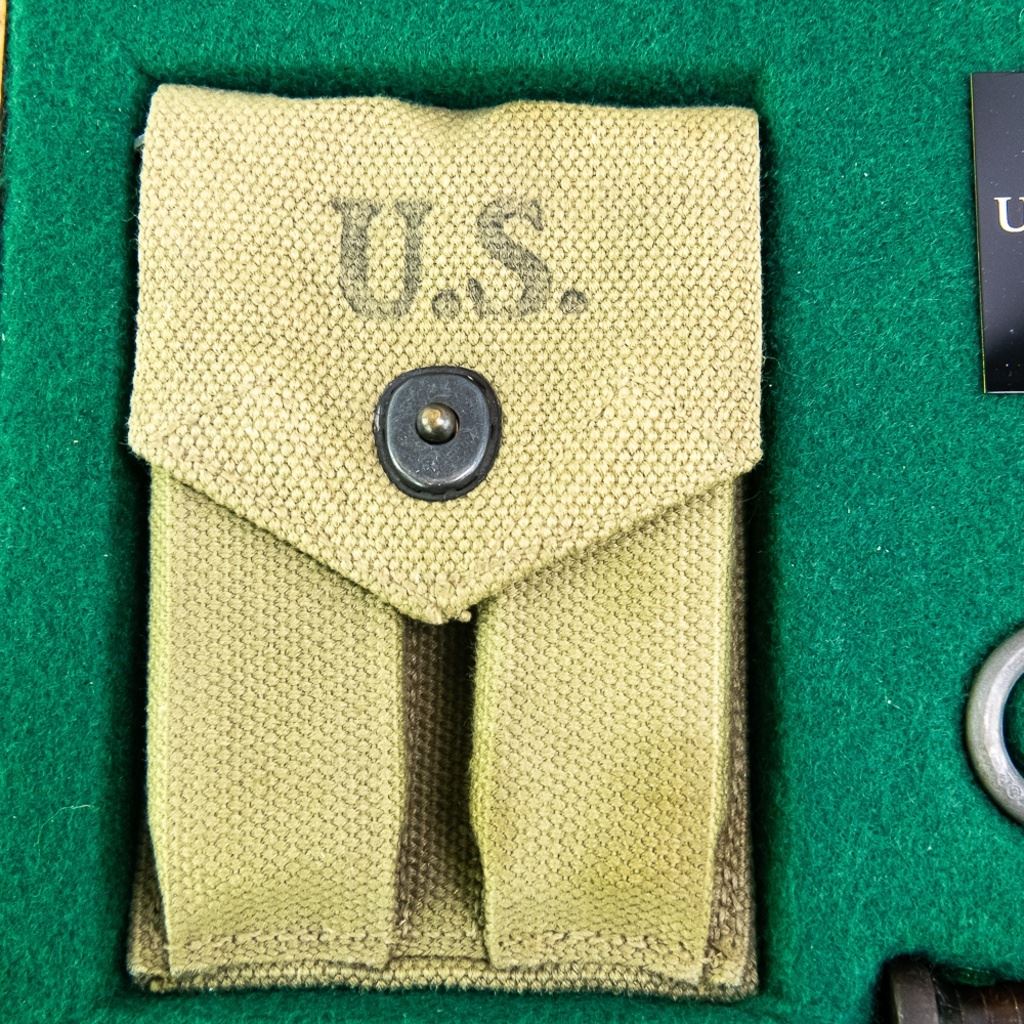 -OD canvas .45 2 magazine pouch marked Hoff Mfg. Co. 1942with 2 magazines (one two tone) in VG condition. This pouch attaches to the snap on the web belt.