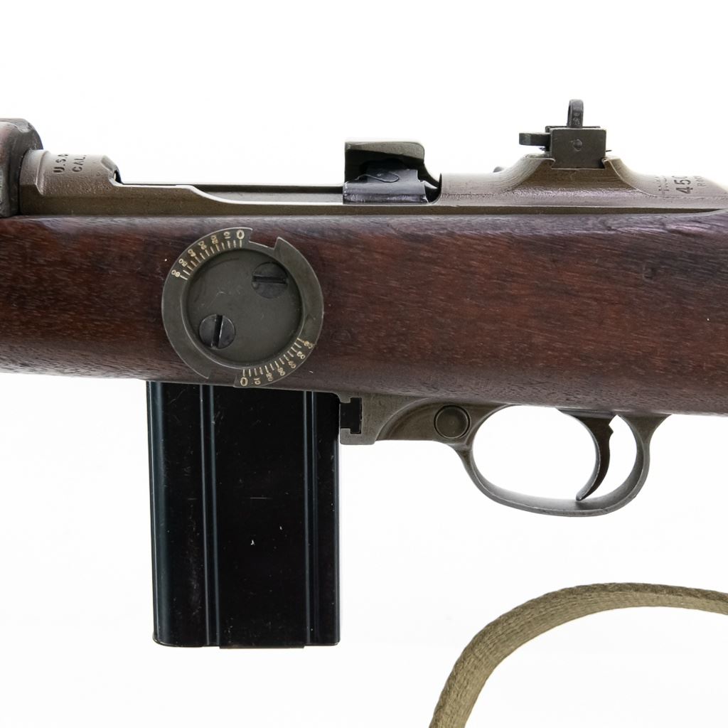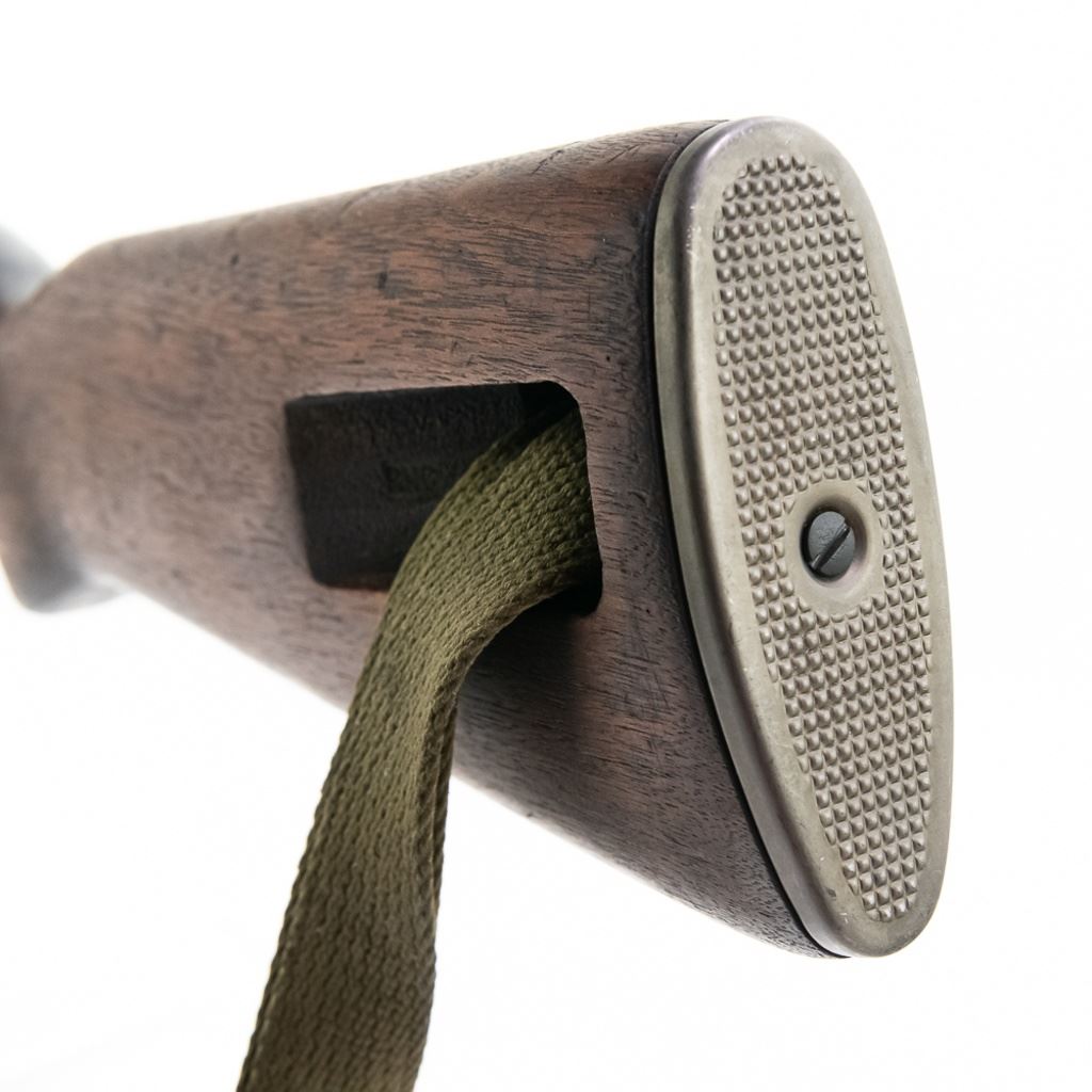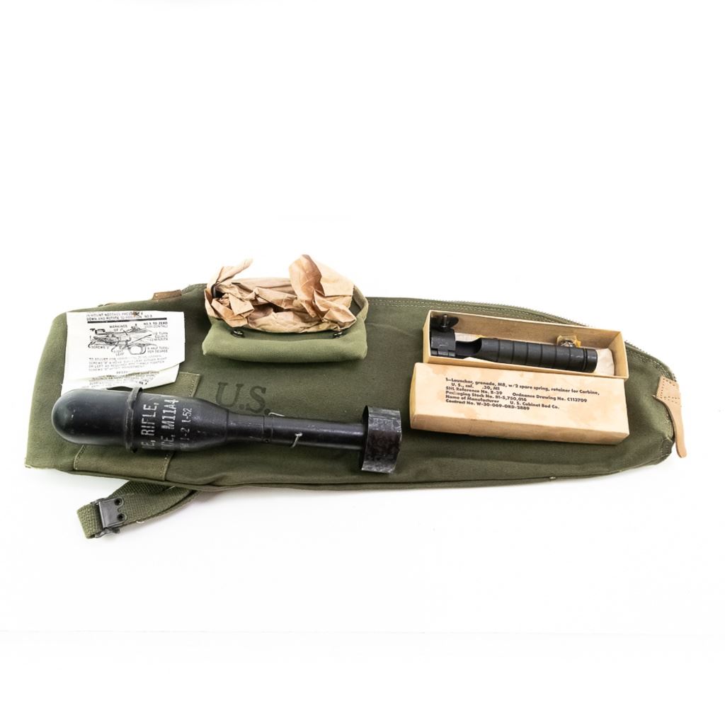Barrel: Rock-Ola 6-43, Stock: Type 1 I-cut High wood, RMC,RMC Crossed Cannons, paint "59", Handguard: RMC, Frt Sight: type-1 TR, Frt band: type 1, Sling: #2oiler IR, Slide: type 2 Rock-Ola, Early butt plate, Rear Sight: type 1 flip, Bolt: Rock-Ola, Trigger Housing: Rock-Ola, Safety: push, Mag catch & Hammer: BR, Mag: IR, Pouch: J.Q.M.D.1943 2mags IR,RC, Grenade launcher sight in pouch with instructions, Grenade Launcher in original box with wrappings, Practice M11A4 Grenade, Shane 1944 paratrooper case. C&R Eligible S/N:450931