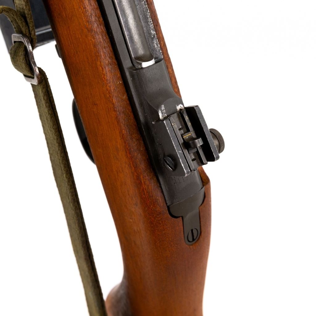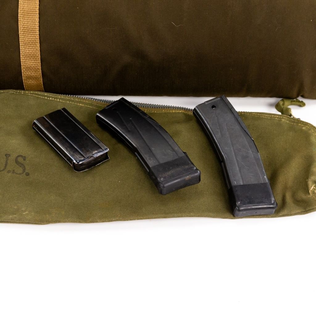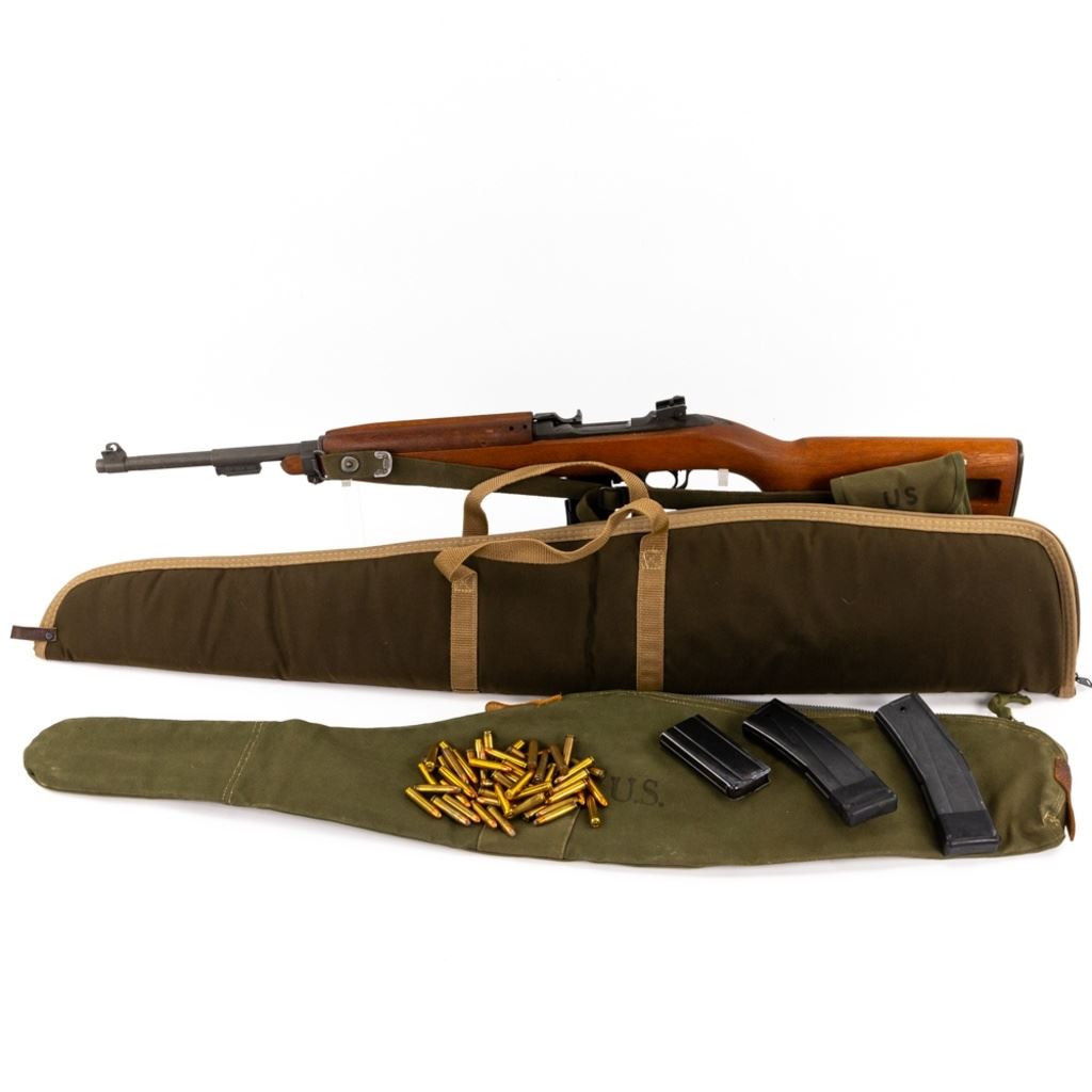 National Postal Meter M1 Carbine Last Variation 30 carbine Rifle in excellent condition with minor wear. The stock has no cartouches, has an Underwood barrel with "1944" & bomb also "R1115 SVV1101", rear adjustable sight with a "H" on a shield, toggle safety, mag release with a 'M' and "WA", barrel band with an "A" in a circle, front sight with a "N" in a square, Comes with a canvas sling, canvas US case, commercial case, 56rds ammo, 4x 15rd magazines, 2x 25rd magazines and a double US canvas mag pouch. MFG 1943-44 C&R Eligible S/N:4113767