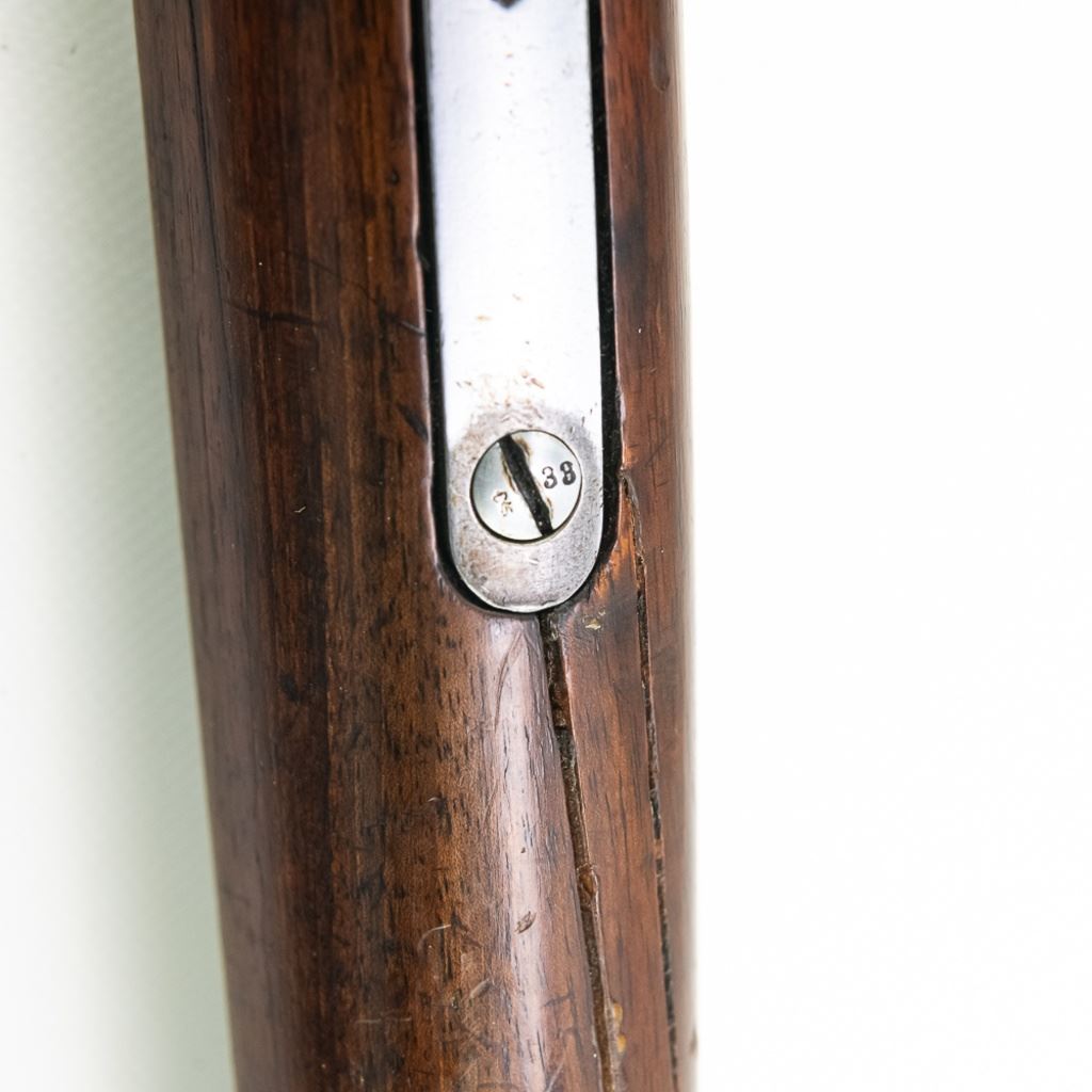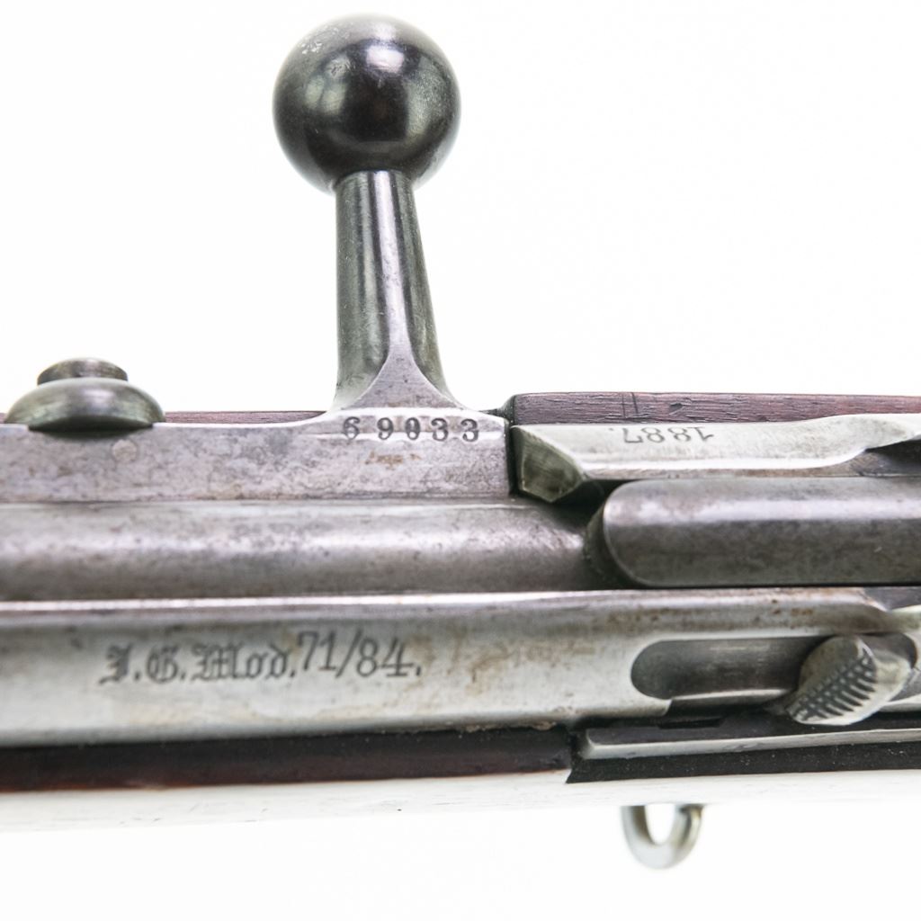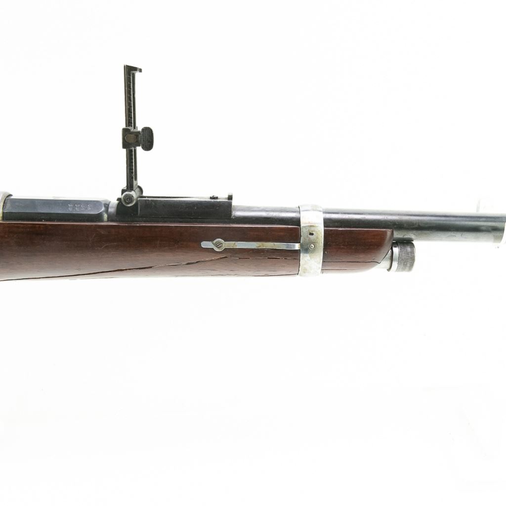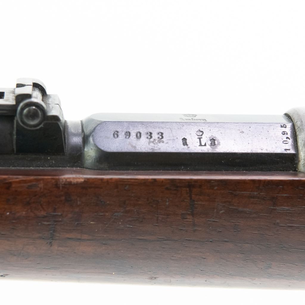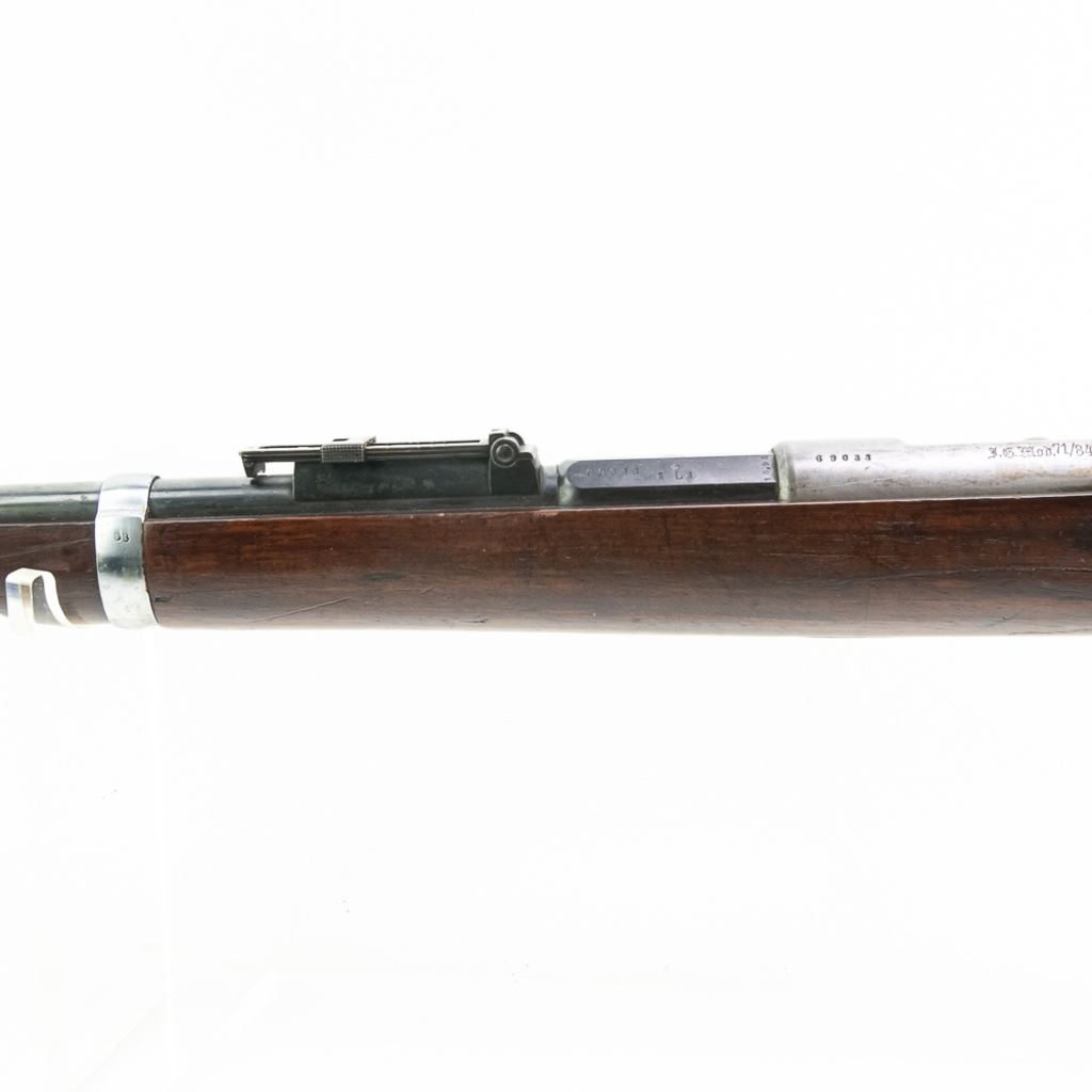Amberg M71/84 11mm Carbine in very good condition with wear and remnants of oxidation. The bore is excellent and shiny. There are a couple of cracks in the forearm. Several crowned proof marks. Numbers on the receiver, bolt, barrel, safety, trigger guard and trigger guard bolt, barrel band, magazine cap, rear sight, butt cap and screws, sling screws and bolt release all match. C&R Eligible S/N:69033