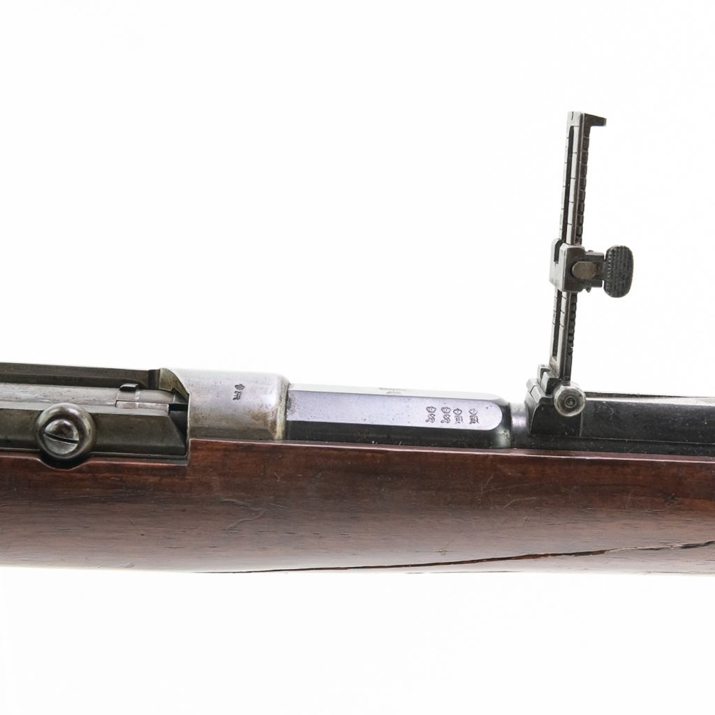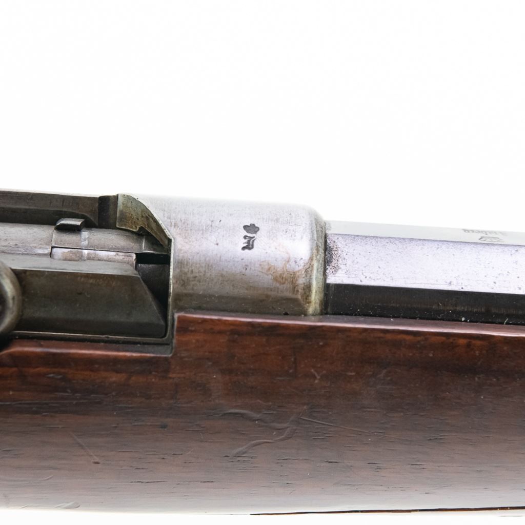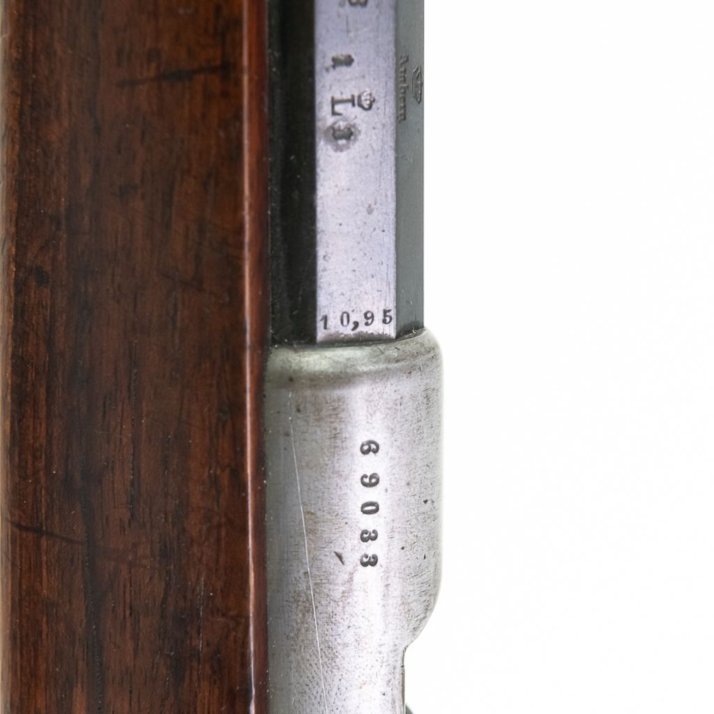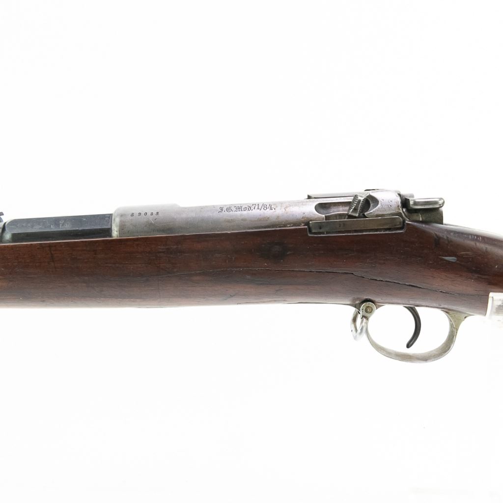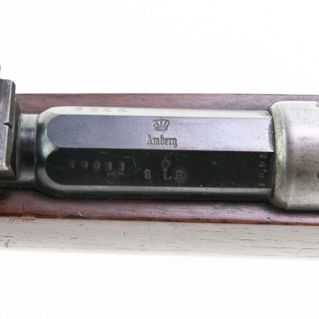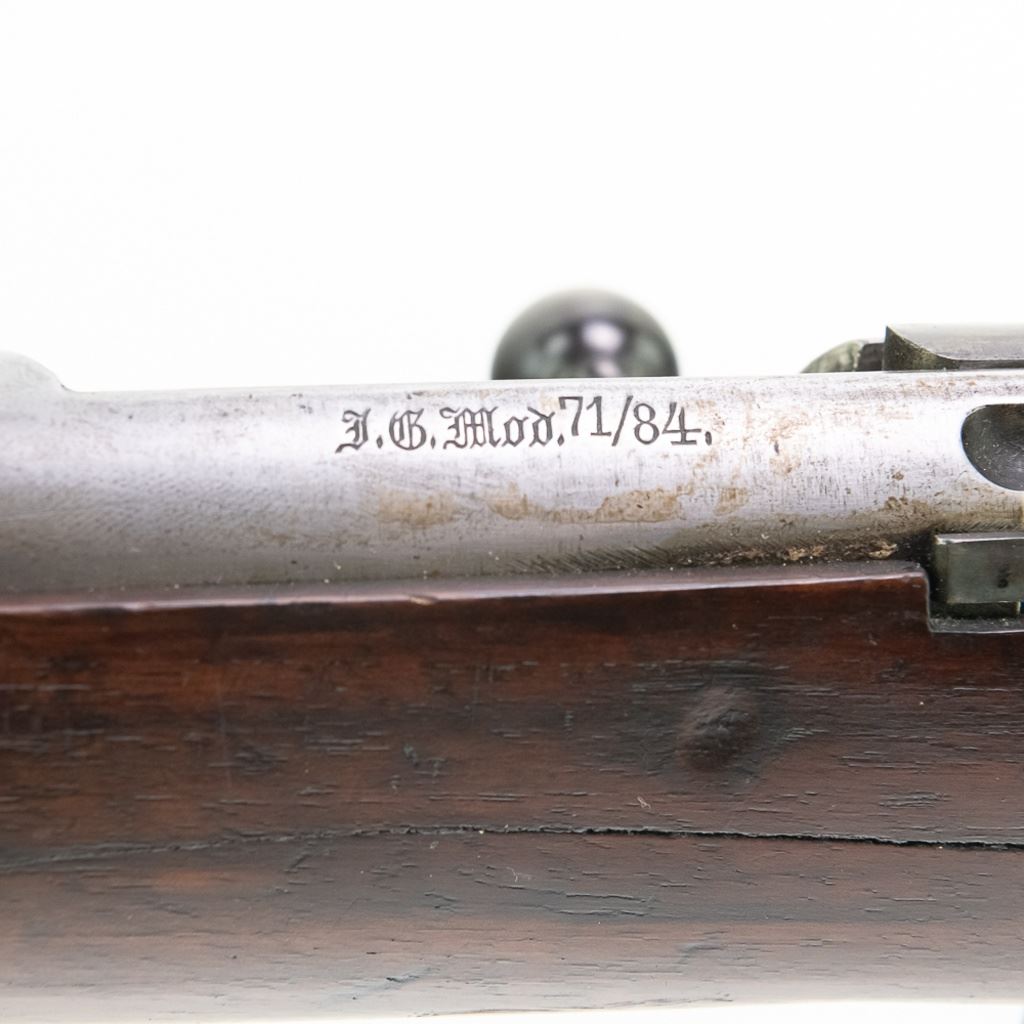 Amberg M71/84 11mm Carbine in very good condition with wear and remnants of oxidation. The bore is excellent and shiny. There are a couple of cracks in the forearm. Several crowned proof marks. Numbers on the receiver, bolt, barrel, safety, trigger guard and trigger guard bolt, barrel band, magazine cap, rear sight, butt cap and screws, sling screws and bolt release all match. C&R Eligible S/N:69033