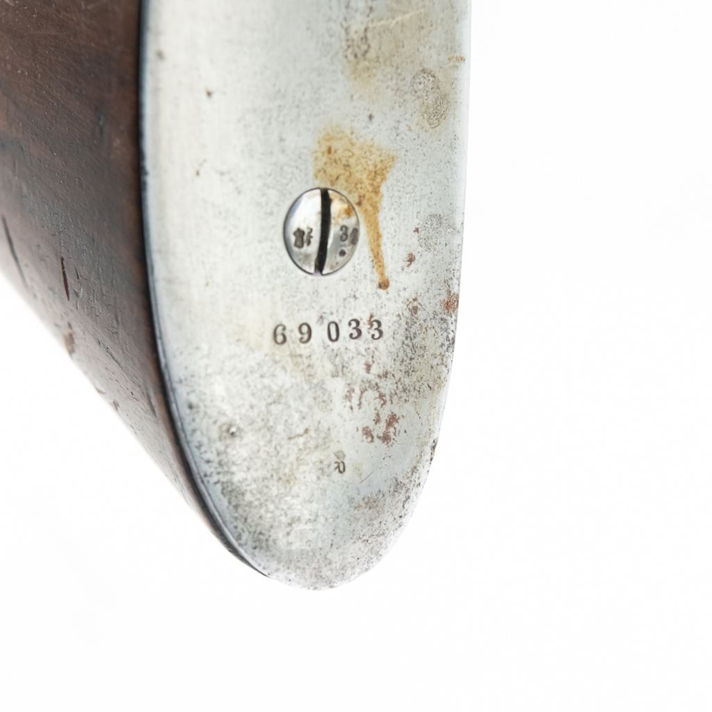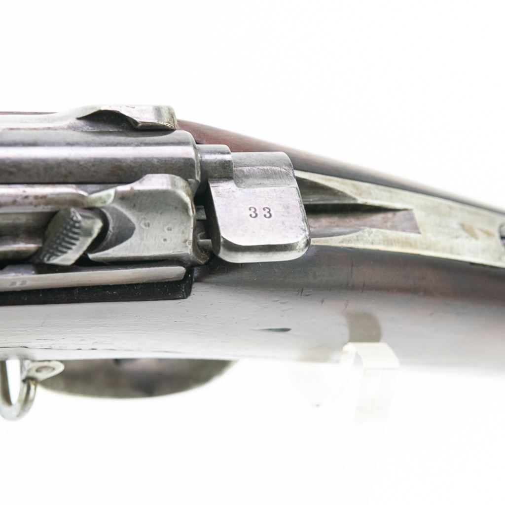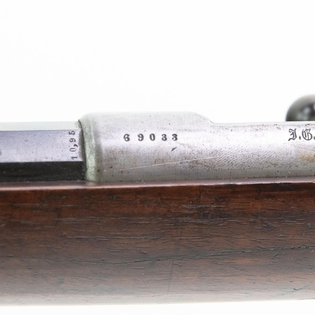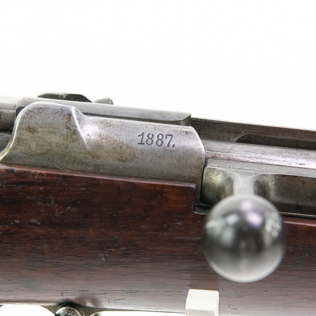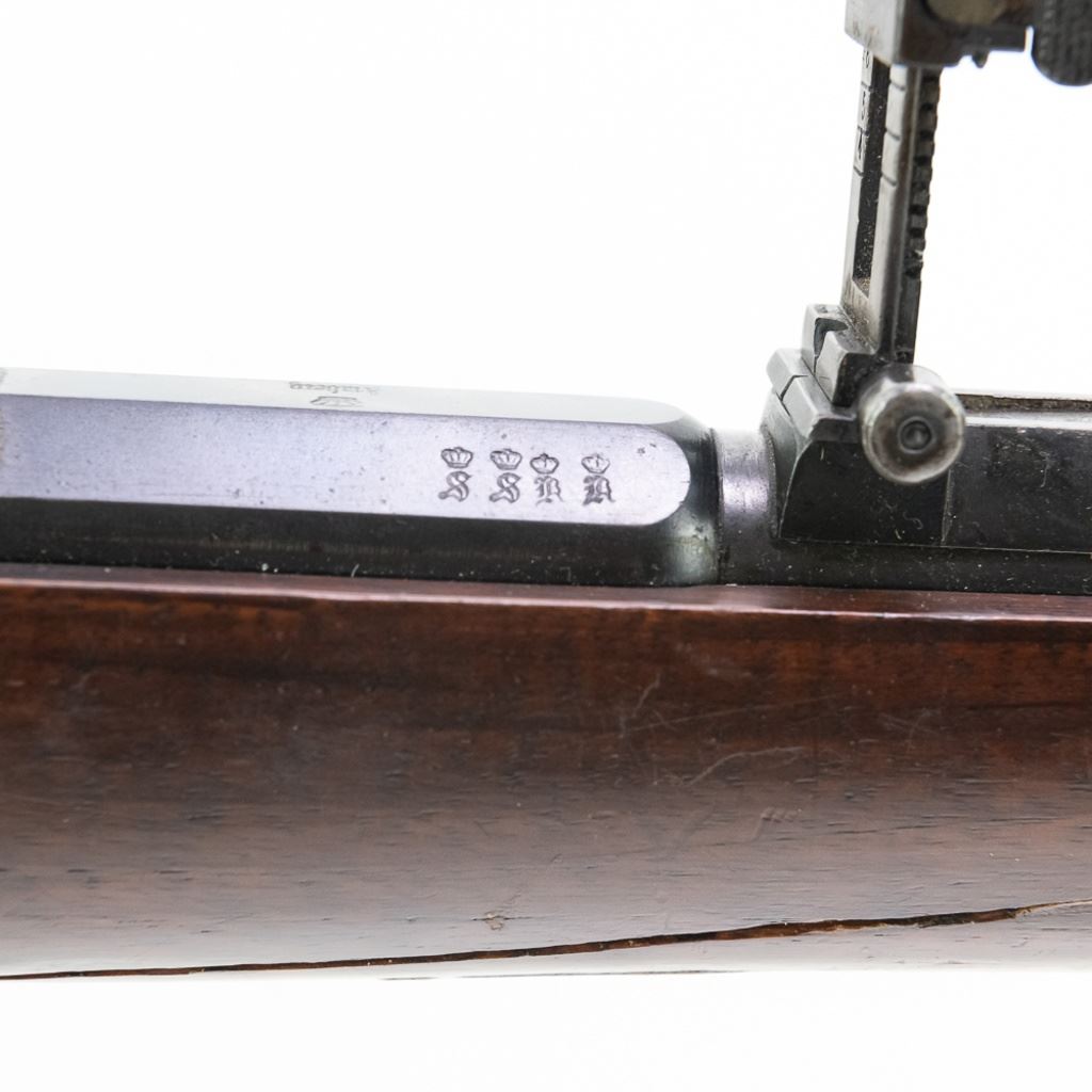 Amberg M71/84 11mm Carbine in very good condition with wear and remnants of oxidation. The bore is excellent and shiny. There are a couple of cracks in the forearm. Several crowned proof marks. Numbers on the receiver, bolt, barrel, safety, trigger guard and trigger guard bolt, barrel band, magazine cap, rear sight, butt cap and screws, sling screws and bolt release all match. C&R Eligible S/N:69033