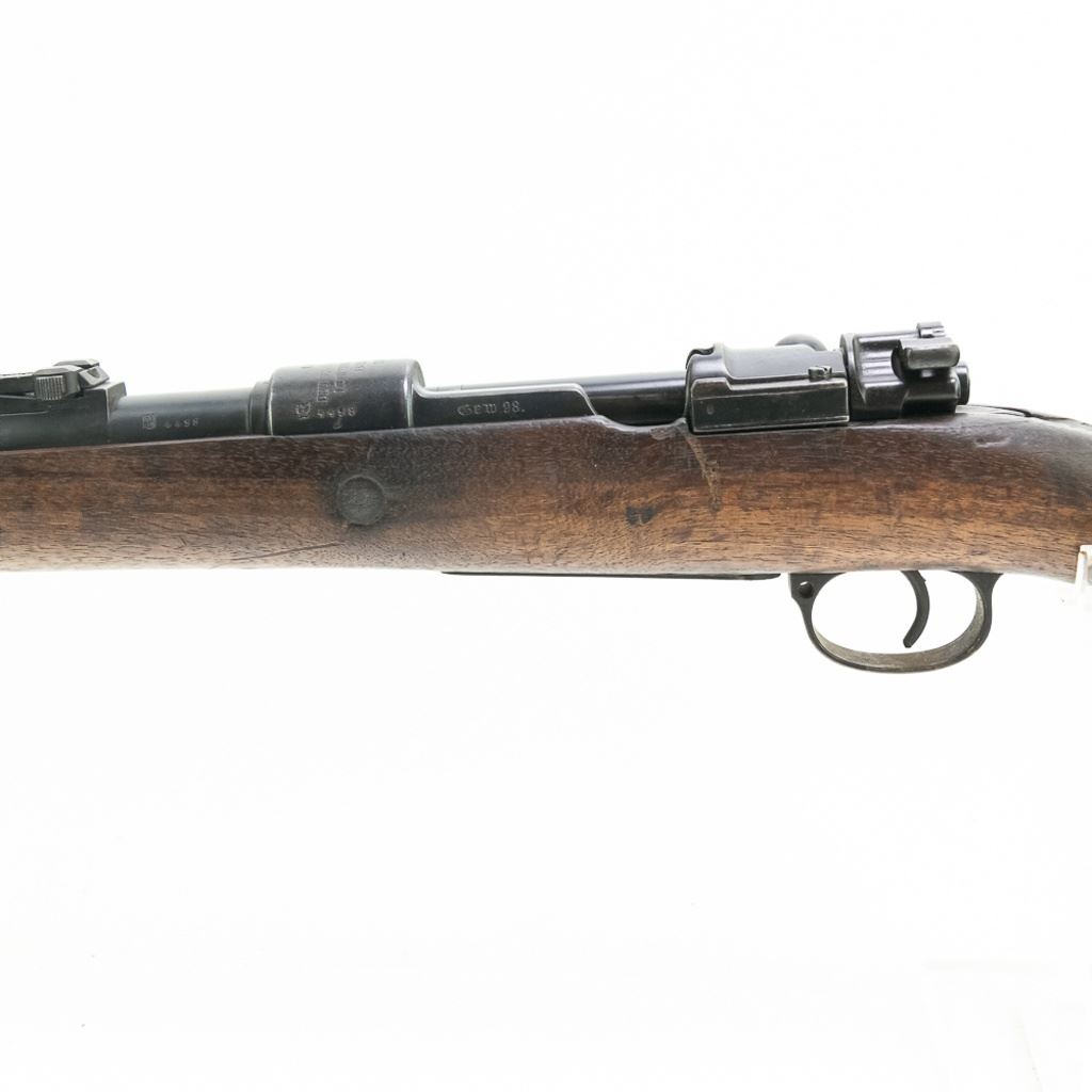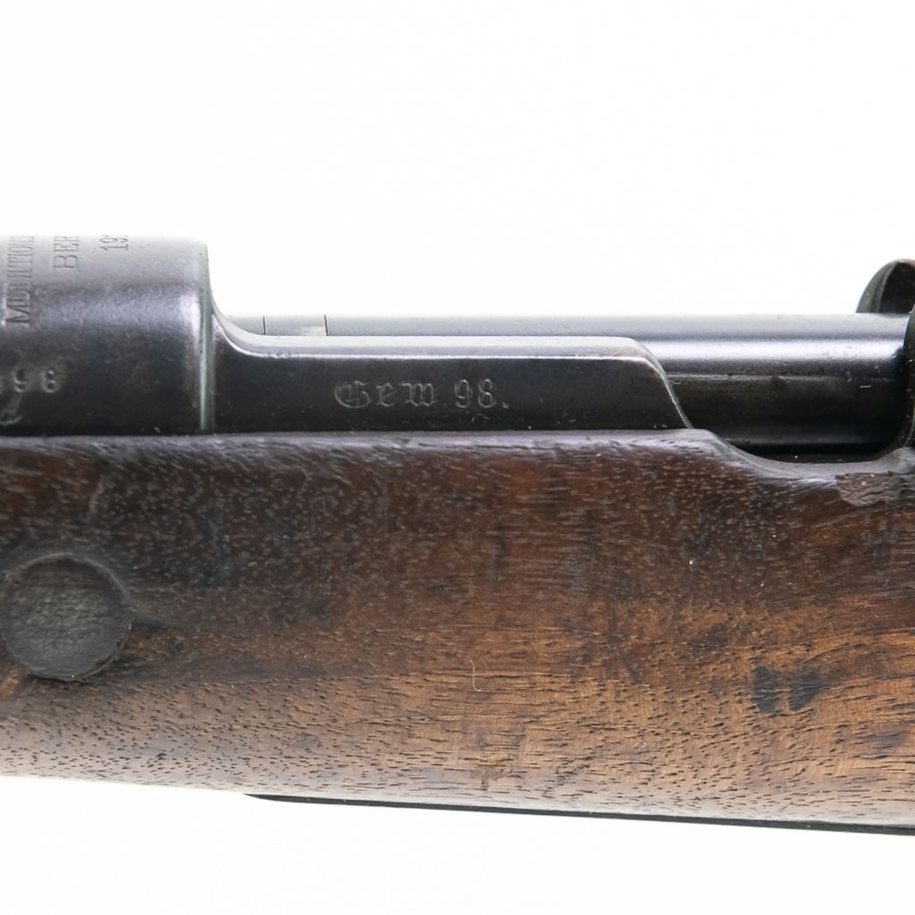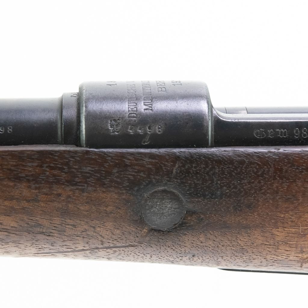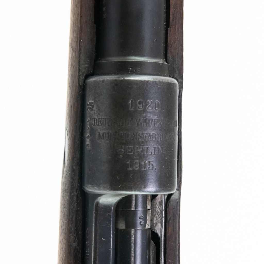 WWI 1915, 1920 REWORK Deutsche Waffen GEW98 8mm Rifle in good condition with wear. The bore has rifling and oxidation. Missing front sight blade and rear sling loop. Several German eagles and crowns proof-marks. Dual date stamps (1915,1920). Bolt, receiver, barrel, trigger-guard, magazine floor and rear sight all have matching numbers. MFG 1915 C&R Eligible S/N:4498
