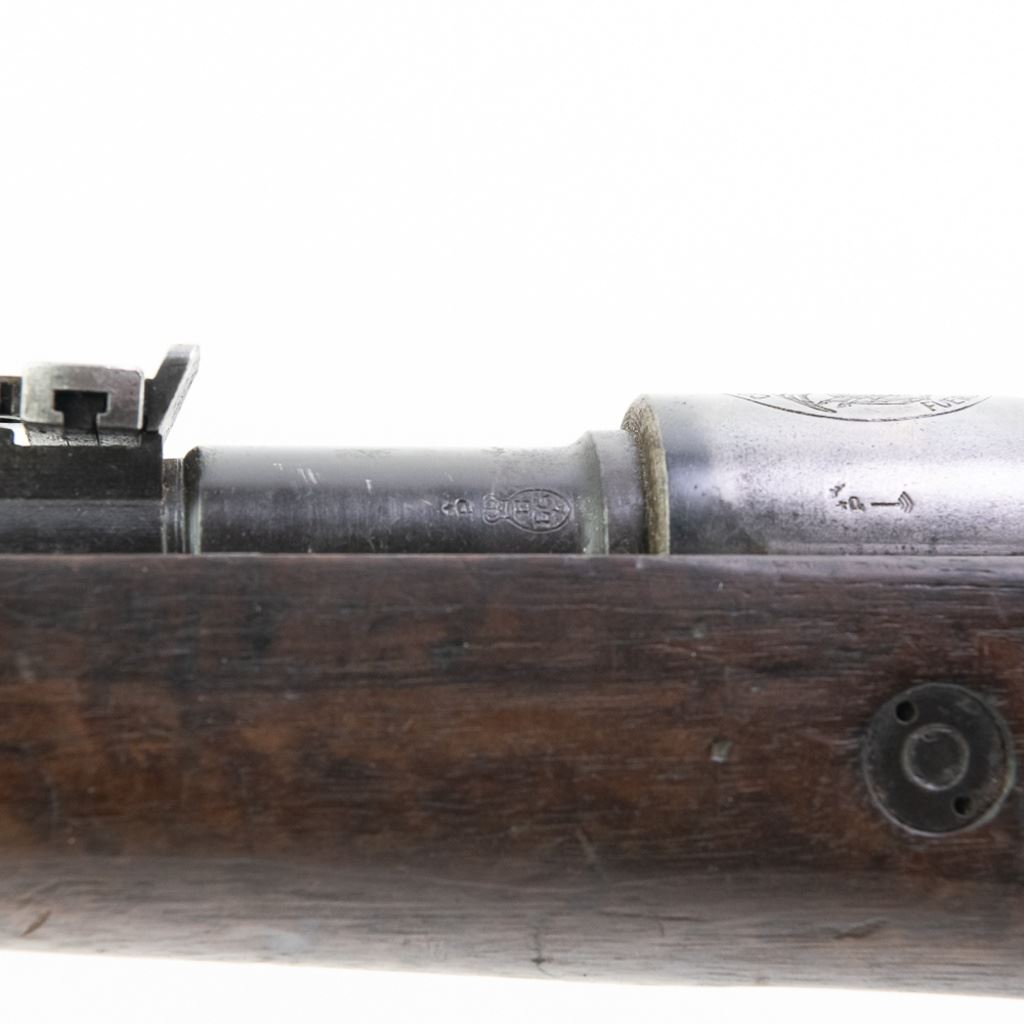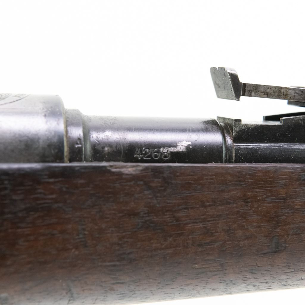 FN Colombian Mauser .30 Carbine in good condition with wear and oxidation. It is missing the top fore-end wood and band. The bore is very good. The barrel and receiver have matching numbers. The receiver is mostly in the white but the crest is sharp and pronounced. C&R Eligible S/N:4268