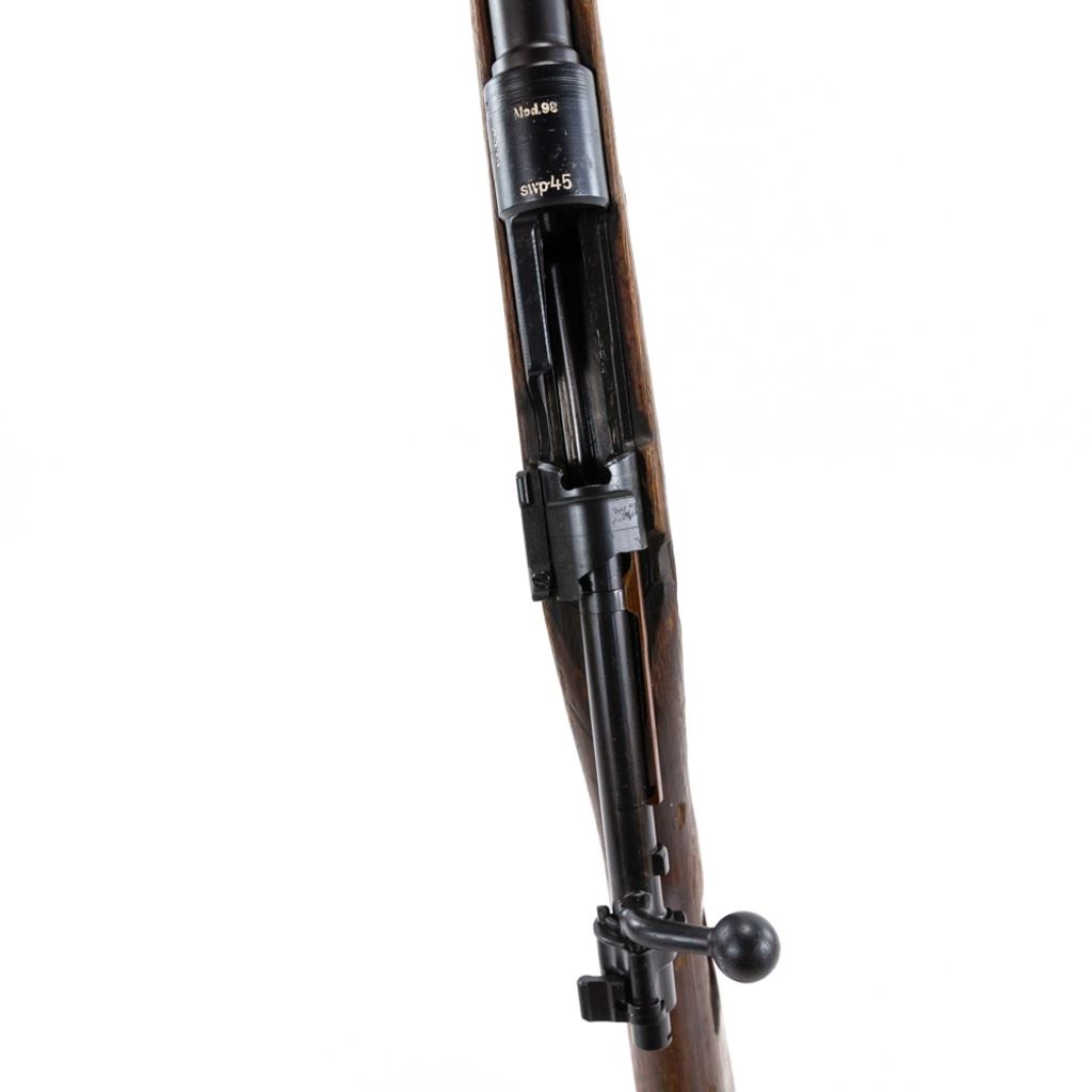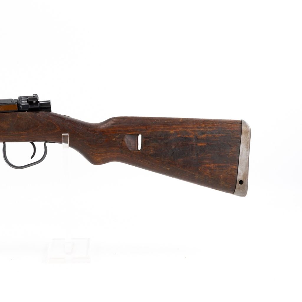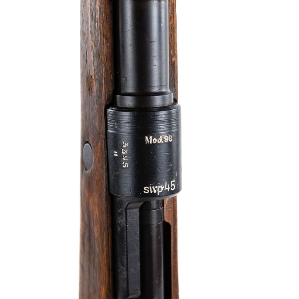 RARE!! Waffenwerke Brunn Brno swp45 M98 8mm Rifle in very good condition with some wear and oxidation. The bore is good with light frosting. This is arguably one of the rarest late war K98 variations - an SWP 45 coded rifle, made in the closing days of WWII at the Czech Waffenfabric Brunn arsenal which produced K98s for the Wermacht towards the end of the war. There were two late war variants made - one with a sheet metal rear sight and one with an adjustable rear sight. This is an adjustable rear sight variant and is actually the rarer of the two. Most of these had some sort of post WWII usage with Czechoslovakian forces or Israeli forces. Interesting Ethiopian medallion embedded in the rear stock. C&R Eligible S/N:3395