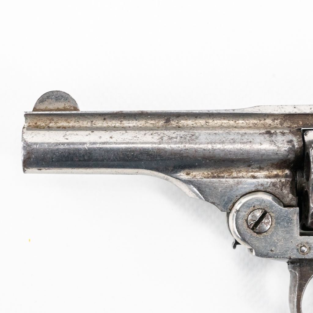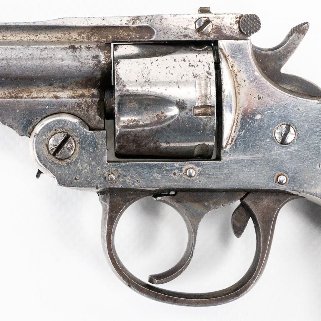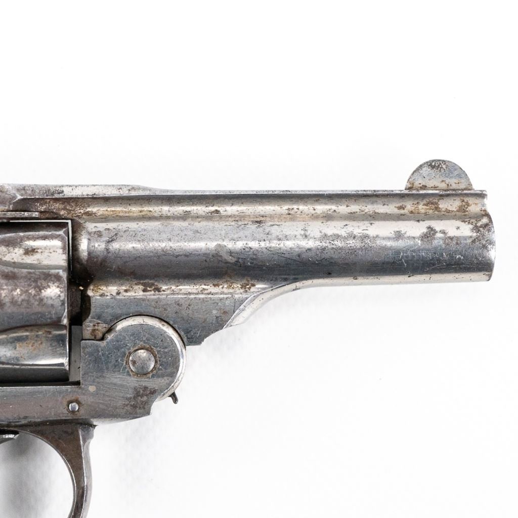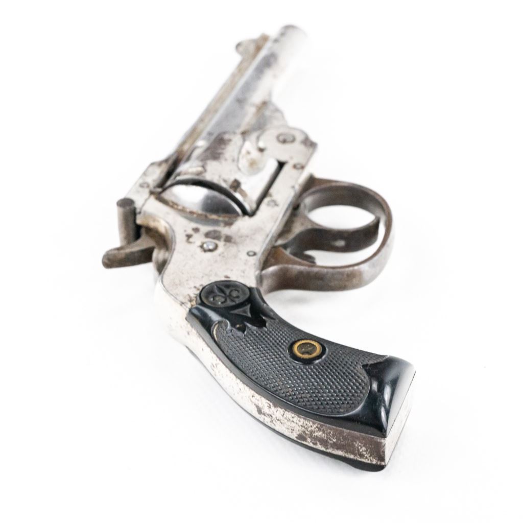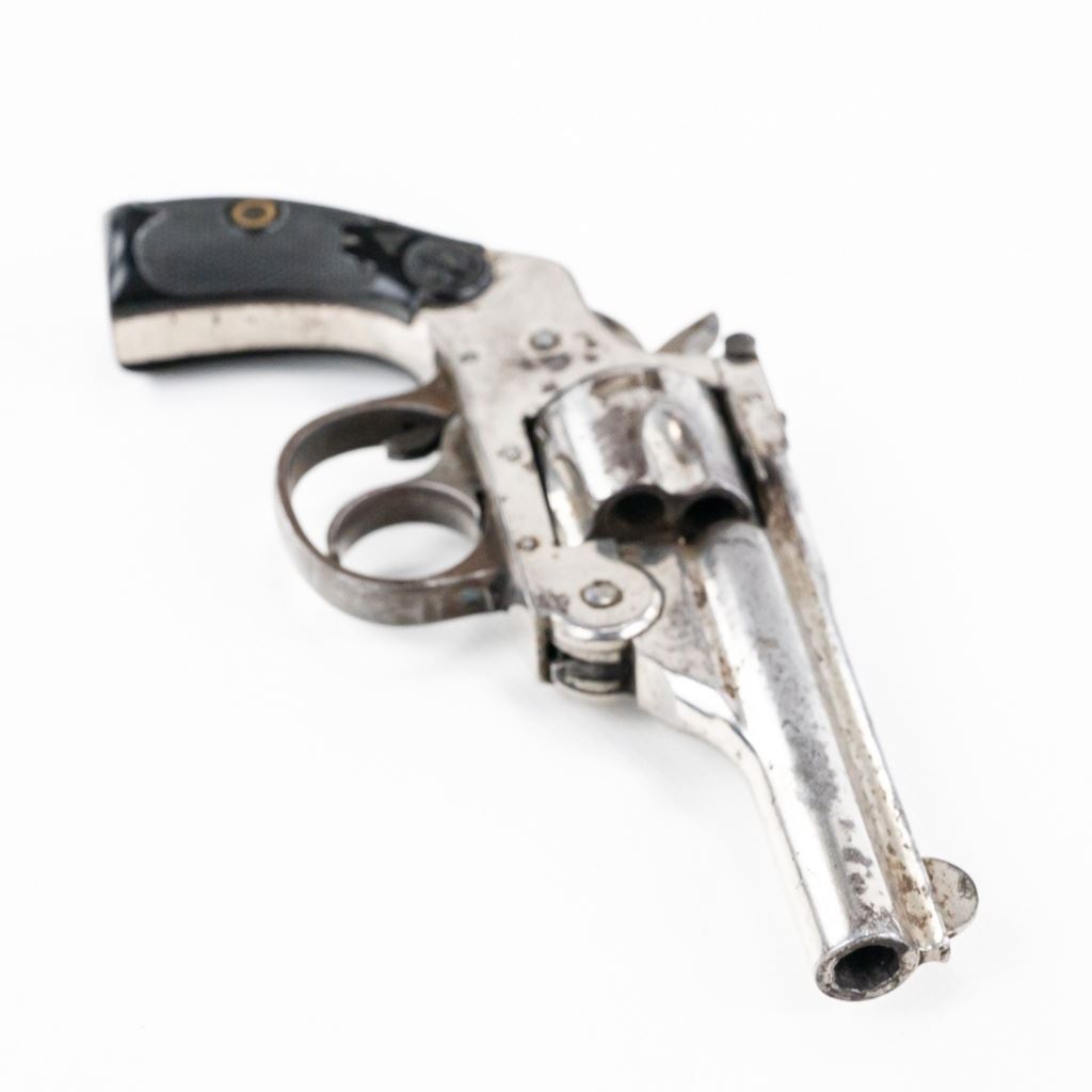 Thames Arms Co. Top Break Revolver .32S&W A top break double action revolver by the Thames Arms Company of Norwich, CT. and chambered for .32 S&W. Revolver features a 3" barrel with top break action and DA/SA trigger. Top of barrel has 2 line company address. Nickel finish is in overall fair condition with some flaking and oxidation/rust where finish is absent. Hard rubber grips are in good condition with no chips or cracks. Bore is somewhat shiny with strong rifling though lightly pitted throughout. Top strap lock is solid and cylinder play is minimal when trigger is pulled. Ejector does not reset upon fully opening revolver. See photos. C&R eligible firearm, requires C&R or FFL for shipping.
