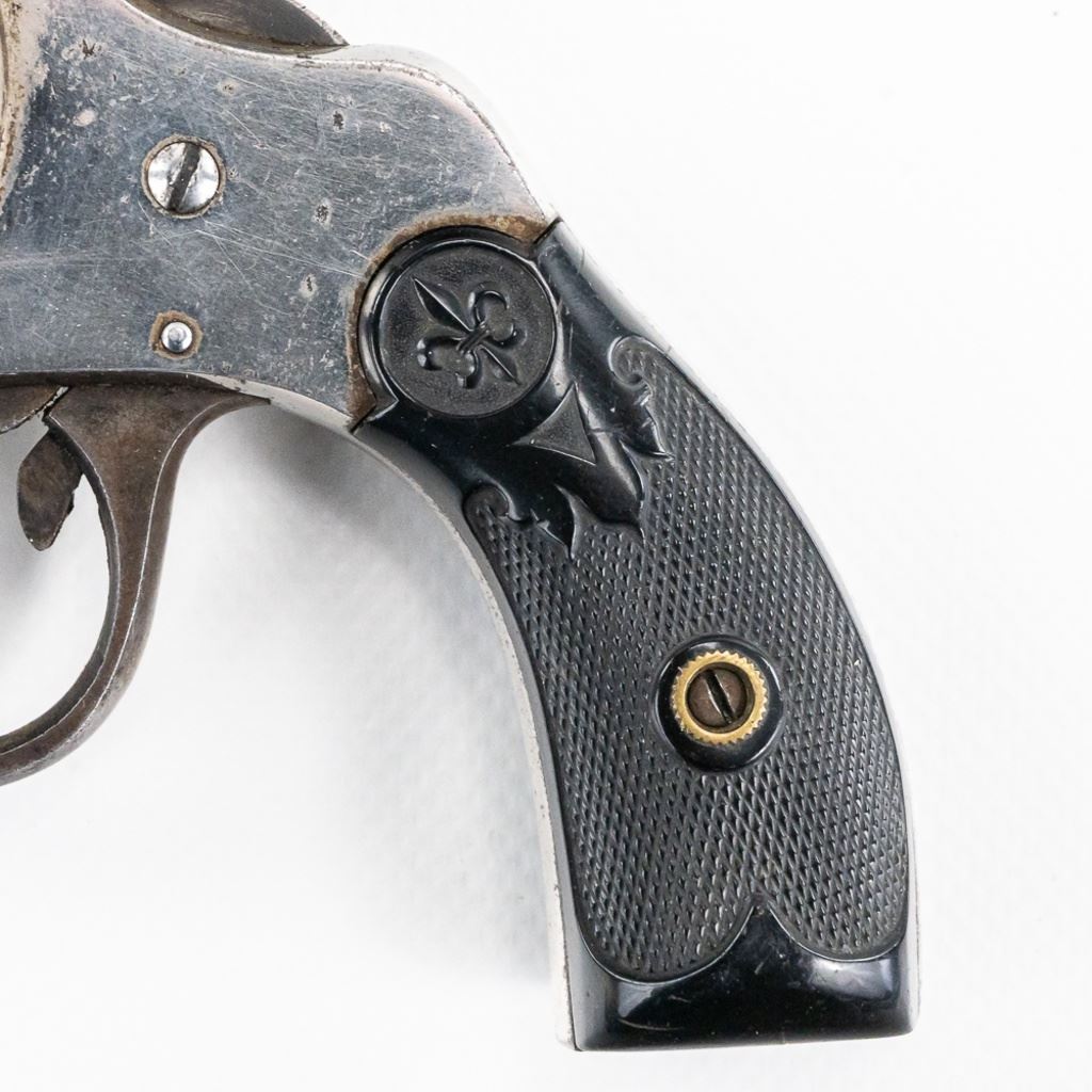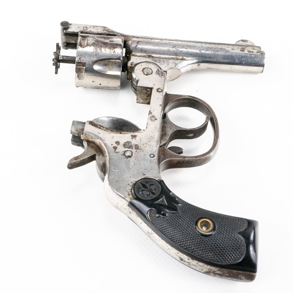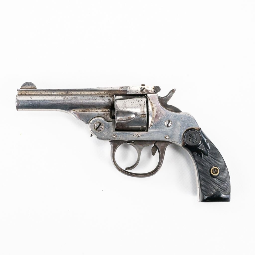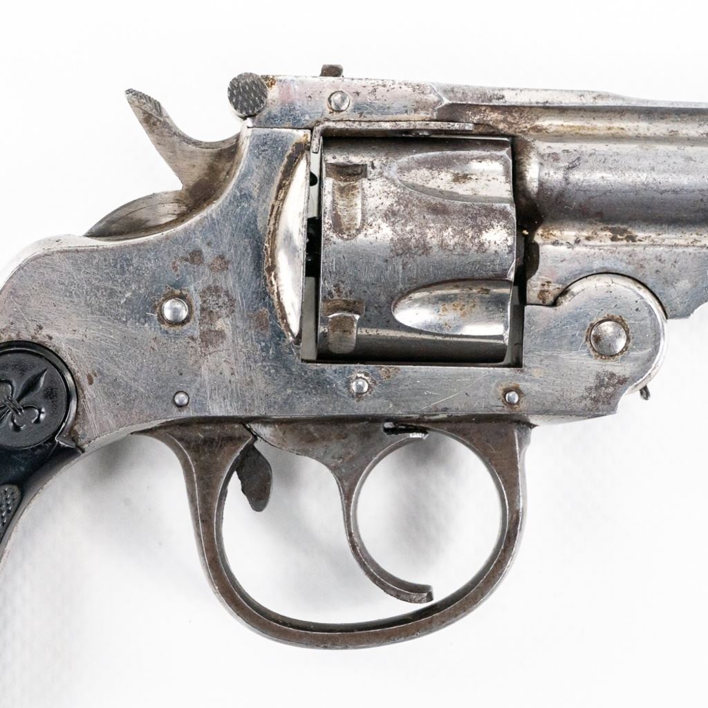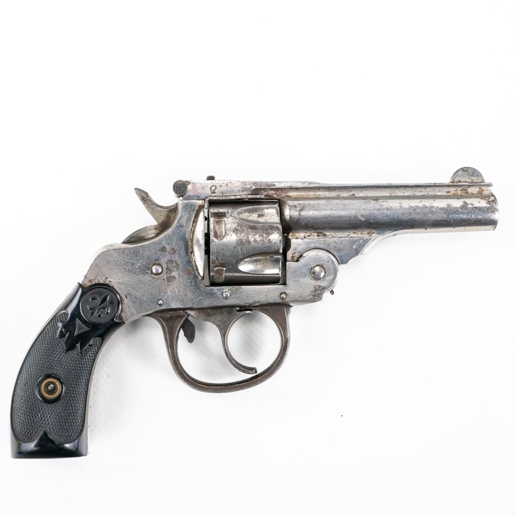 Thames Arms Co. Top Break Revolver .32S&W A top break double action revolver by the Thames Arms Company of Norwich, CT. and chambered for .32 S&W. Revolver features a 3" barrel with top break action and DA/SA trigger. Top of barrel has 2 line company address. Nickel finish is in overall fair condition with some flaking and oxidation/rust where finish is absent. Hard rubber grips are in good condition with no chips or cracks. Bore is somewhat shiny with strong rifling though lightly pitted throughout. Top strap lock is solid and cylinder play is minimal when trigger is pulled. Ejector does not reset upon fully opening revolver. See photos. C&R eligible firearm, requires C&R or FFL for shipping.