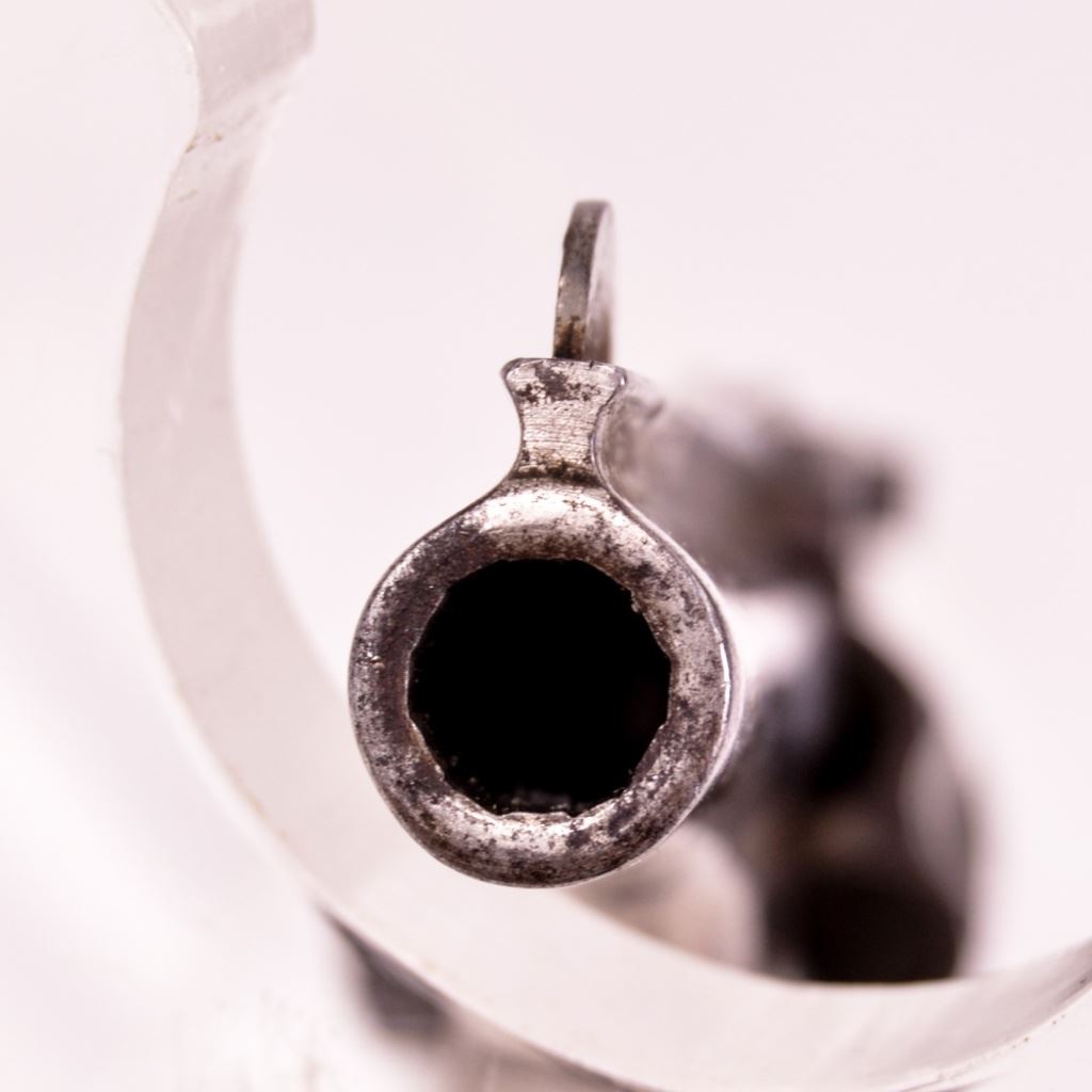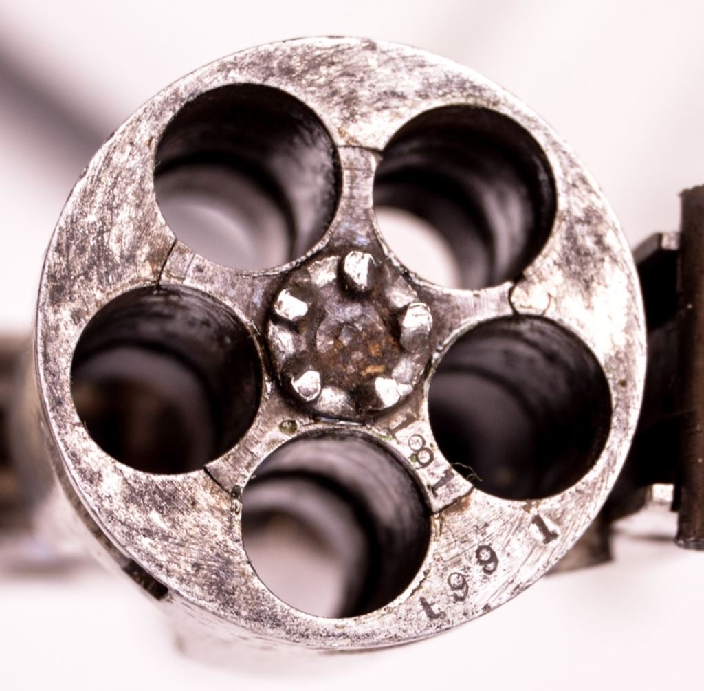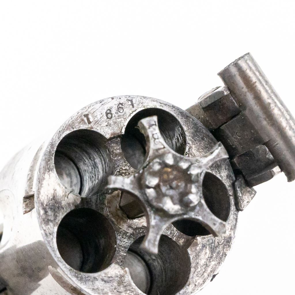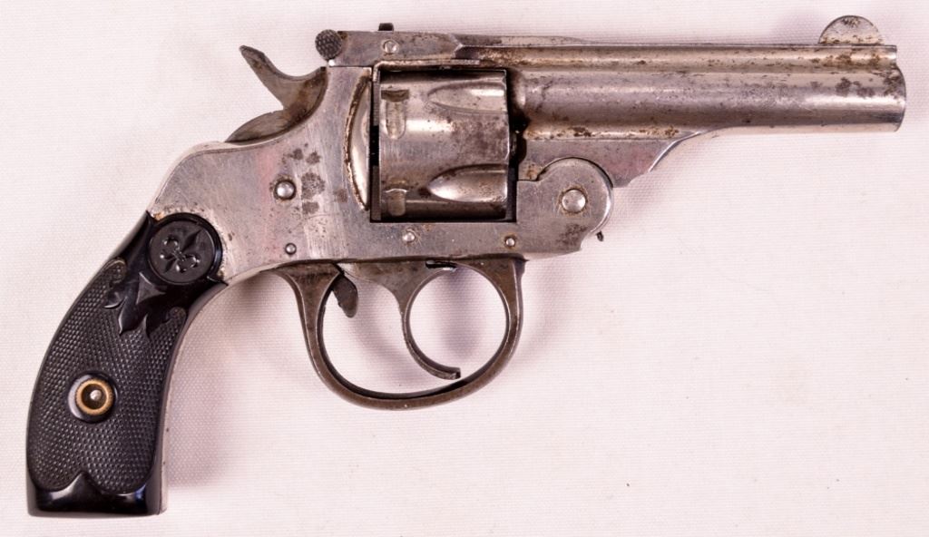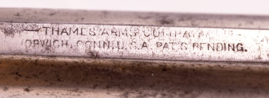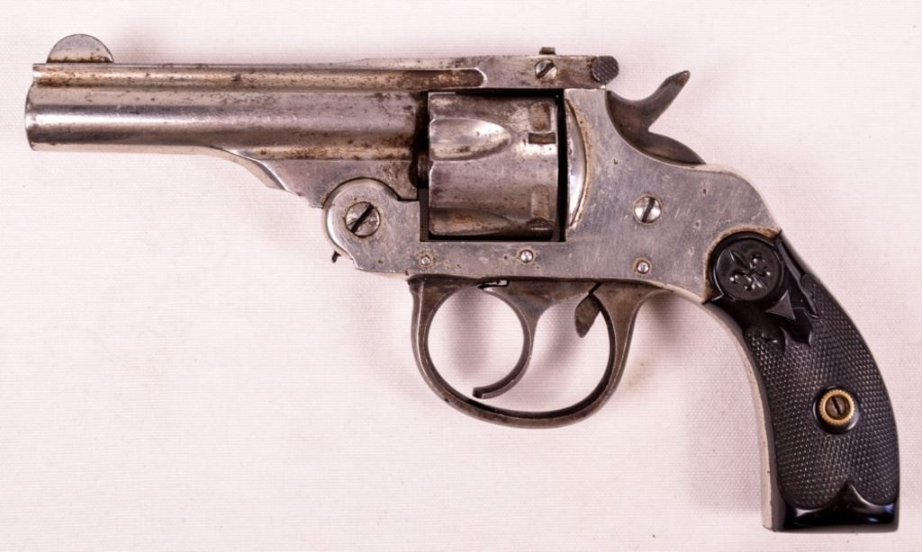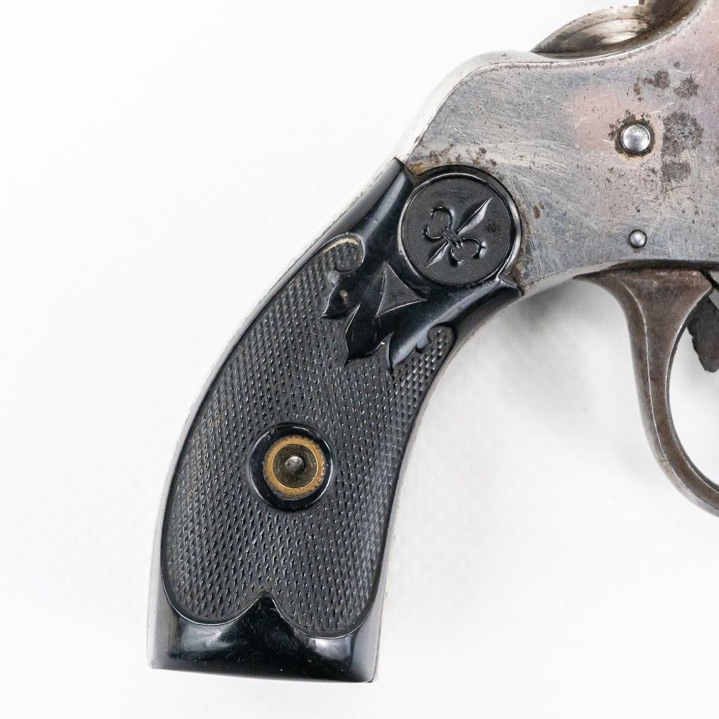 Thames Arms Co. Top Break Revolver .32S&W A top break double action revolver by the Thames Arms Company of Norwich, CT. and chambered for .32 S&W. Revolver features a 3" barrel with top break action and DA/SA trigger. Top of barrel has 2 line company address. Nickel finish is in overall fair condition with some flaking and oxidation/rust where finish is absent. Hard rubber grips are in good condition with no chips or cracks. Bore is somewhat shiny with strong rifling though lightly pitted throughout. Top strap lock is solid and cylinder play is minimal when trigger is pulled. Ejector does not reset upon fully opening revolver. See photos. C&R eligible firearm, requires C&R or FFL for shipping.
